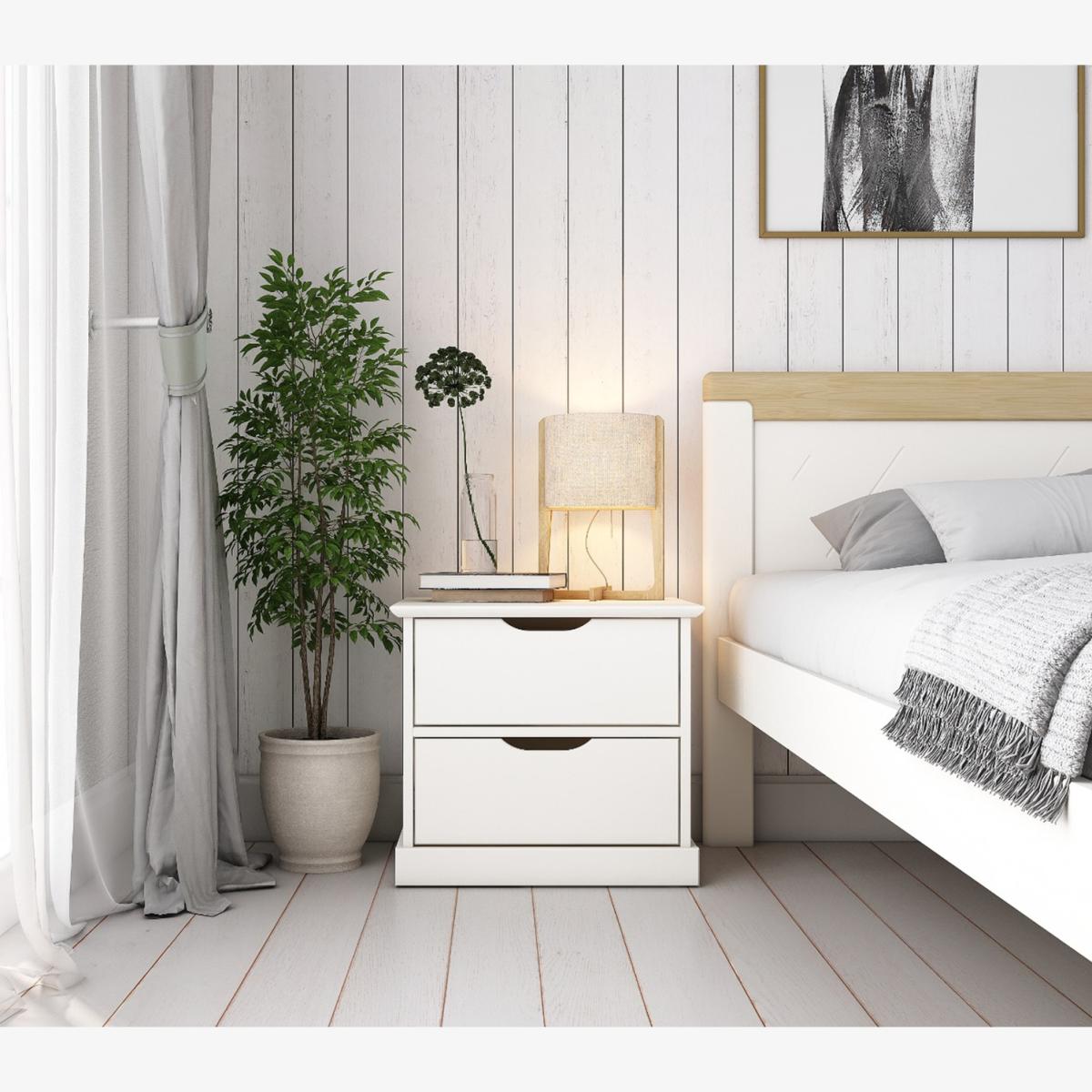The Aponi is a beautifully crafted modern bedroom collection with the Pine being coated with a non-toxic, eco-friendly water-based paint in a cool white option. This graceful nightstand is an easy way to spruce up your bedroom as it will easily match your theme with its neutral colours. Featured are 2 deep drawers which can be used for storing various personal items and a large enough area on top for your alarm clock or nightstand lamp. Noomi uses only ethically sourced Solid Scandinavian pine, which grows straighter, stronger and with fewer knots due to the cold atmosphere in the Nordic regions.