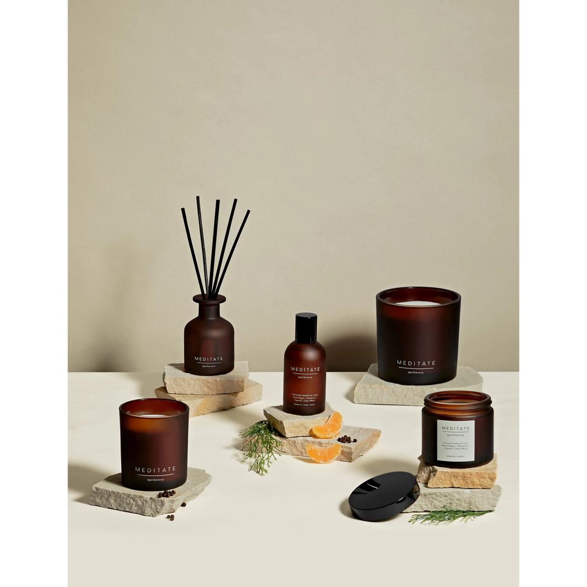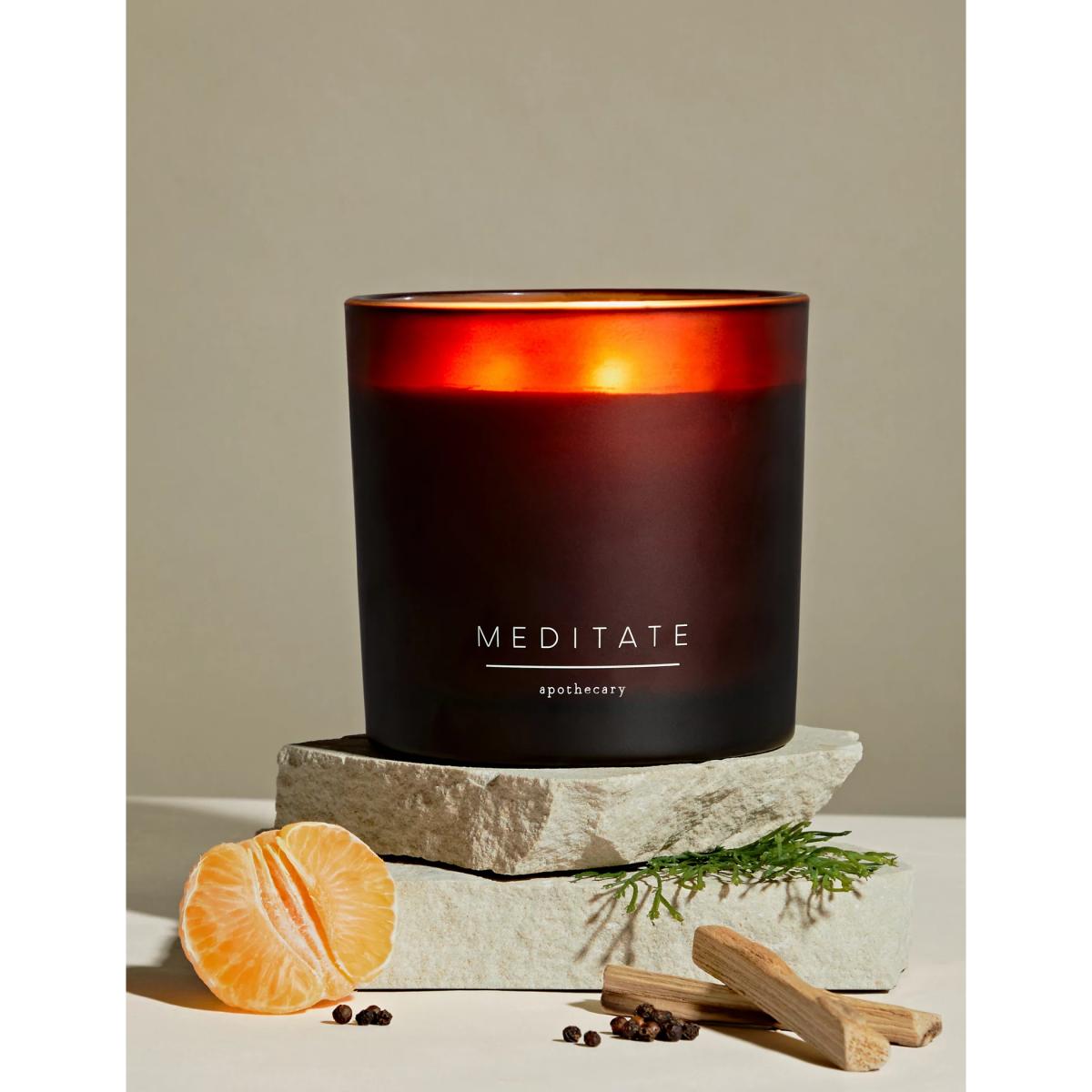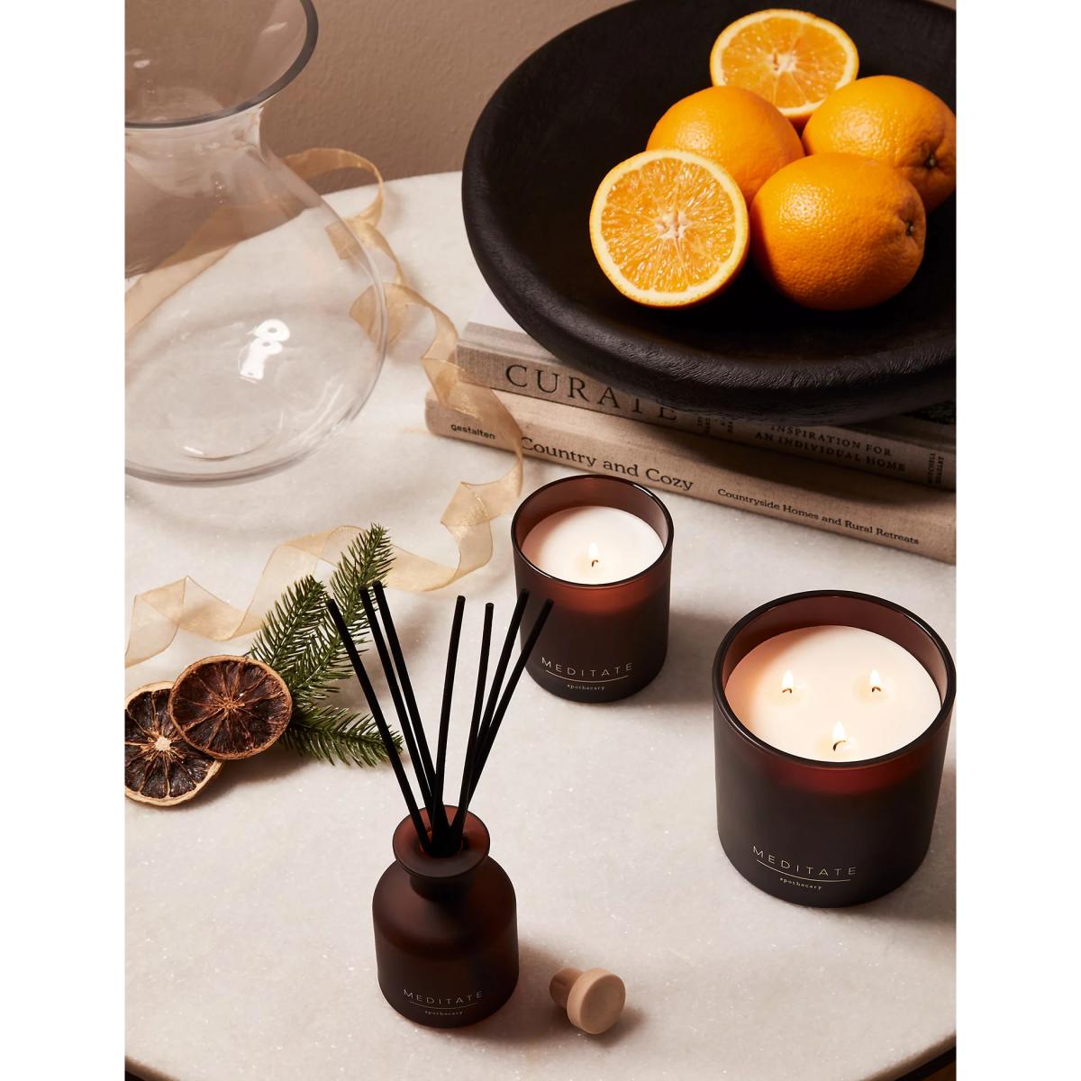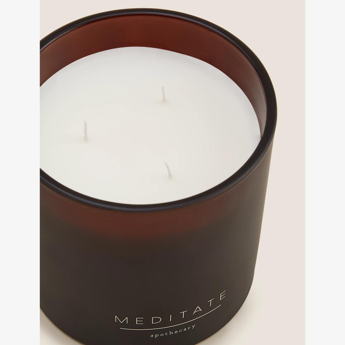 Create a calming atmosphere with this Meditate candle from our Apothecary collection. A meld of black pepper, mandarin, cypress and cedarwood essential oils help to bring a sense of peace and relaxation to your home. It's housed in a dark glass jar with three wicks for a bright glow. This fragrance is part of the Amber family of fragrances. Amber scents are rich and warming and may contain notes such as vanilla, pepper, tonka bean and amber.