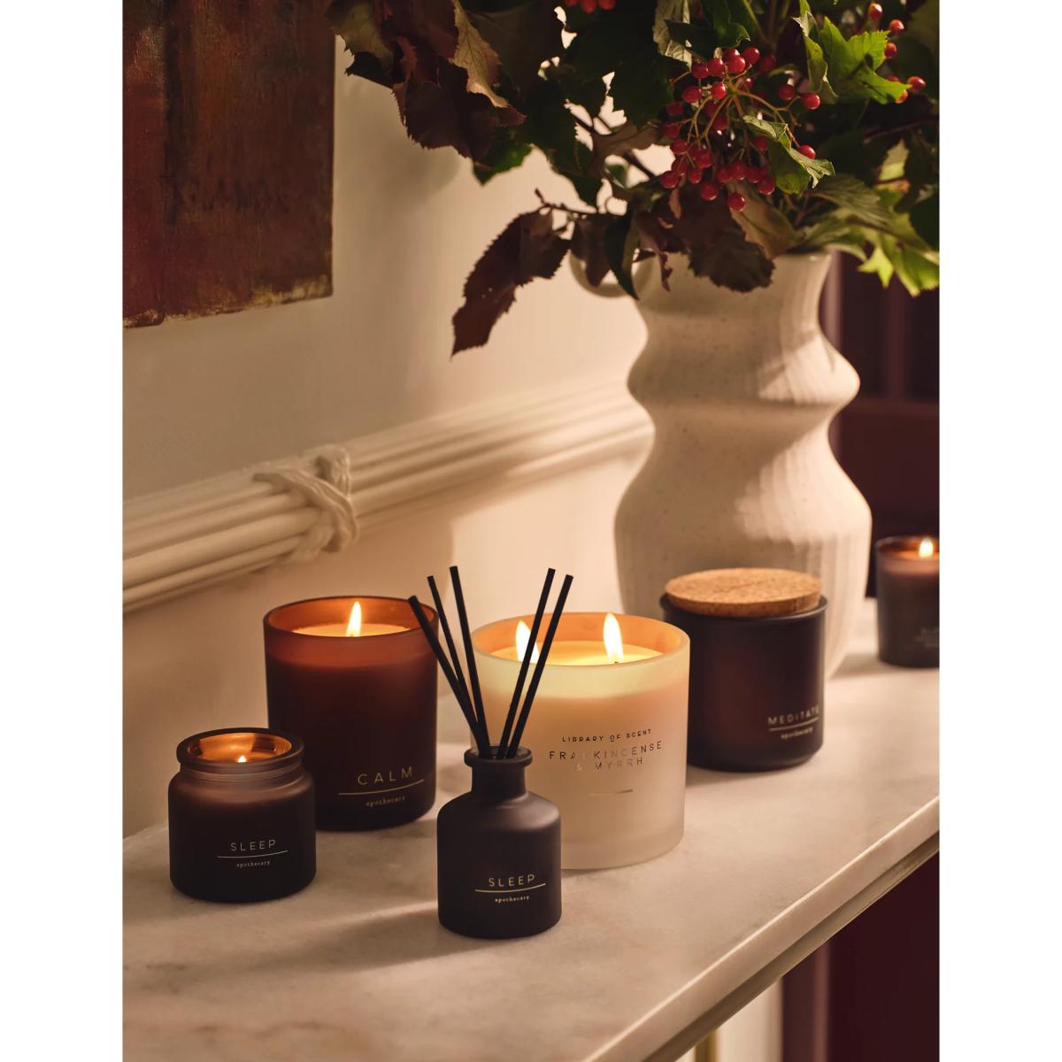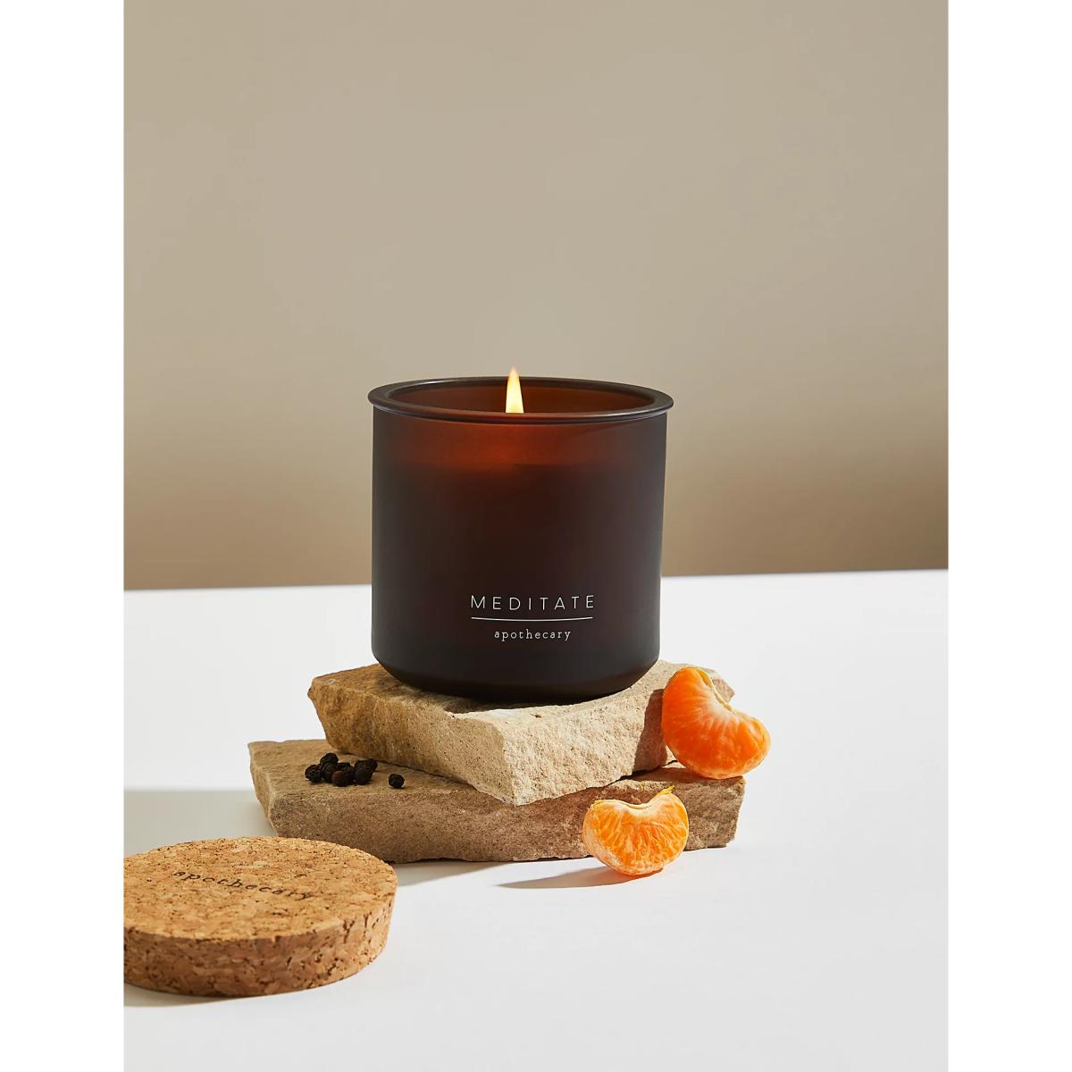 Channel your inner peace with this Meditate candle from our Apothecary range. Infused with essential oils of black pepper, mandarin, cypress and cedarwood, it releases a relaxing scent. The candle holder is designed to be refilled with one of our candle refills when finished. This fragrance is part of the Amber family of fragrances. Amber scents are rich and warming and may contain notes such as vanilla, pepper, tonka bean and amber.
