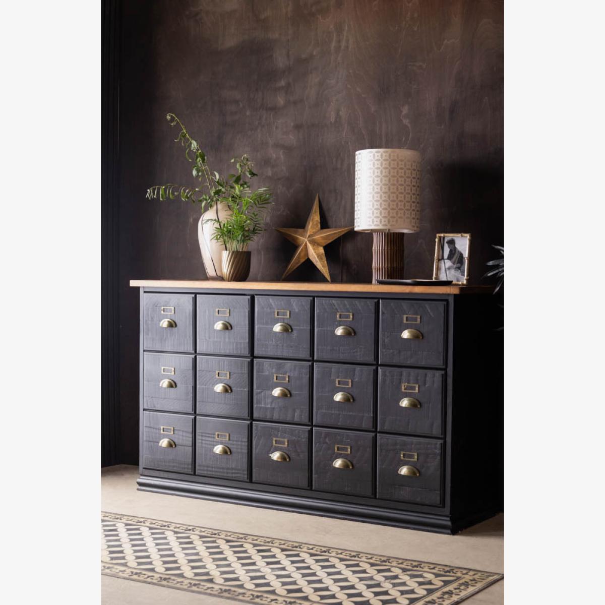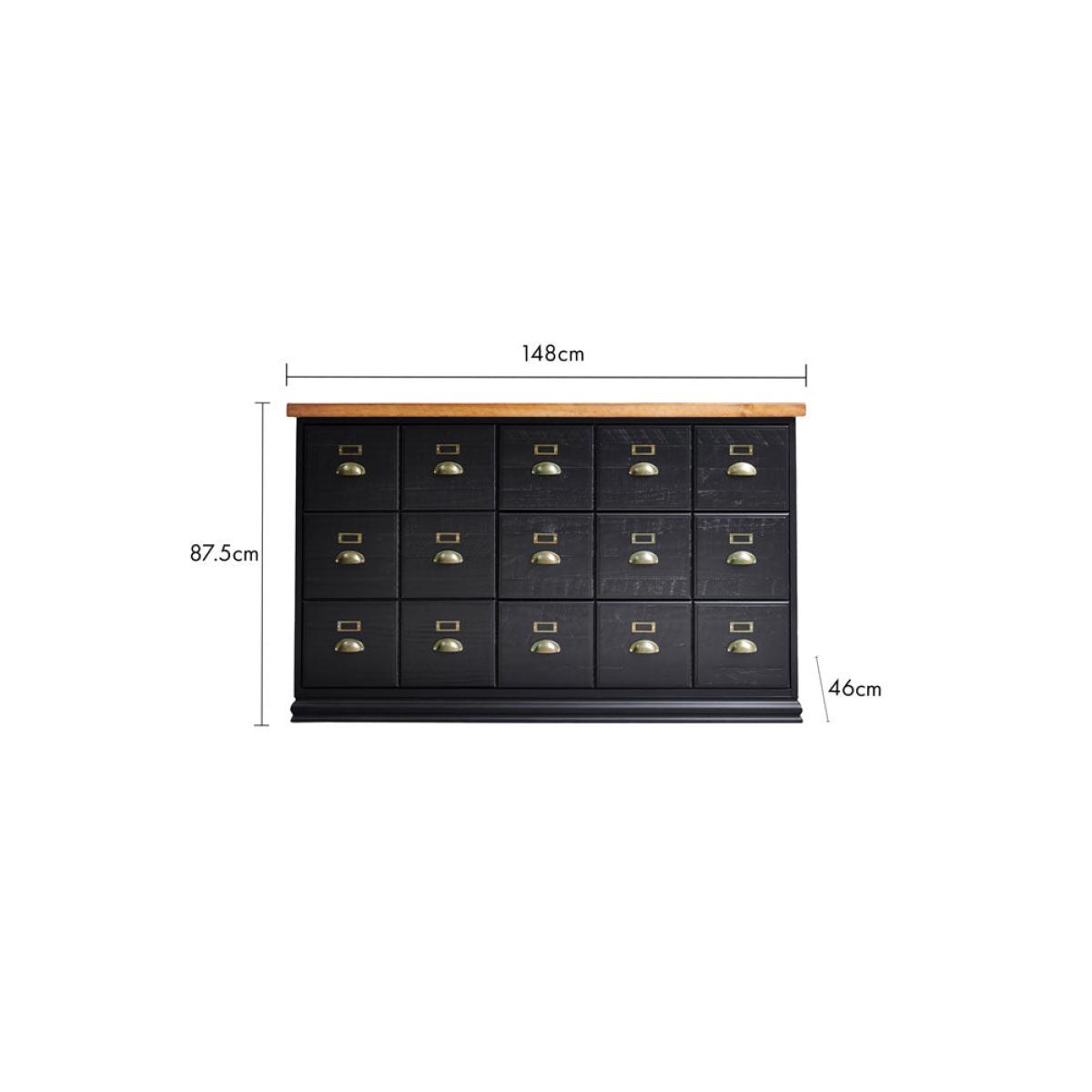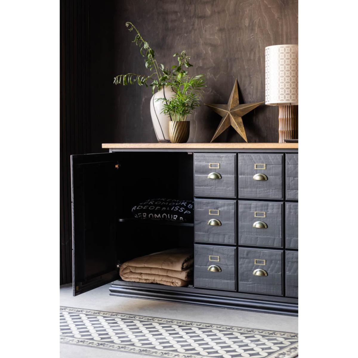 Designed to look like a stunning set of drawers, this actually houses a cleverly designed, roomy cupboard, alongside nine drawer spaces that are perfect for tidying away all your essentials. Crafted from stained black wood with a natural wood top, this is Victorian apothecary-style chic at its best, and gives what could be an otherwise bland, everyday piece a vintage twist. It marries beauty with practicality in a way that only RSG can, and is destined to become a talking point in your home for all the right reasons. It’s certainly a forever piece that will be beloved for generations to come, not least because it’s so fabulously functional. Use in the kitchen for placemats, table linen and serveware, while in the bedroom it’s perfect for make-up, hair accessories and jewellery. In the hallway, it’s your go-to for hats, scarves and gloves. Style with greenery, a lamp, a mirror, vases in varying heights and your favourite trinkets to create a shelf-scape to be proud of, then stand back and admire your efforts. We promise this is one piece of furniture that will never disappoint! - Apothecary Sideboard - Measures:H87.5cm x W148cm x D46cm