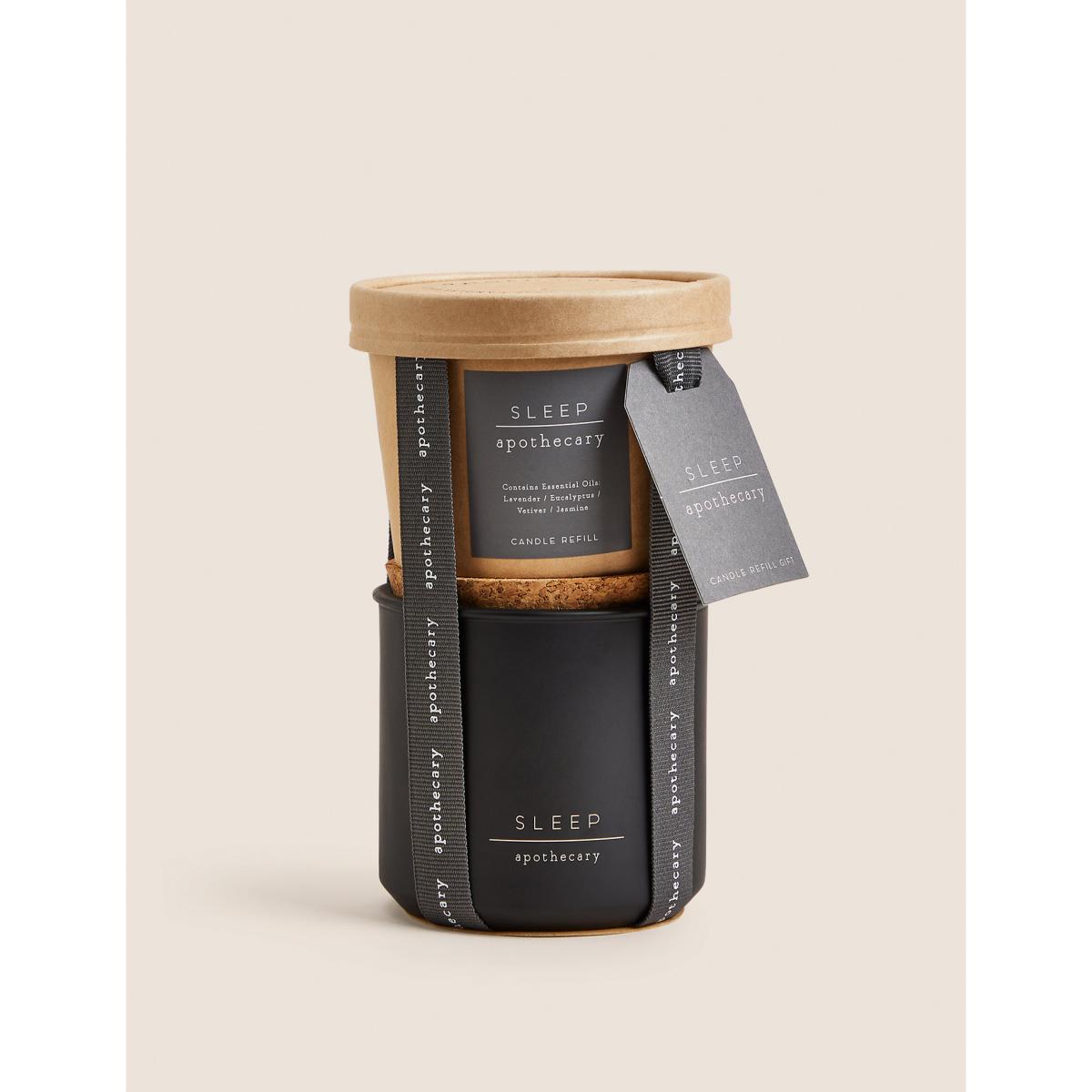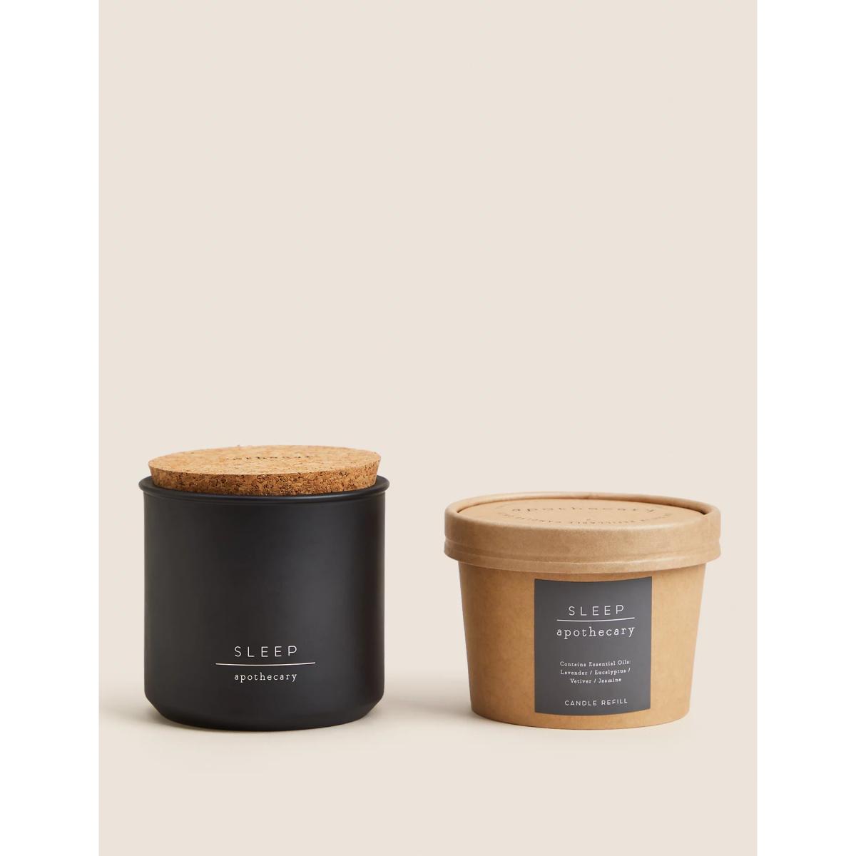 Treat yourself to a calm and tranquil atmosphere with the Sleep candle and refill set from our Apothecary collection. The fragrance combines notes of lavender and eucalyptus with hints of jasmine and vetiver, for a peaceful, uplifting feel. A cork lid seals the jar to preserve the scent between uses. This fragrance is part of the Herbal family of fragrances. Herbal scents are often considered to have soothing and relaxing qualities and may contain notes such as lavender, cedar wood, vetiver or eucalyptus.