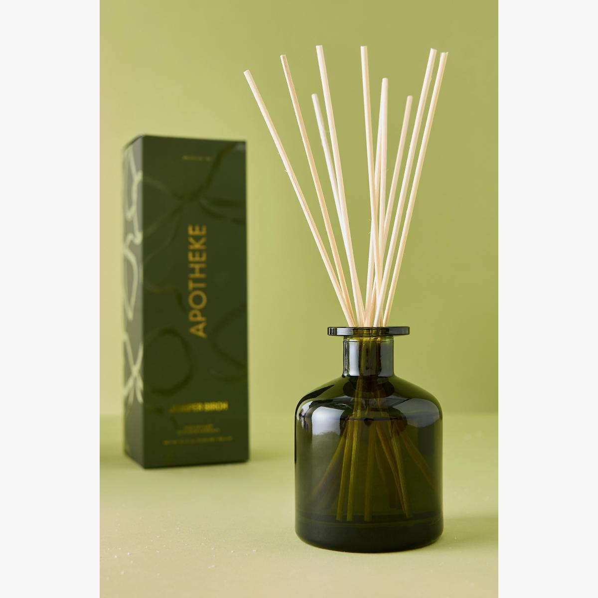 **Juniper Birch (Aromatic):** Juniper Birch enchants with the nostalgic scents of the holiday season. Crisp juniper berry and fresh fir balsam are accentuated by spicy white pepper and clove while warm woodsmoke, birchwood, and a hint of amber add depth. Top Notes: Juniper Berry, White Pepper, Mint, Woodsmoke Middle Notes: Birchwood, Clove, Cinnamon, Fir Balsam Bottom Notes: Burning Birch, Cedarwood, Amber, Sandalwood * By Apotheke * Crafted with essential and perfume-grade fragance oils * Scent lasts for 3-4 months * Includes 10 all-natural rattan reed sticks * Cruelty-free * Glass vessel * Made in USA **How To Use:** * Always use on a stable surface. Carefully remove the bottle plug, untie the diffuser reed sticks bundle, and place reeds into bottle. As the oil is absorbed by the reeds, fragrance will begin to diffuse. Flip the reeds weekly or as desired to intensify fragrance diffusion.