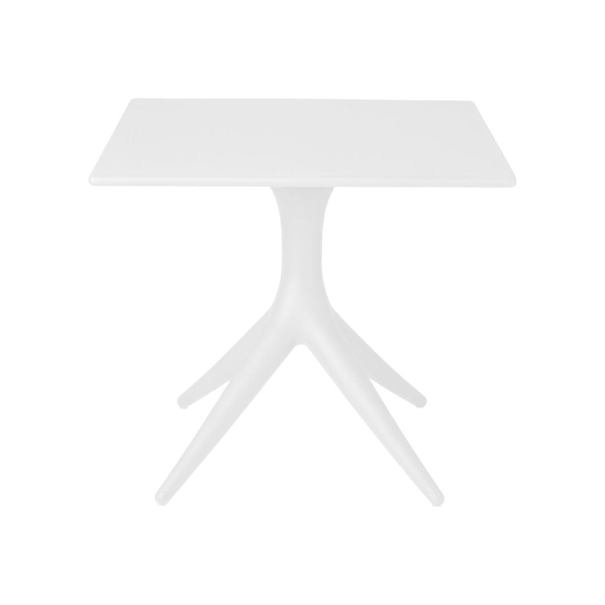 The small table APP, mainly intended for outdoor use, is ideal for versatile wide functions. Slender and sophisticated, it has a square top and four legs that converge at the top of the frame, enhancing the table with extreme lightness. Produced in rotational plastic, it is available in the variants anthracite grey and white.
