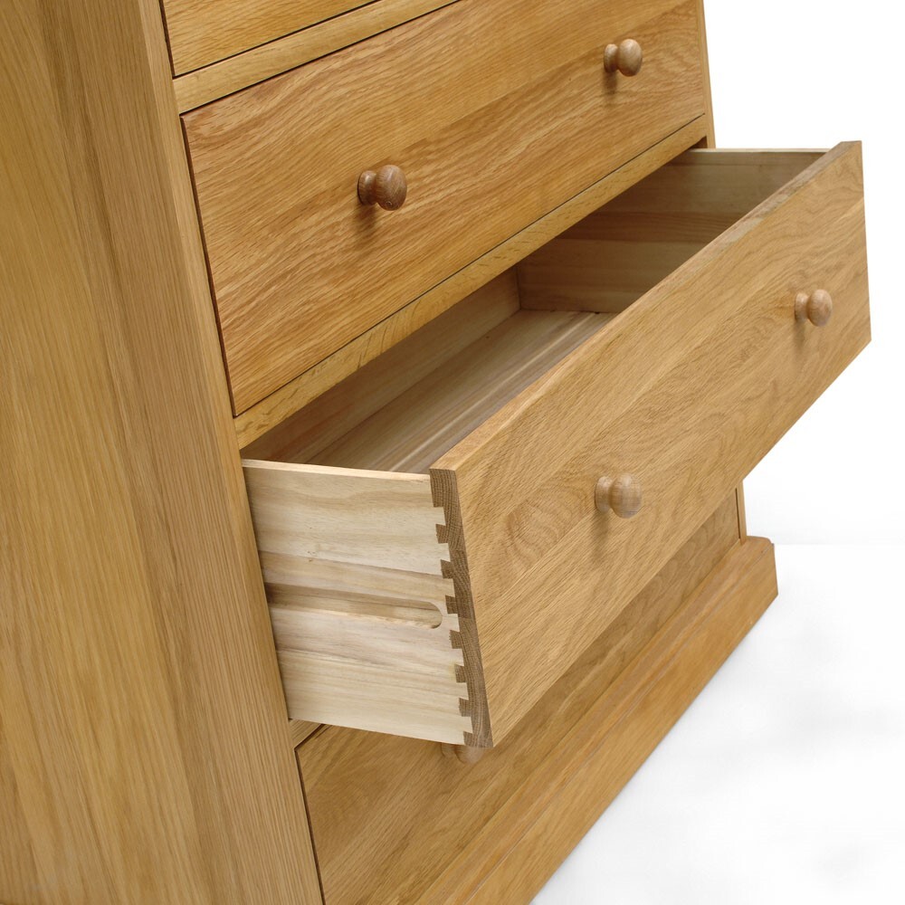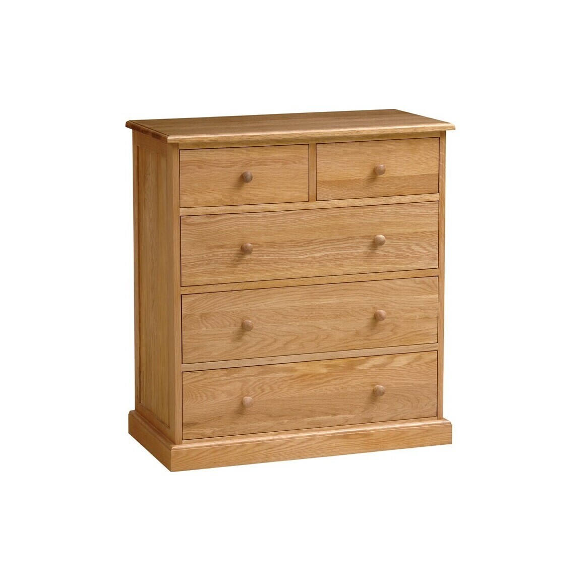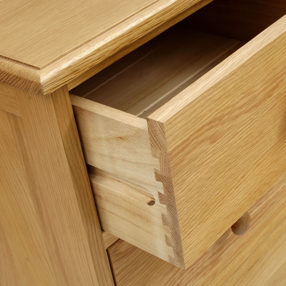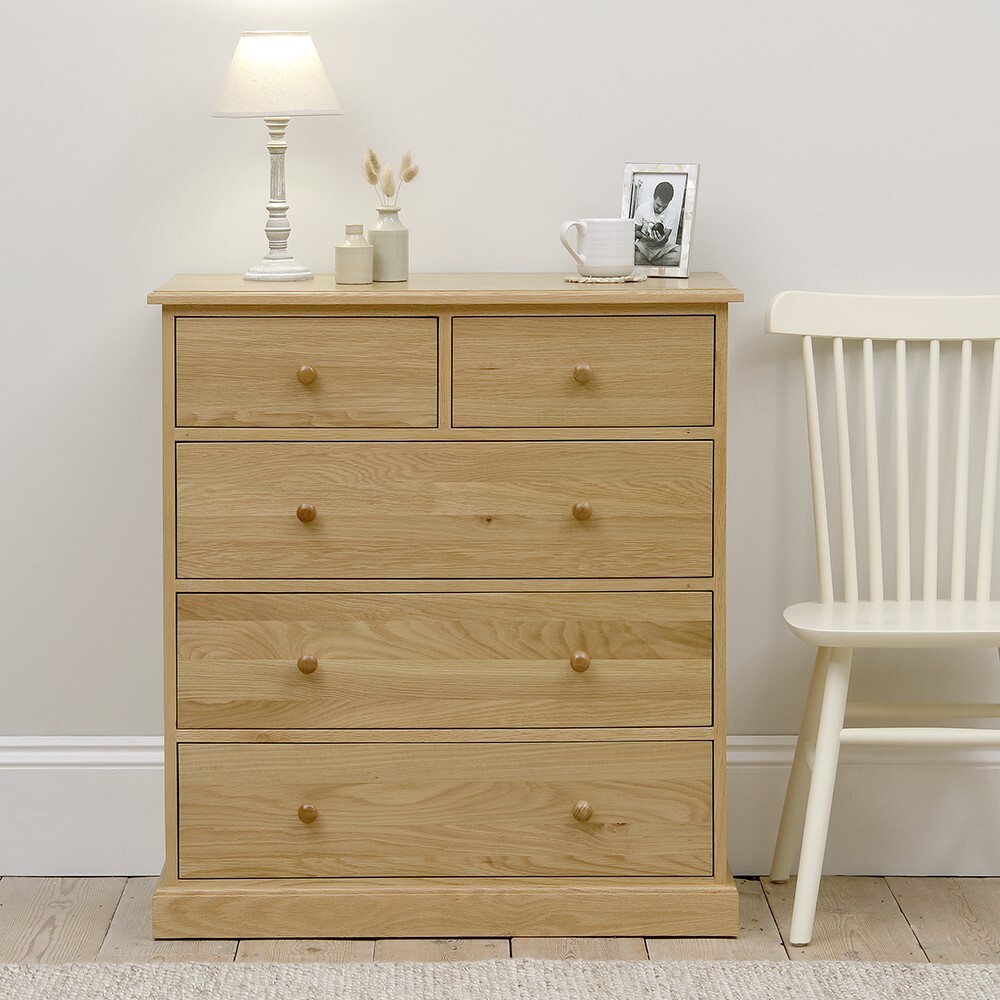 This chest of drawers offers ample storage space within its simple yet elegant design, this lovely chest will serve your family for years to come. With two smaller drawers at the top and three wider drawers below, it's a versatile piece which will complement both contemporary and traditional decors. Classic dovetail joinery provides strength and durability, and the chest is finished with a clear lacquer to resist scuffs and knocks and preserve the colour.