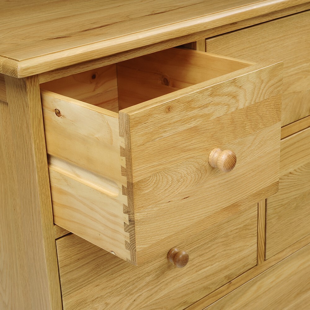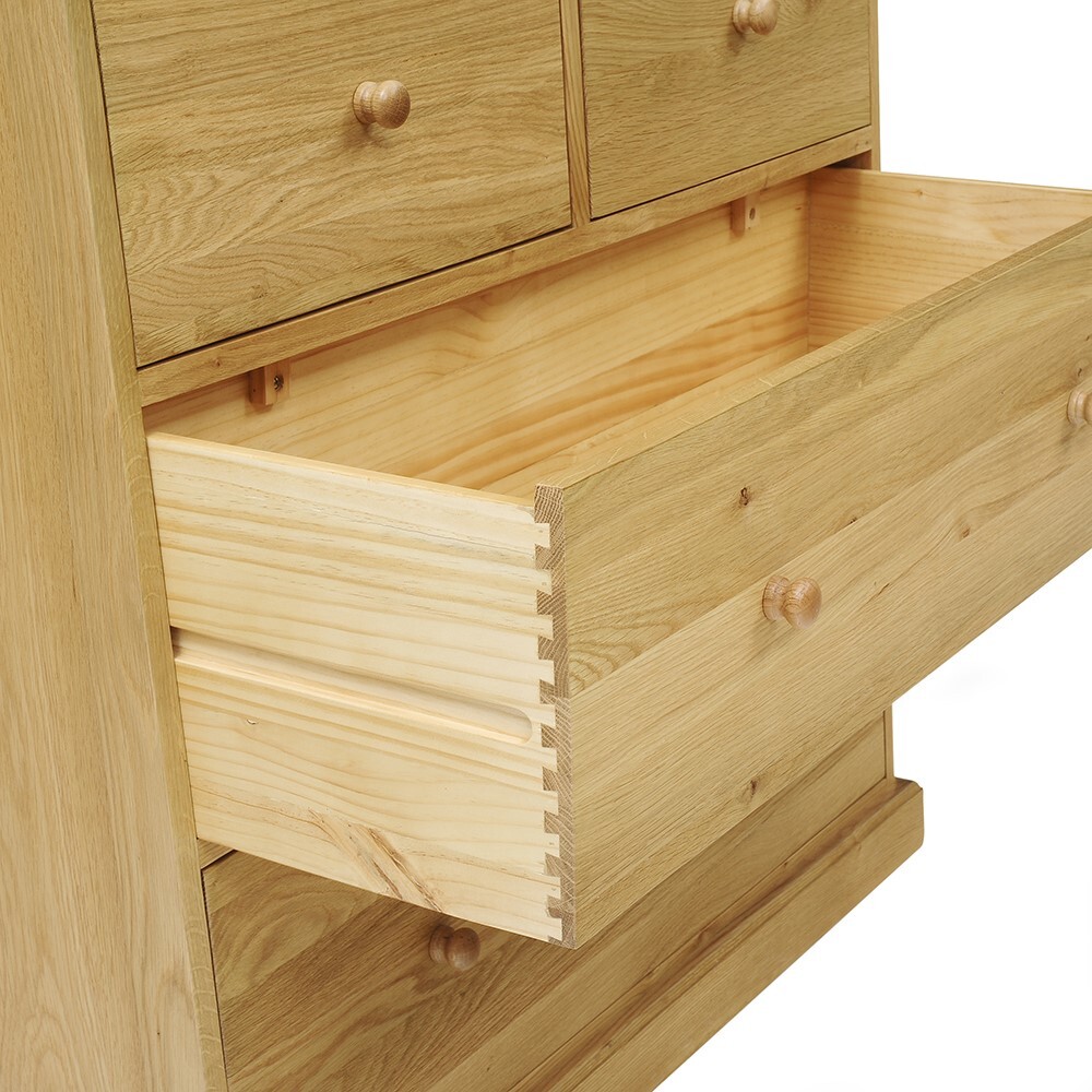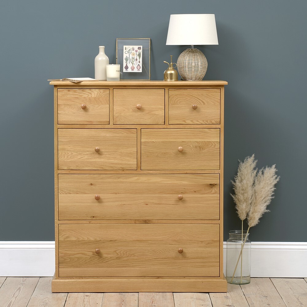 This chest of drawers offers ample storage space within its simple yet elegant design, this lovely chest will serve your family for years to come. With three smaller drawers at the top and four larger drawers below, it's a versatile piece which will complement both contemporary and traditional decors. Classic dovetail joinery provides strength and durability, and the chest is finished with a clear lacquer to resist scuffs and knocks and preserve the colour.