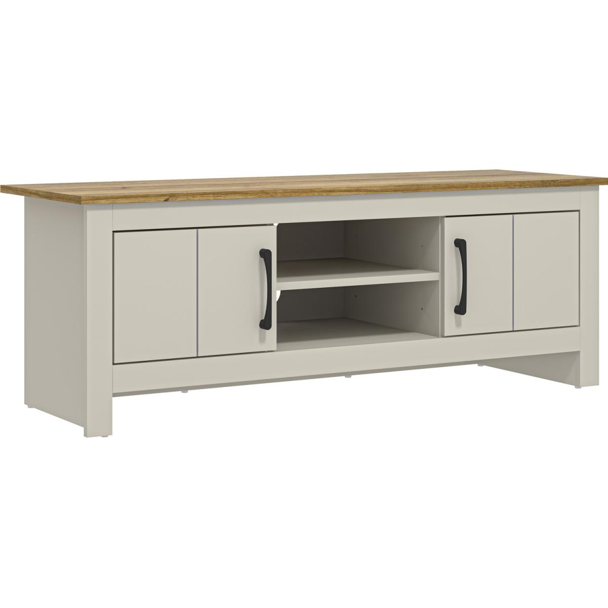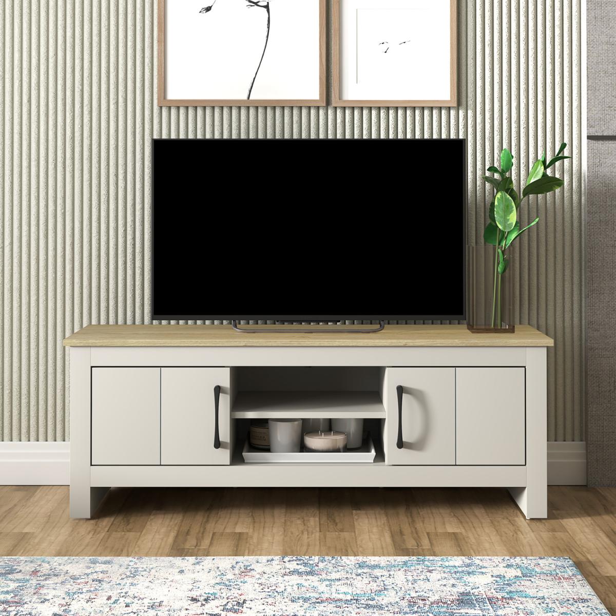 A minimalist TV stand makes a pleasant focal point in your living room and works well with many different home design aesthetics. many compartments, an open shelf, and two doors. Game consoles, projectors, books, pictures, decorations, and other items may all be stored on the open shelf while maintaining an organised appearance. Your living area will seem elegant and sophisticated with our limestone TV unit. This will brighten the ambiance in your room. This TV stand is built to last and is simple to clean thanks to the sturdy produced wood used in its construction. The additional stability and robustness of a TV cabinet with storage space is provided without sacrificing beauty. Simple, aesthetically beautiful design that is offered in a variety of colours to fit your home's decor.