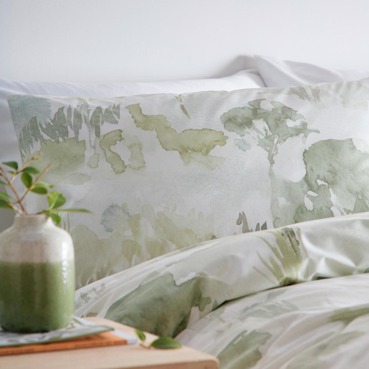 A gorgeous, soft green, watercolour effect landscape pattern adorns this stunning bedding set which has been specially finished to create an amazingly soft feel to this relaxed look fabric. This bedding also features a contrast piping around the edges for premium finish. This item carries the STANDARD 100 by OEKO-TEX logo, which means you can be certain that every component has been tested for harmful substances and is therefore harmless to human health. Fabric finish: printed. 100% cotton. 144 thread count. Set includes 1 duvet cover and 2 pillowcases. Bed size: king size. Length 200cm, Width 230cm. Buttons for fastening. Standard pillowcase (s). Pillowcase length 75cm, Width 50cm. Machine washable. Suitable for tumble drying.