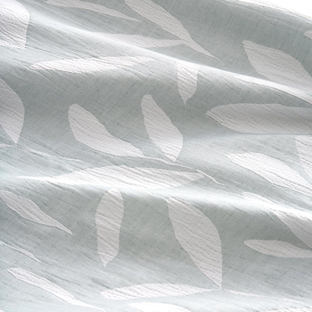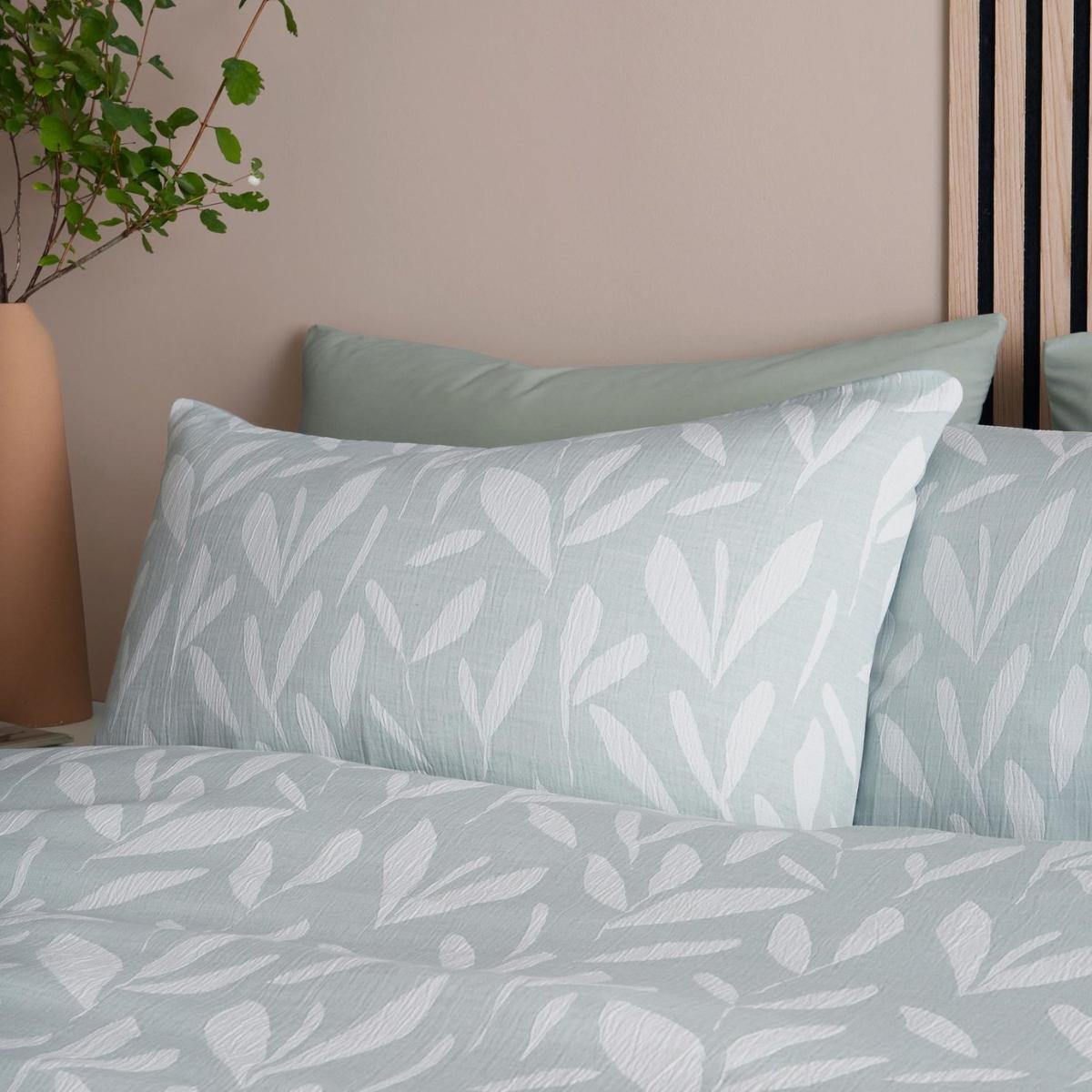 Meet Emile, the duvet cover set that's all about embracing modern design with a sustainable twist. A contemporary leaf jacquard pattern, crafted in a soothing green base. It's like bringing a breath of fresh air into your bedroom. Plus, the contrasting green reverse adds a fun, versatile pop to your space. Imagine wrapping yourself in soft, breathable fabric, without compromising on style. It's the perfect blend of boho chic, modern sophistication, and a touch of eco-friendly charm. This item carries the STANDARD 100 by OEKO-TEX logo, which means you can be certain that every component has been tested for harmful substances and is therefore harmless to human health. Fabric finish: jacquard. 100% polyester. 50% recycled polyester, 50%cotton. Set includes 1 duvet cover and 2 pillowcases. Bed size: king size. Length 220cm, Width 230cm. Jacquard panel. Poppers for fastening. Standard pillowcase (s). Pillowcase length 75cm, Width 50cm. Machine washable. Suitable for tumble drying.