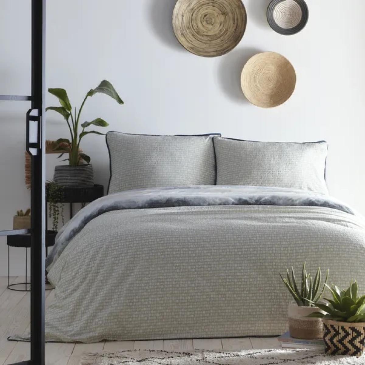 I love the soft seafoam tones of this bed set; they bring a calming, coastal feel that works well in both contemporary and relaxed boho interiors. Its subtle pattern makes it an easy choice for layering with textured throws or cushions in neutral shades or natural fibres, allowing you to create a soothing, inviting environment. Practical styling tips include pairing it with crisp white sheets for a fresh look or adding darker accent cushions to introduce contrast. It also works beautifully in bedrooms with botanical or maritime themes, where the gentle colours can complement natural materials like wood or rattan. Overall, it’s a versatile option that adds a touch of understated sophistication to any bedroom setting.