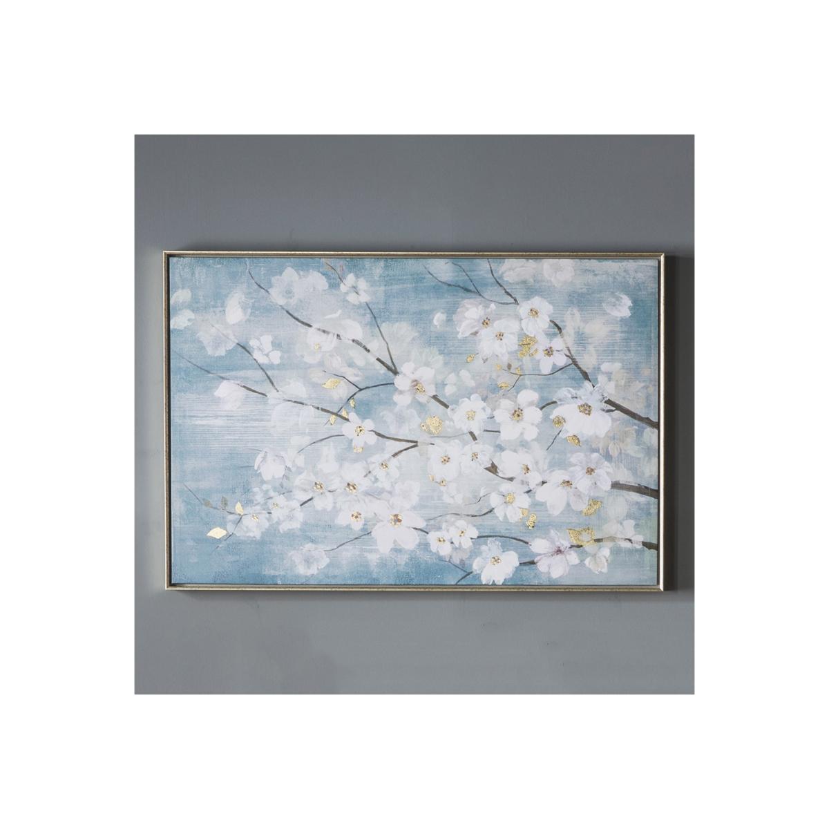 The April white blossom tree print is set on a brushed blue background features extra metallic gold foiling detail and is complete in an aged gold frame.
