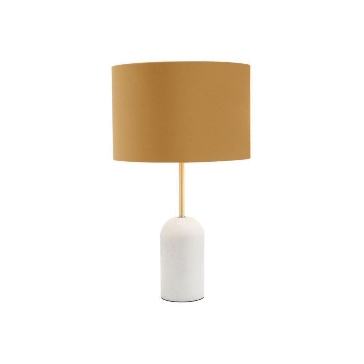 Inspired by a classic contemporary design of the cylindrical shade, the Ara table lamp will never go out of style. Available in an array of colours, finished with gold lining around the inside, this Ara features a rich mustard velvet hue. Made from metal and complete with chic white marble base, the curved shade allows for optimal lighting in a stylish design. Perfect for dining rooms, hallways, living rooms, and bedrooms.