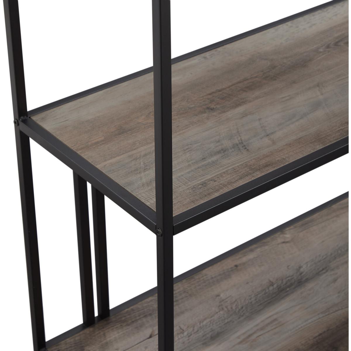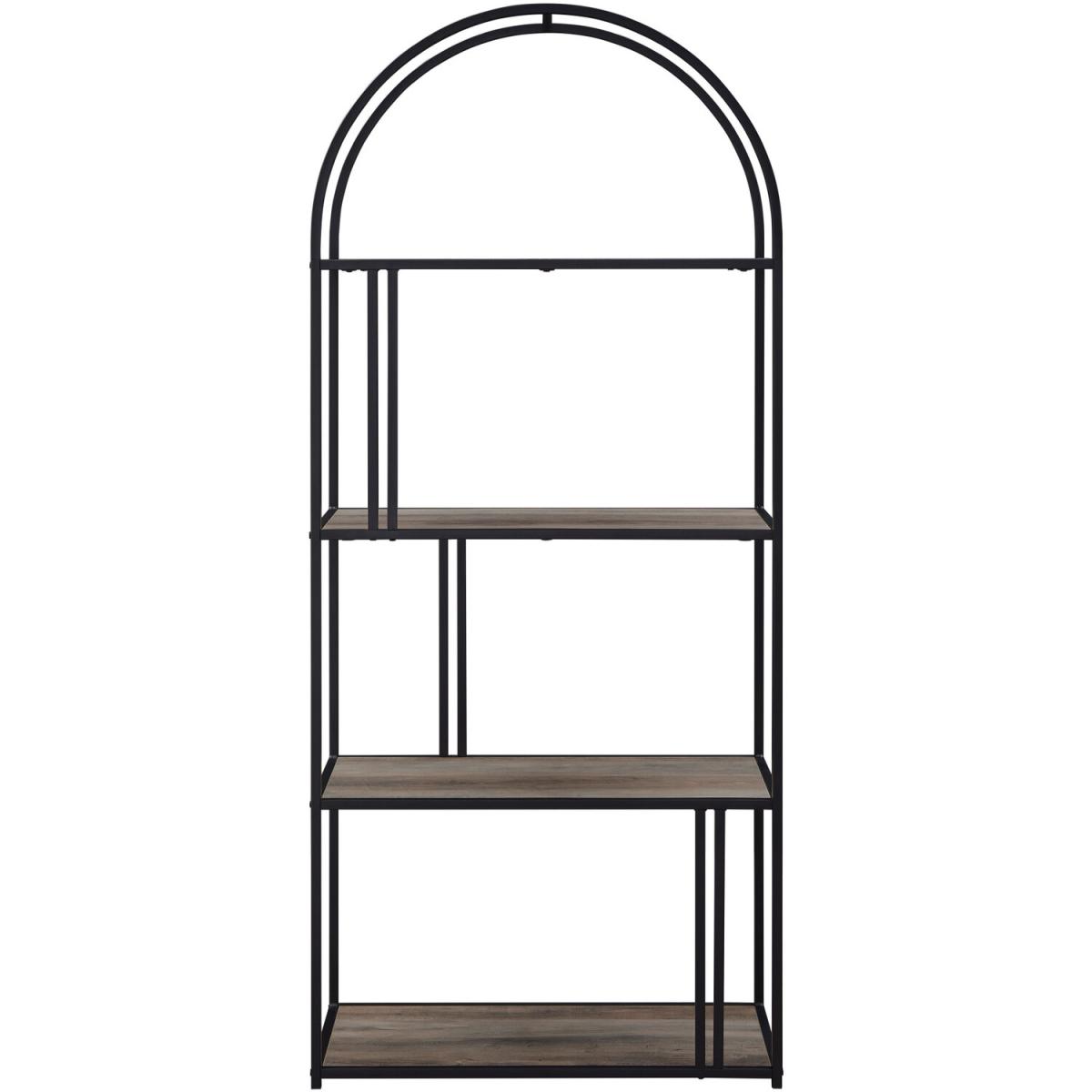 Be the master of your very own modern library with the help of this metal arch bookshelf. Asymmetrical shelving and a sweeping metal, arched frame lend an ultra-contemporary feel to any room that is longing for an easy style upgrade. Place it in the entryway of your city apartment, home office, or the dining room of your family home, and watch your space's cool factor instantly skyrocket. Four fixed shelves in grey wash wood effect with sanded black metal frame offer virtually endless display realty, so you can show off framed photos, ceramic souvenirs, or keepsakes in sleek, urban industrial-inspired fashion. Comprised of warp-resistant MDF and long-wearing laminate, this piece is sure to make a statement in any alcove of your home for years to come.
