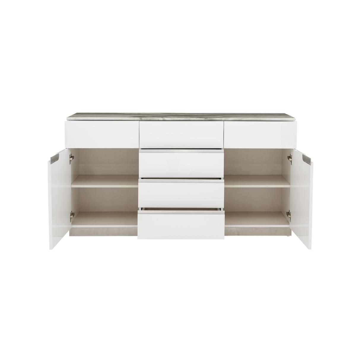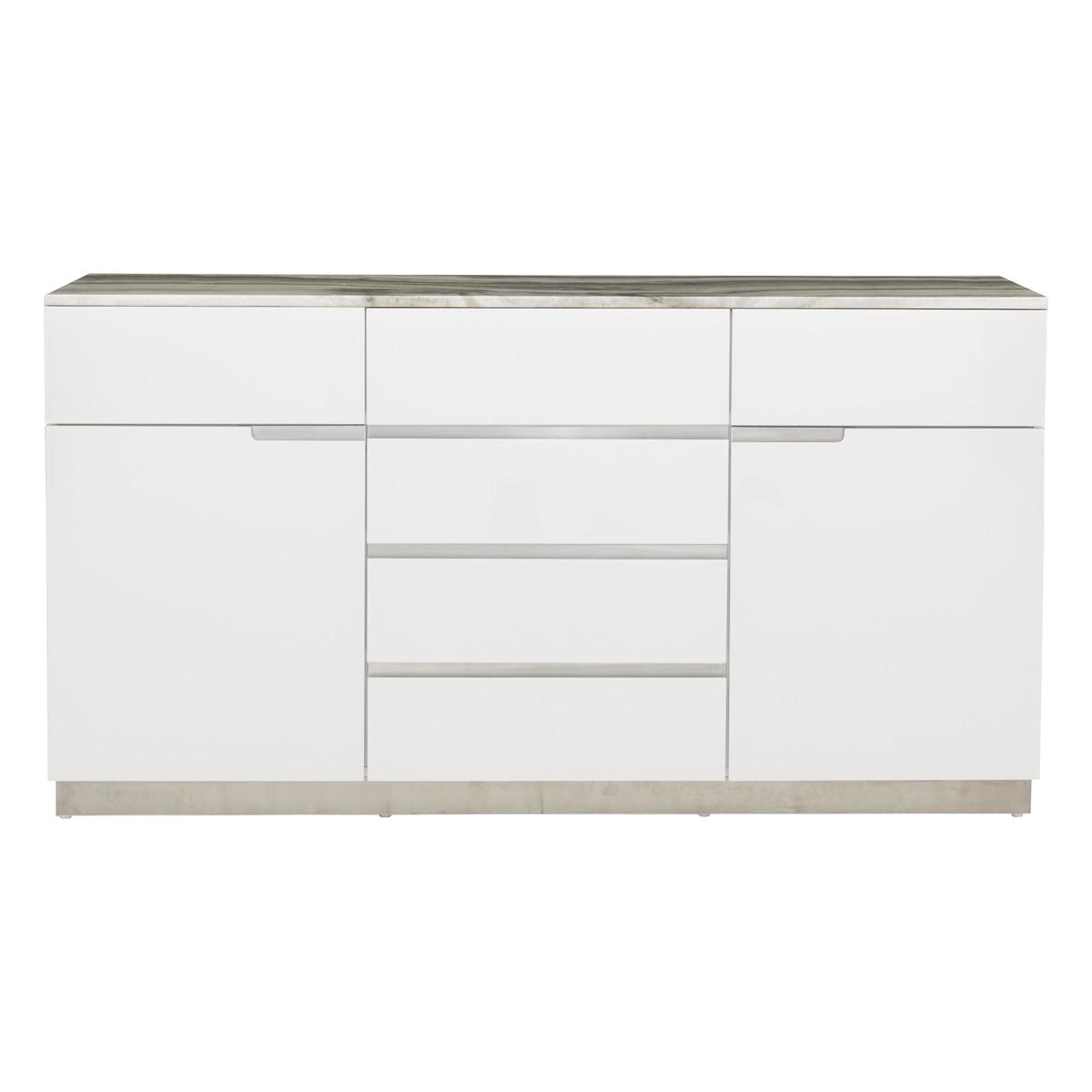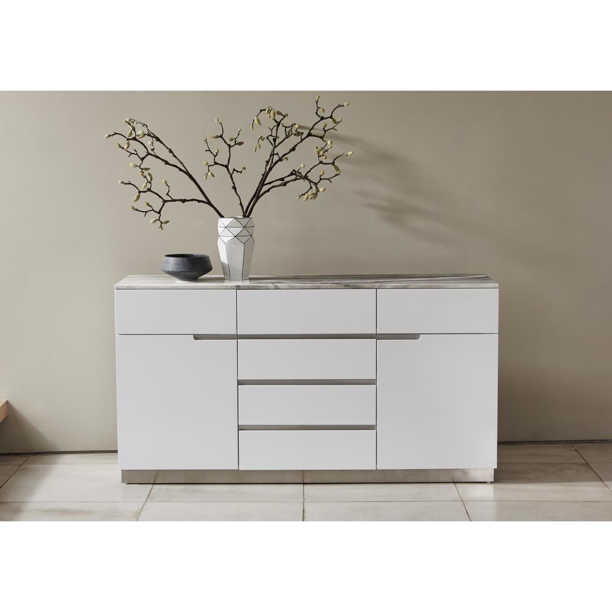 Storage takes centre stage with the ever so stylish Arabella large sideboard. This spacious unit is sleekly contemporary, with a bright white lacquered frame and solid white marble top with a light grey, high-gloss marbled finish. This finish is created through a unique process that ensures that the gorgeous swirling pattern is perfectly replicated across all the other pieces in the stunning collection. Stylish details include a brushed steel trim along the sideboard’s base, and in between its drawers and cupboard doors. In terms of storage you’ll find two soft-closing single-door cupboards, and six soft-close drawers. There’s plenty of space, in fact, to keep all your dinnerware, glasses and cutlery neatly tucked away, with extra room for table linens and place mats, too. The Arabella large sideboard is part of the Arabella range of stunning marble-topped table living and dining room pieces. Only at Furniture Village.