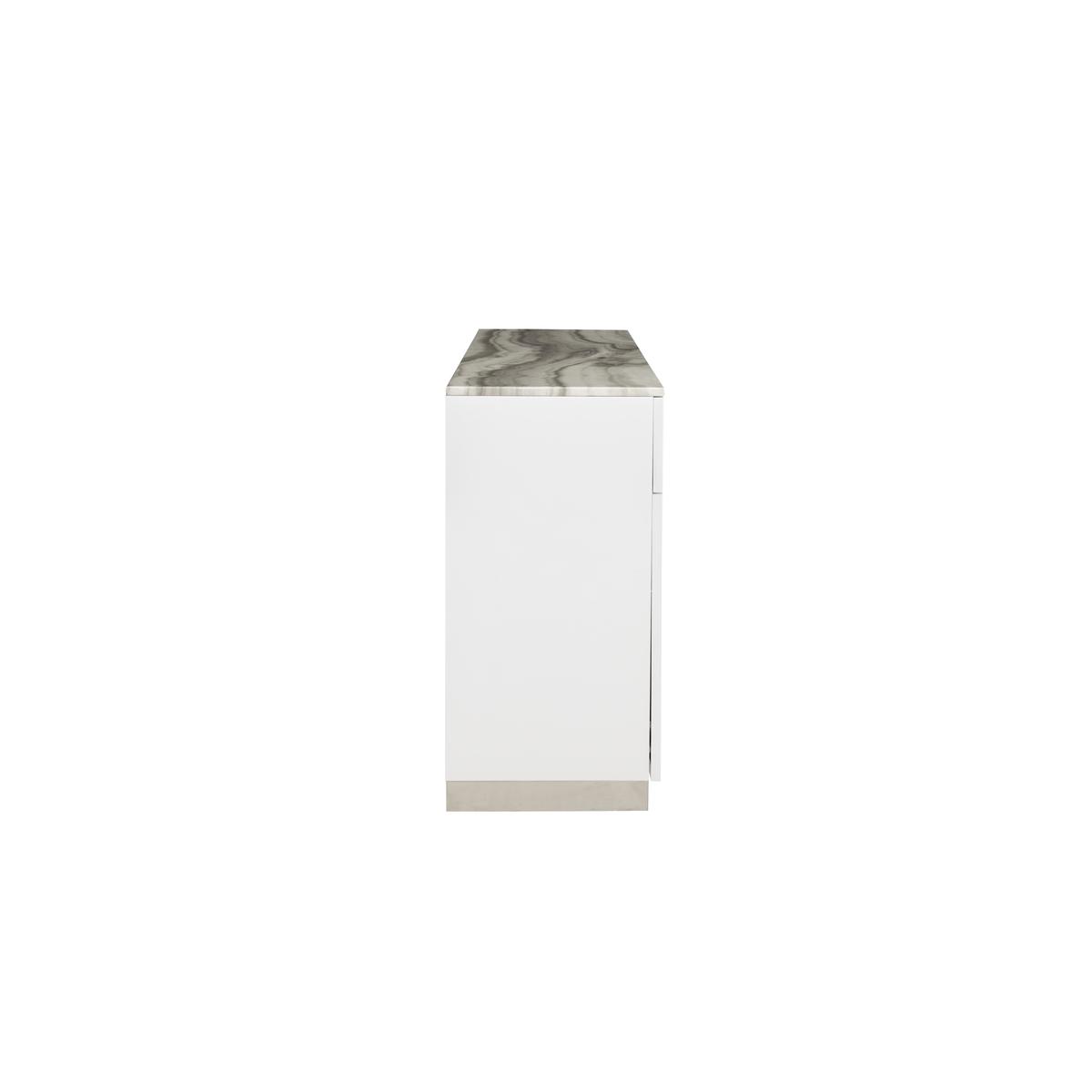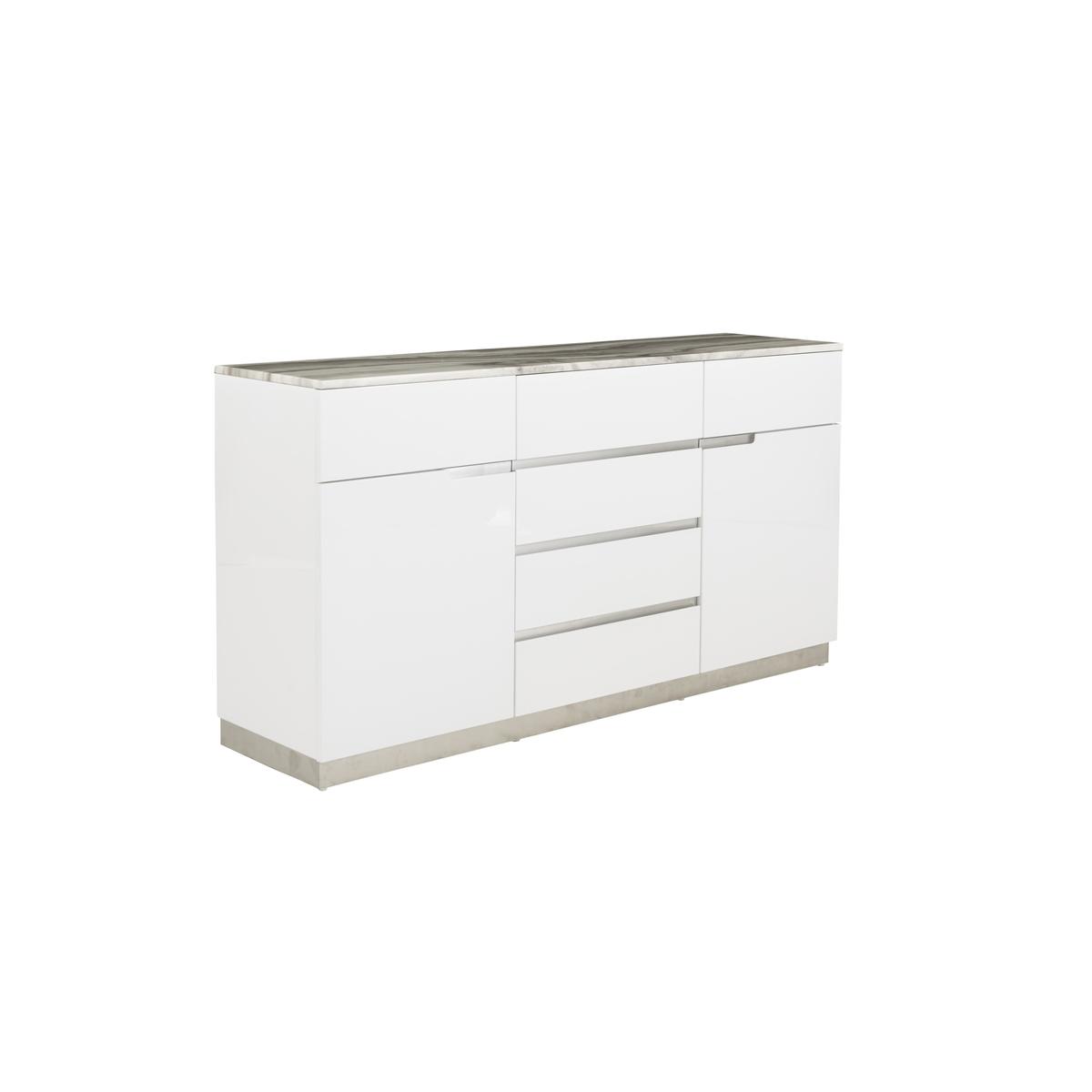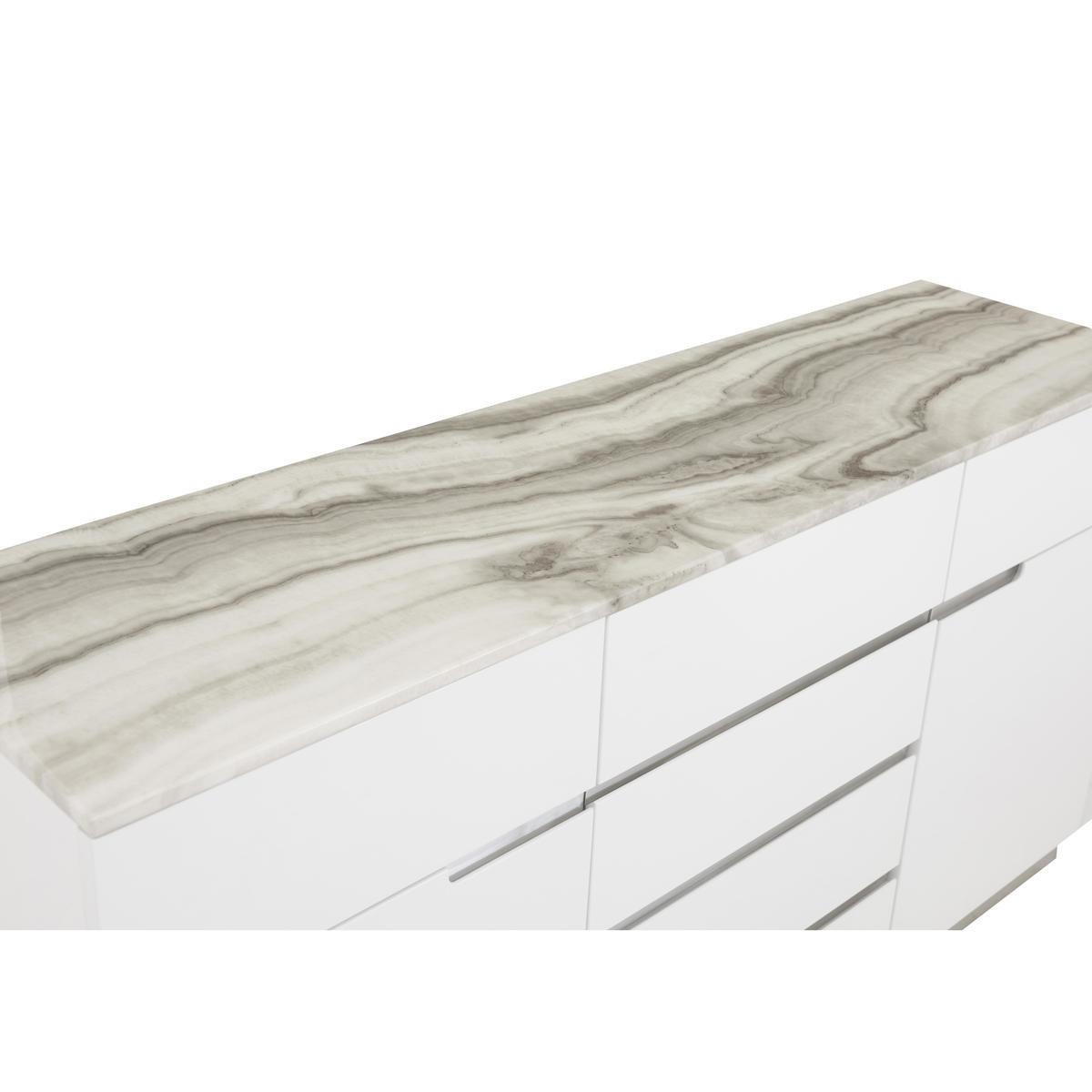 Storage takes centre stage with the ever so stylish Arabella large sideboard. This spacious unit is sleekly contemporary, with a bright white lacquered frame and solid white marble top with a light grey, high-gloss marbled finish. This finish is created through a unique process that ensures that the gorgeous swirling pattern is perfectly replicated across all the other pieces in the stunning collection. Stylish details include a brushed steel trim along the sideboard’s base, and in between its drawers and cupboard doors. In terms of storage you’ll find two soft-closing single-door cupboards, and six soft-close drawers. There’s plenty of space, in fact, to keep all your dinnerware, glasses and cutlery neatly tucked away, with extra room for table linens and place mats, too. The Arabella large sideboard is part of the Arabella range of stunning marble-topped table living and dining room pieces. Only at Furniture Village.