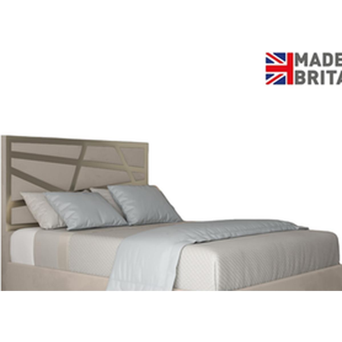 Stylish modern geometric design. Best seller and enigmatic style choice. Available in a choice of metal finishes. Brushed gold or brushed silver as standard and can also upgrade to mirror gold or mirror silver. The headboard is panelled and generously padded. The footboard is detailed with pipe feet to match brushed silver or gold legs to match brushed gold. The bed is supplied with solid platform boards for extra support.