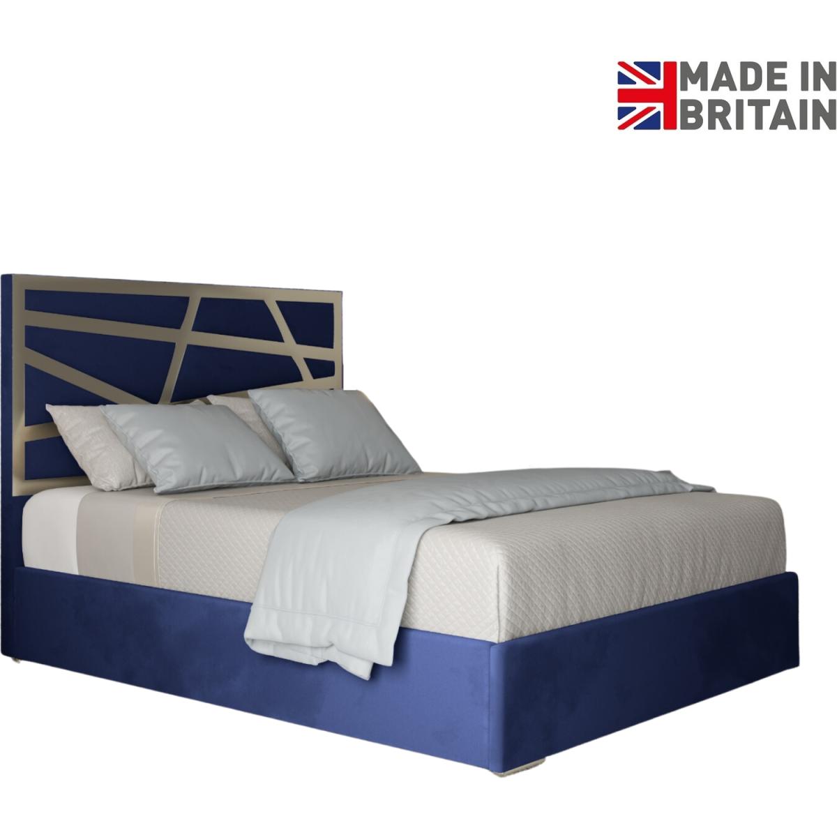 Stylish modern geometric design. Best seller and enigmatic style choice. Available in a choice of metal finishes. Brushed gold or brushed silver as standard and can also upgrade to mirror gold or mirror silver. The headboard is panelled and generously padded. The footboard is detailed with pipe feet to match brushed silver or gold legs to match brushed gold. The bed is supplied with solid platform boards for extra support.