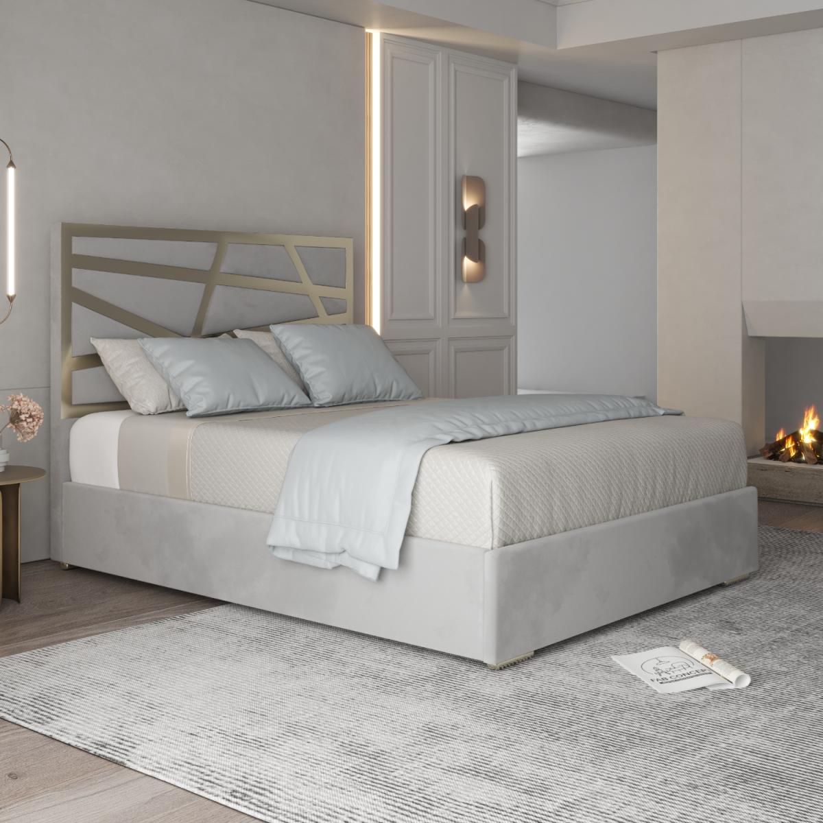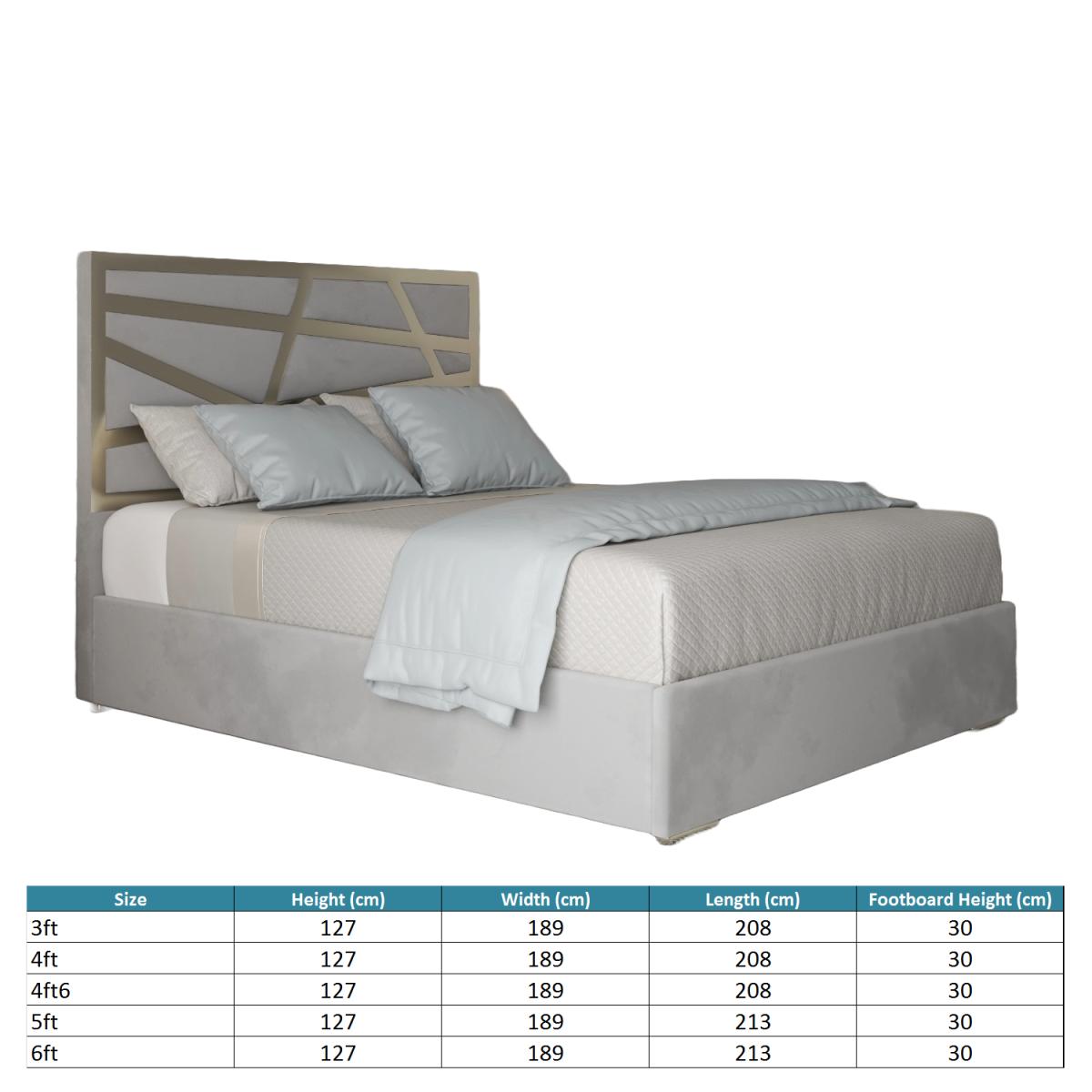 Stylish modern geometric design. Best seller and enigmatic style choice. Available in a choice of metal finishes. Brushed gold or brushed silver as standard and can also upgrade to mirror gold or mirror silver. The headboard is panelled and generously padded. The footboard is detailed with pipe feet to match brushed silver or gold legs to match brushed gold. The bed is supplied with solid platform boards for extra support.