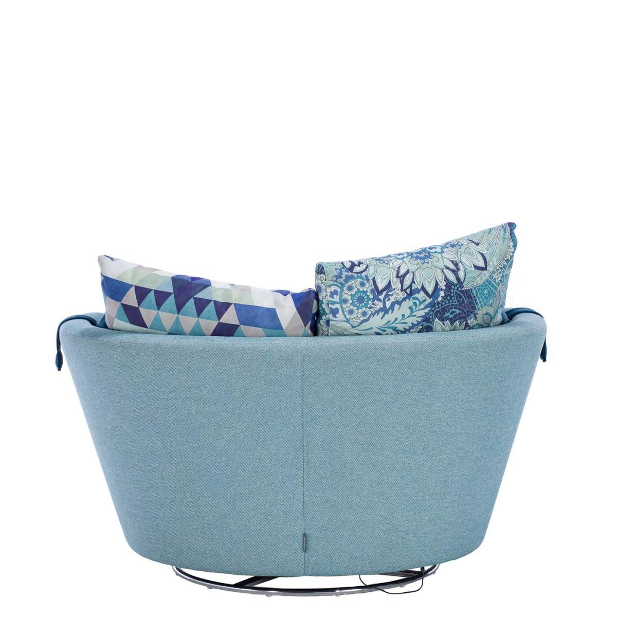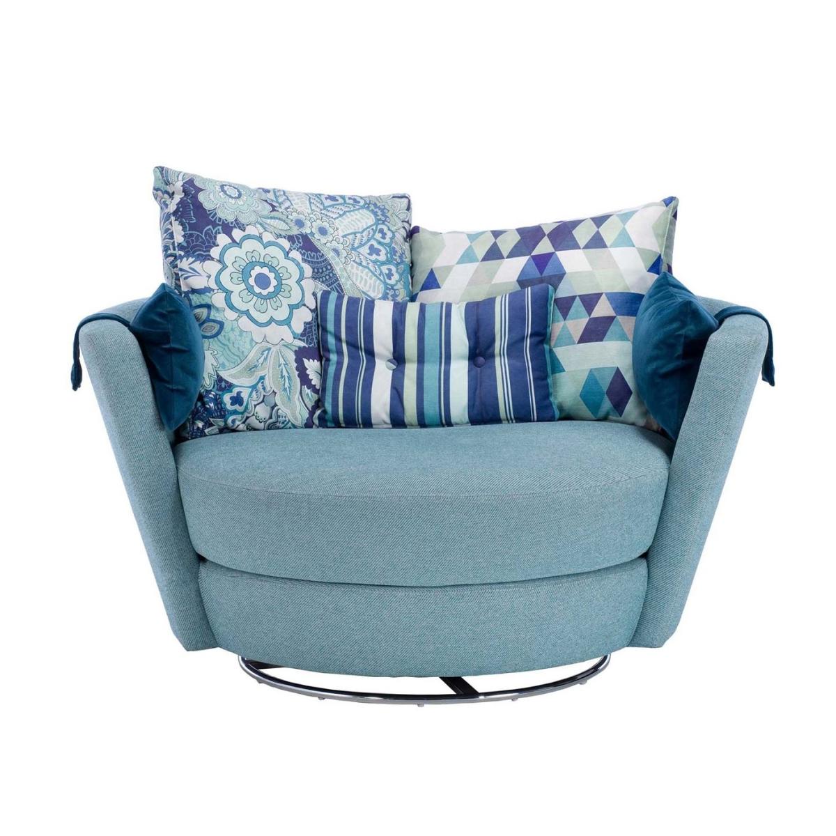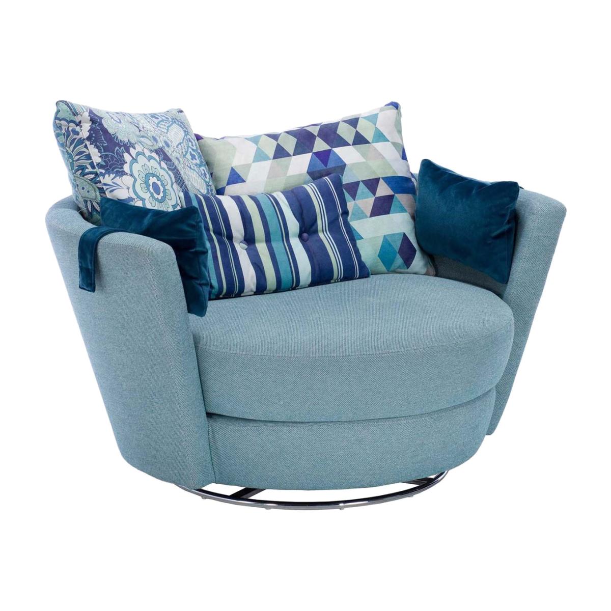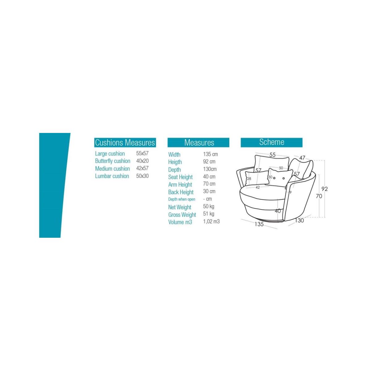 Design. The contemporary yet practical Aragon features a curved back for a statement look, plump cushions for optimum comfort and a circular swivel base that enables the chair to rotate 360 degrees freely. Its generous size can cosily accommodate two people or offer enough space for you to stretch out and put your feet up. Its modern built-in speakers and Bluetooth features mean you can listen to your favourite playlist without having to leave your seat. Pair with the Aragon footstool for a cohesive look in your living room. Includes 1x large back cushion, 1x medium back cushion, 2x butterfly headrests, 1x lumbar cushion and 1x throw.