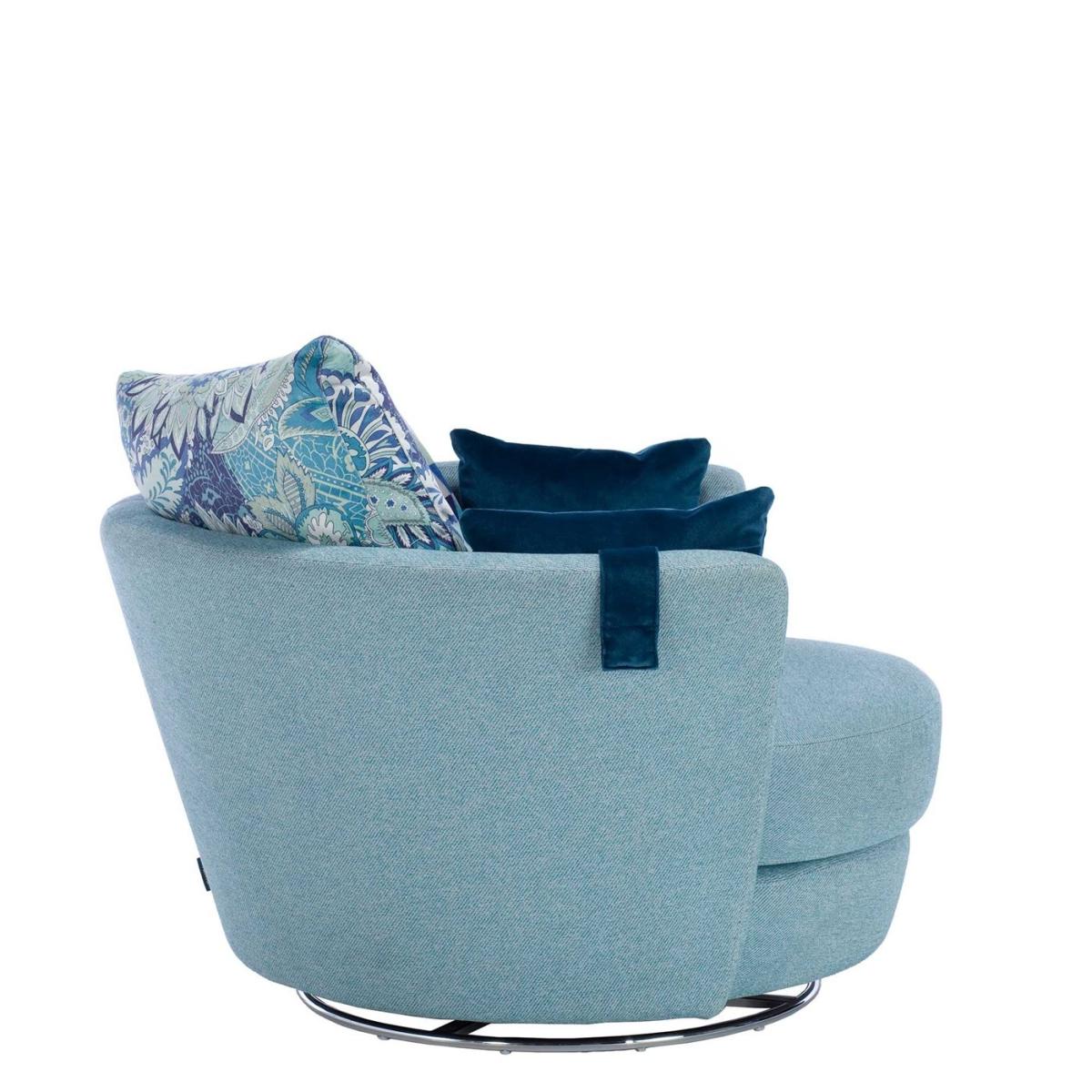 I love this armchair for its contemporary take on a classic swivel design, making it both functional and stylish. The fabric’s soft blue tone is versatile and works well in light, airy interiors or paired with bold colour schemes for added depth. It’s particularly suitable for casual living rooms or cosy reading nooks where comfort is key. When styling, consider layering with textured cushions in patterned or contrasting colours to break up the solid fabric. It also pairs well with modern or eclectic schemes, and its swivel feature adds practicality in social spaces, making it easy to turn towards conversation or the view. Keep surrounding accessories simple to let this statement piece stand out or add warmth with a plush rug underneath.