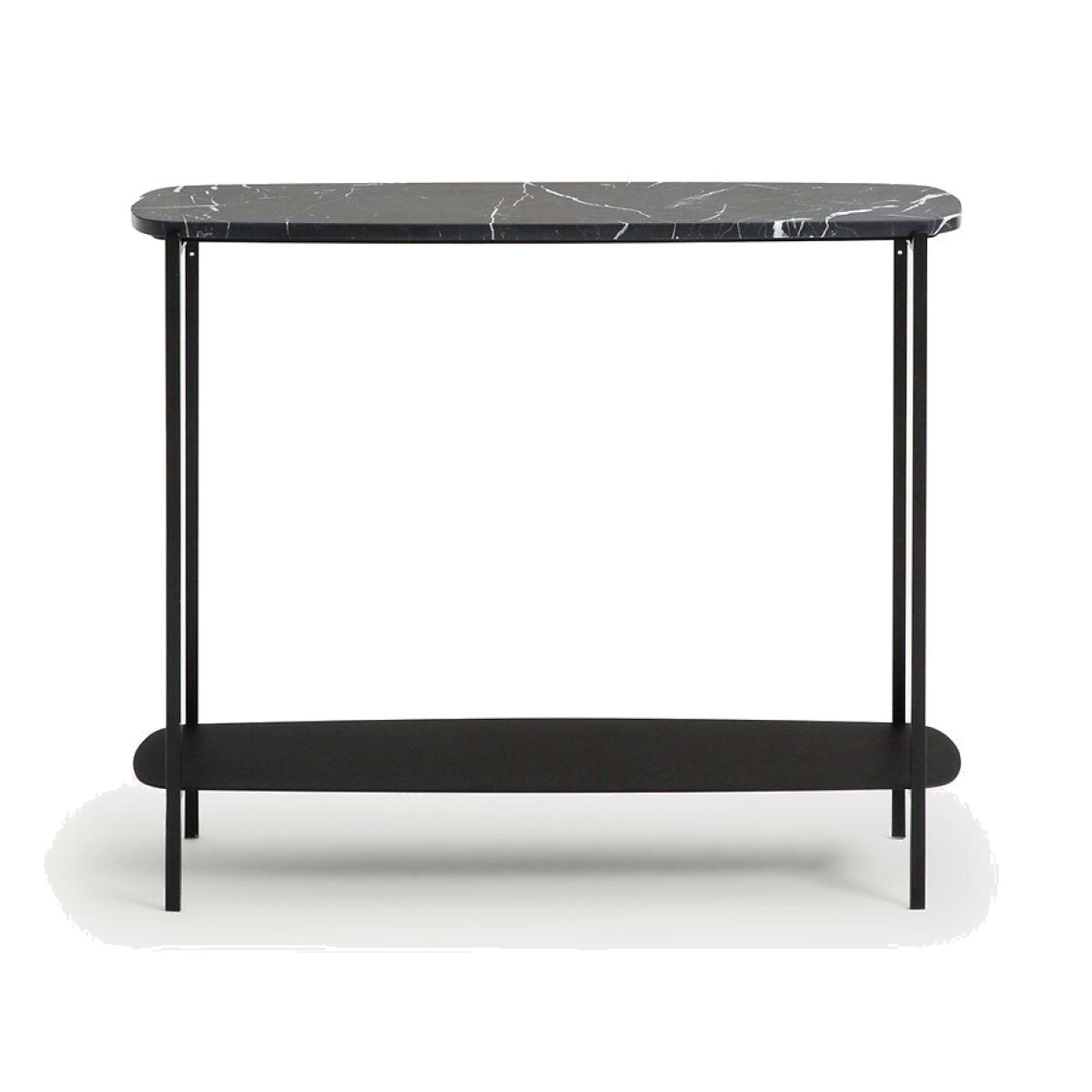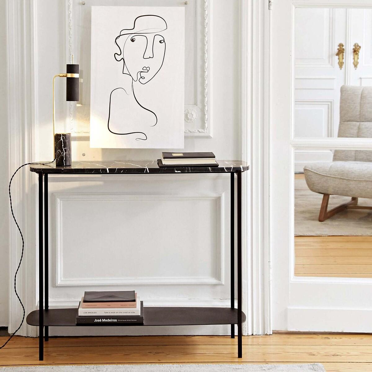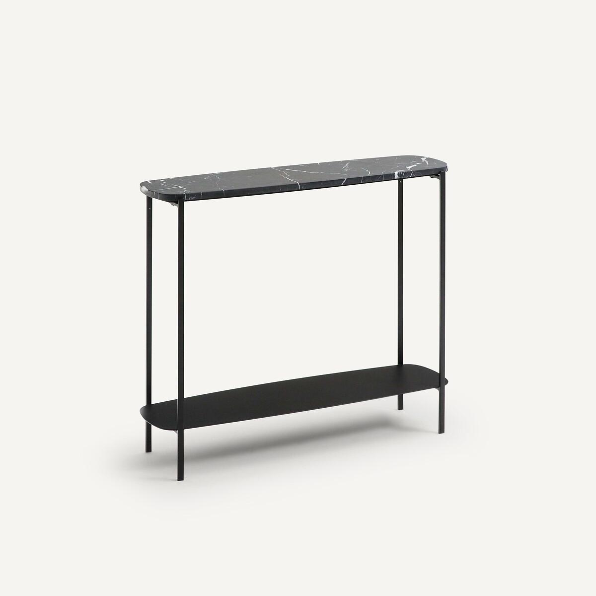 Make an immaculate first impression at home with this slender and elegant console table from our Arambol range. A pleasing combination of organic forms and modern metallics, it has two mable plates at the top and bottom, neatly balanced on an H-shaped frame. Ideal in an entryway, behind the sofa in the living room, in a bedroom...Product Details • Tray top in black matte marble, thickness 18 mm • Each piece is unique so the marbled effect may vary • Structure and bottom tray in epoxy-finish black metal. Care Advice. Marble is a naturally porous material that is susceptible to stains. To preserve all its qualities, follow the advice below. :• Avoid placing hot objects on the surface, use coasters and trivets. • Immediately wipe up any spilled liquid with a white cloth dipped in lukewarm water and wrung out. • Maintain your marble regularly with products from our partner Akemi® • We advise you to use Akemi® Crystal Clean Spray for your daily maintenance and, at least once a month, Akemi® Triple Effect Spray to clean and protect your marble surface.. This will reinforce the initial treatment and its water-repellent effect will prevent dirt from easily penetrating the stone.. • If you want to use products other than those of our partner Akemi®, choose only p. H-neutral cleaners. • Acid, anti-limescale or bleach-based products are not recommended. Dimensions • Length 90 x Height 76 x Depth 25cmDelivery:. This product requires some assembly. Dimensions and weight of parcel2 parcels • Length 98 x Height 32 x Depth 98cm - 18.5kg • Length 101 x Height 15 x Depth 36cm - 11.5kg