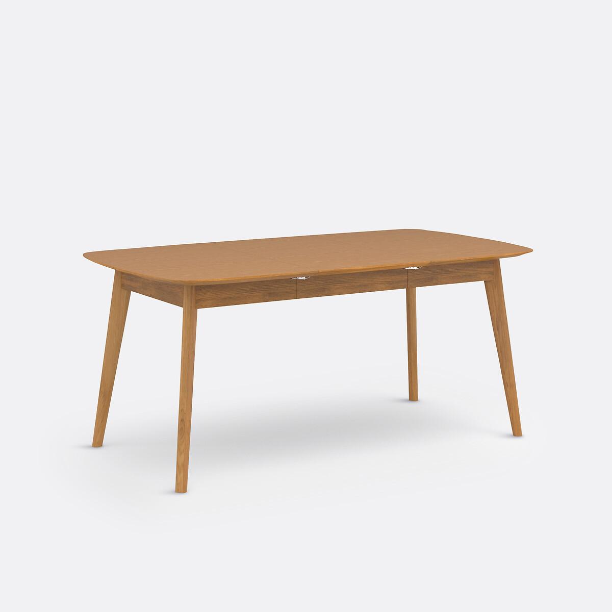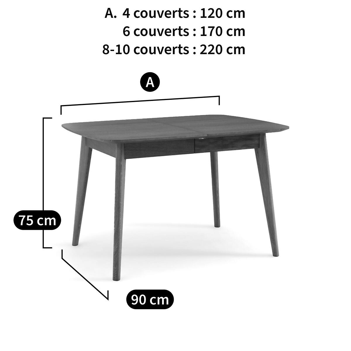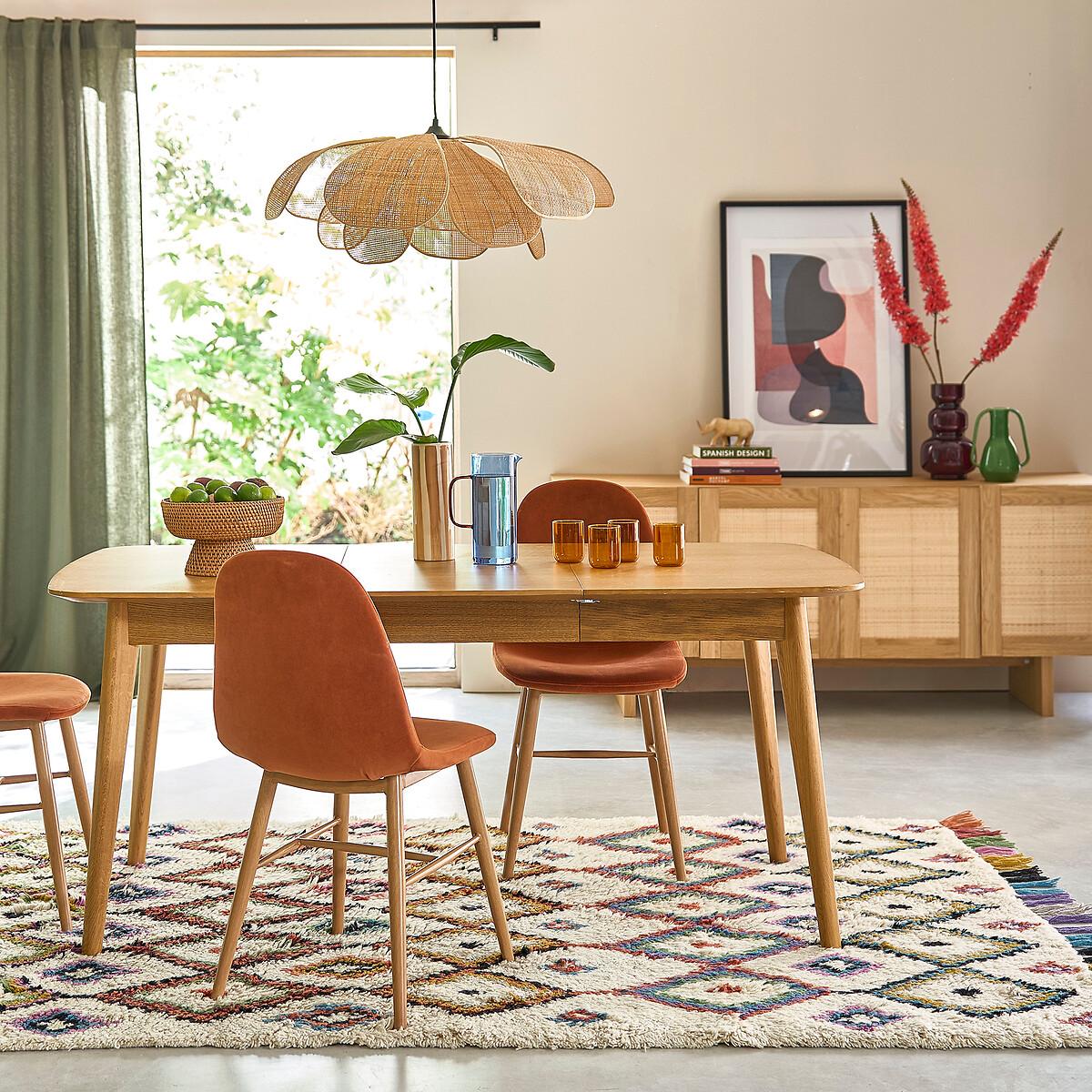 This 50s-style extendable table can be used for any occasion. Its medium oak top and tapered legs have a revisited vintage look. Designed by La Redoute Interiors. Made in Europe. Product Details • Medium oak veneered MDF top, polyurethane varnish finish • Tapered legs in solid oak, polyurethane varnish finish • FSC® certified wood • Bevelled tabletop • 2 removable extensions (to be stored separately) • Steel metal extension slidesDimensions. Overall Without extension : 4-seater table • Width: 90cm • Height: 75cm • Length: 120cm. With 1 extension: Seats 6 • Width: 90cm • Height: 75cm • Length: 170cm with 2 extensions: Seats 8-10 • Width: 90cm • Height: 75cm • Length: 220cm Total useful dimensions • Space between legs without extension: 84cm • Space between legs with 1 extension: 134cm • Space between legs with 2 extensions: 176.5cm • Space between legs at the end of the table: 54cmDelivery:. Assembly required. Available for home delivery. Note! Please check that all access points are large enough to accommodate your delivery (doors, stairs, lifts). • Made in Europe. • WOOD FROM SUSTAINABLY MANAGED FORESTS. FSC® certified wood comes from forests that are environmentally, socially and economically well managed. Dimensions and weight of parcel2 parcels • L112 x H21 x D35cm - 32.7kg • L105 x H12 x D67cm - 32kg