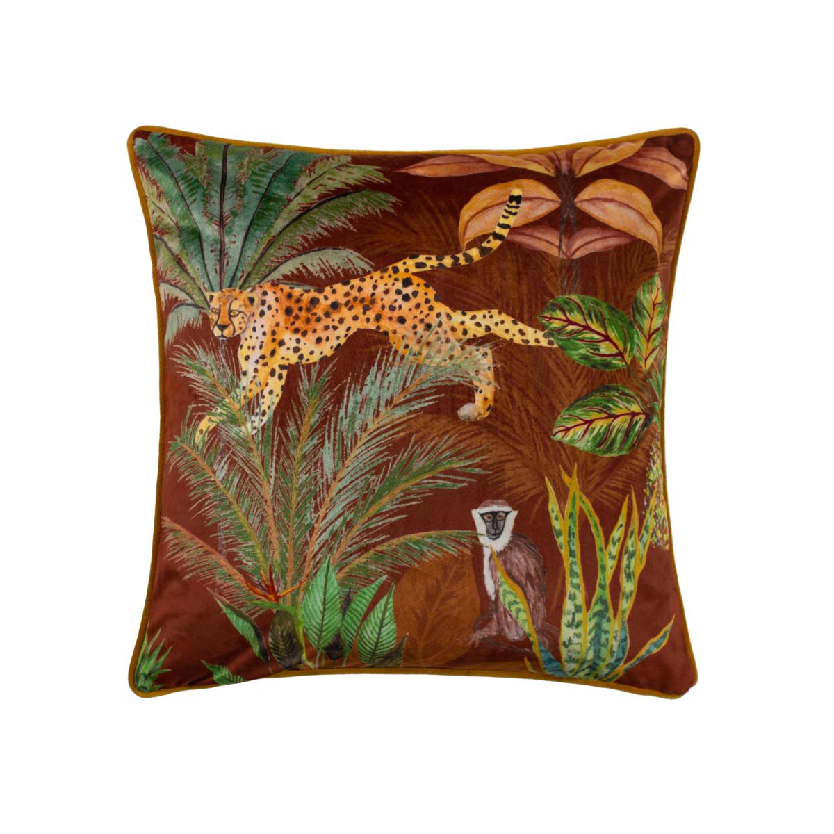 A beautiful, printed velvet cushion featuring a hand painted bounding cheetah and a perched monkey in amazing detail, among the lush, jewel toned jungle florals and set against a dramatic contrasting background. Finished with a piped trim and a soft, plain velvet reverse. A fantastic way to add a touch of the tropics to your home.