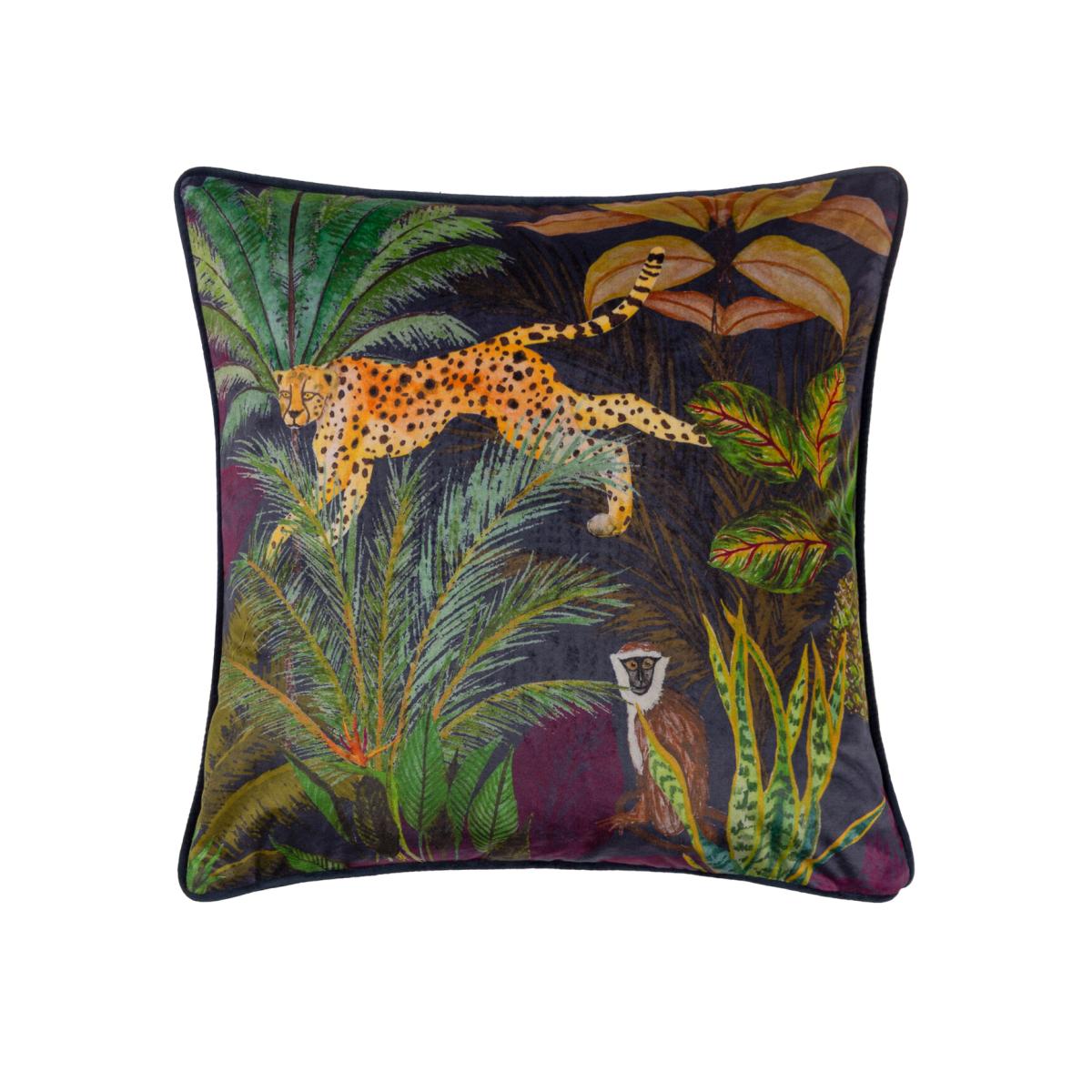 A beautiful, printed velvet cushion featuring a hand painted bounding cheetah and a perched monkey in amazing detail, among the lush, jewel toned jungle florals and set against a dramatic contrasting background. Finished with a piped trim and a soft, plain velvet reverse. A fantastic way to add a touch of the tropics to your home. Composition: 100% Polyester. This product will be dispatched by one of our trusted suppliers. You’ll be contacted by their selected courier about your delivery.