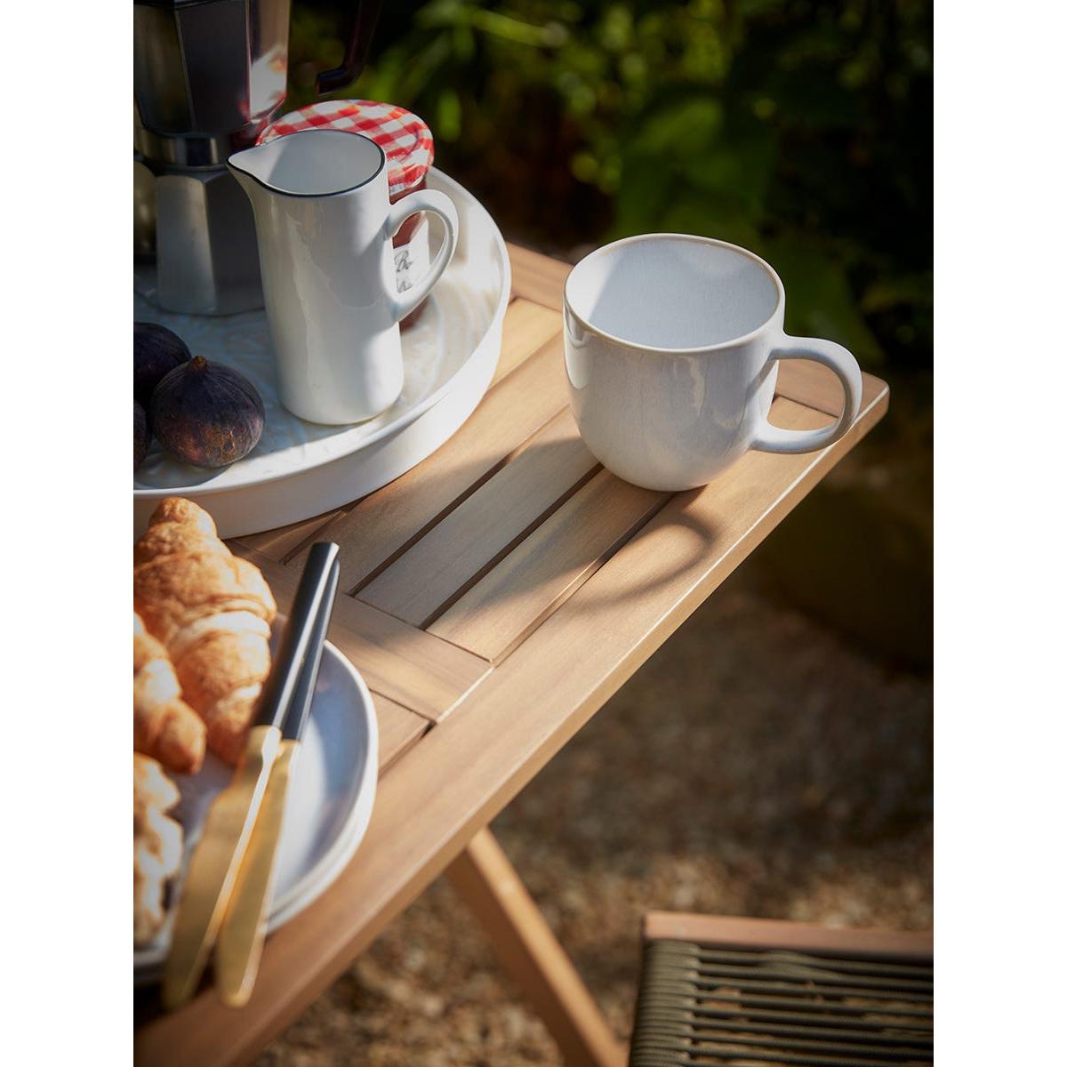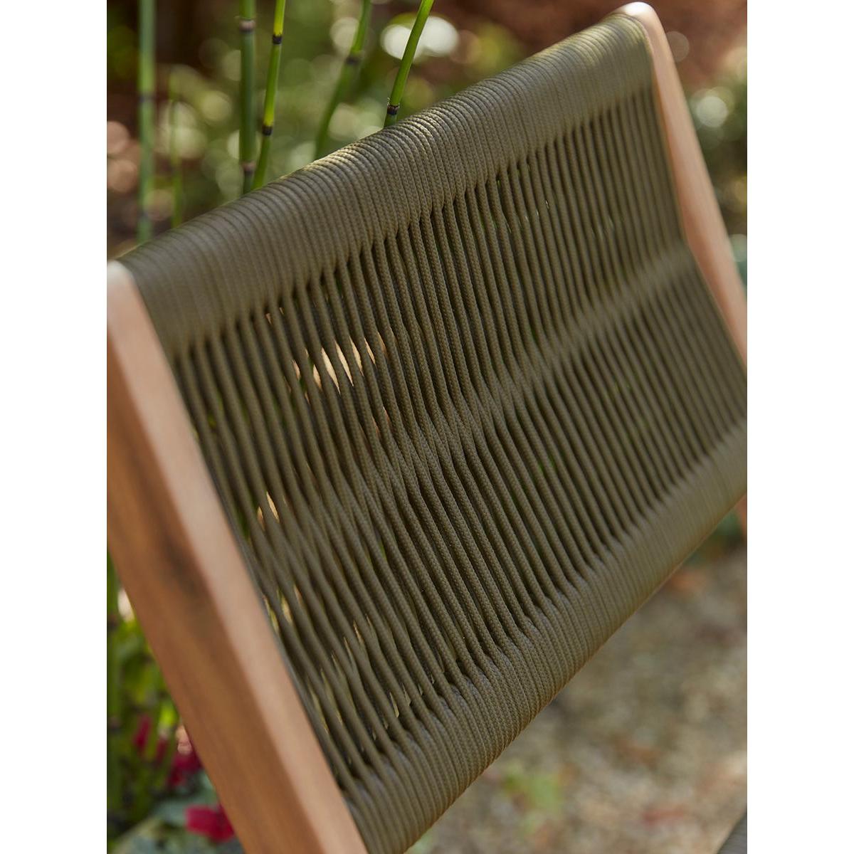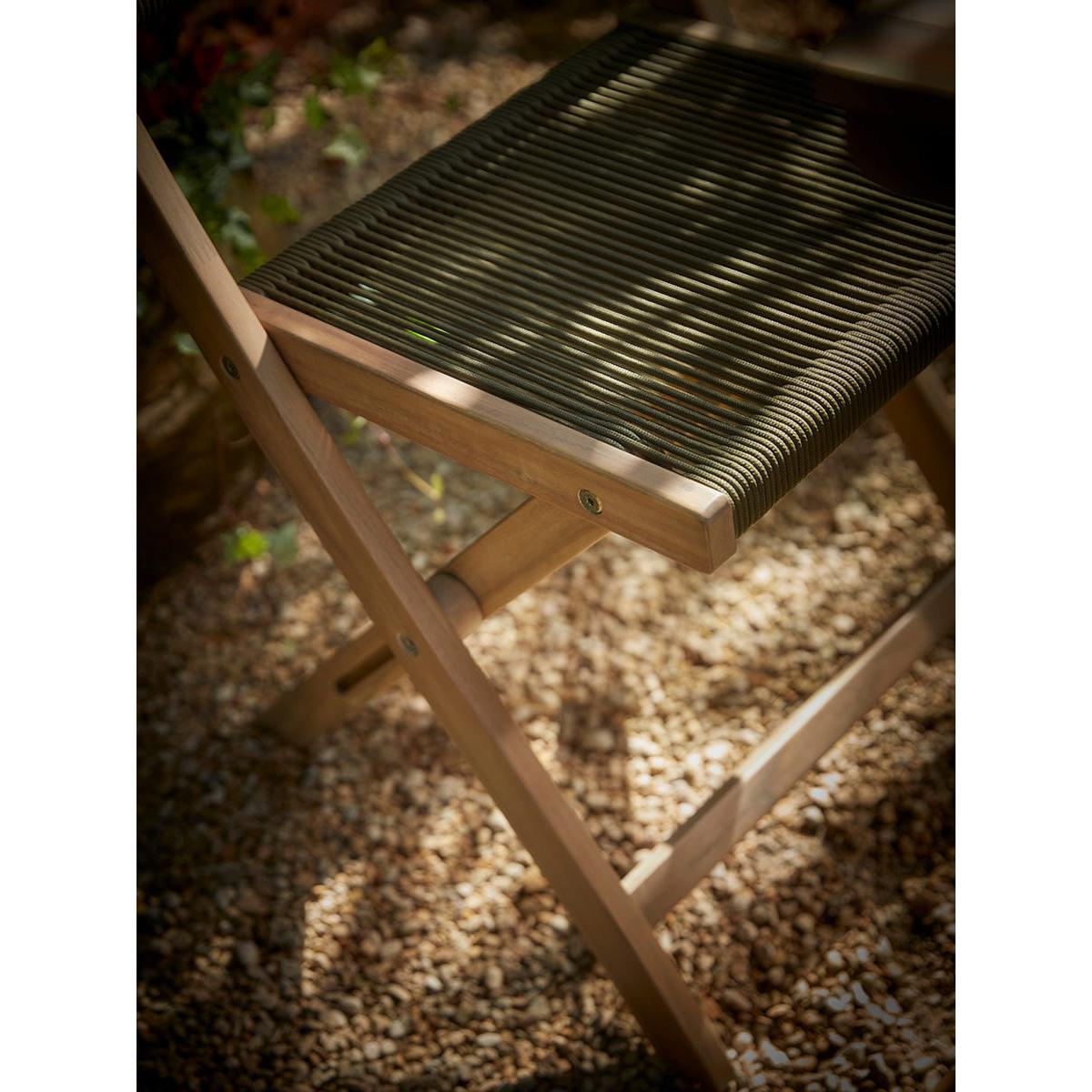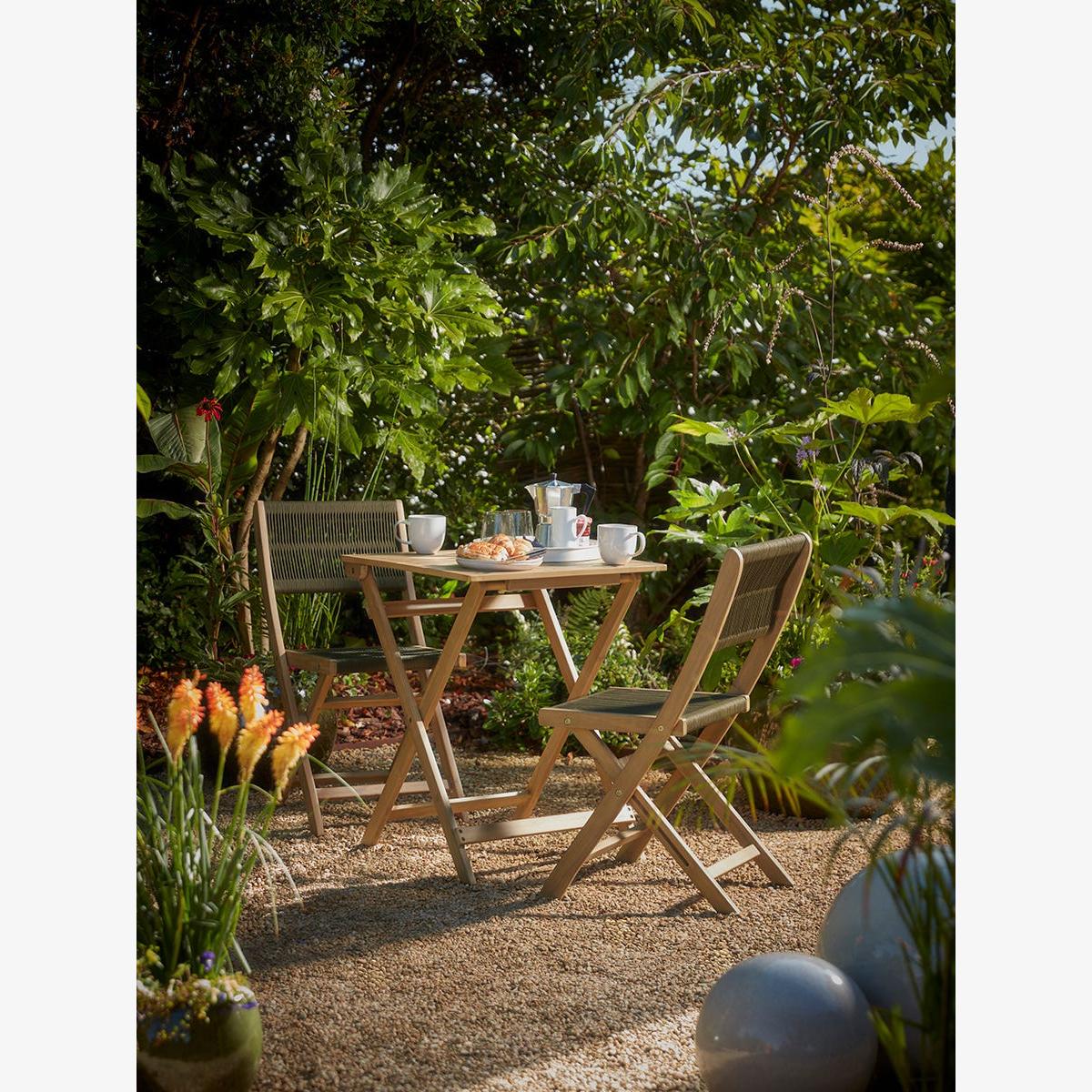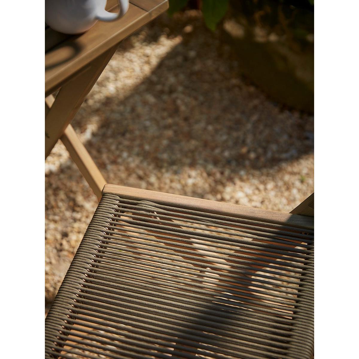 Enjoy a peaceful breakfast in your outside space and enjoy the summer moring rays on our Arbor Bistro Set. Made from a warm acacia wood frame, a luscious, deep olive green rope works with the greenery in your garden and creates the seat and back rest, for a simple, modern twist on a traditional style.