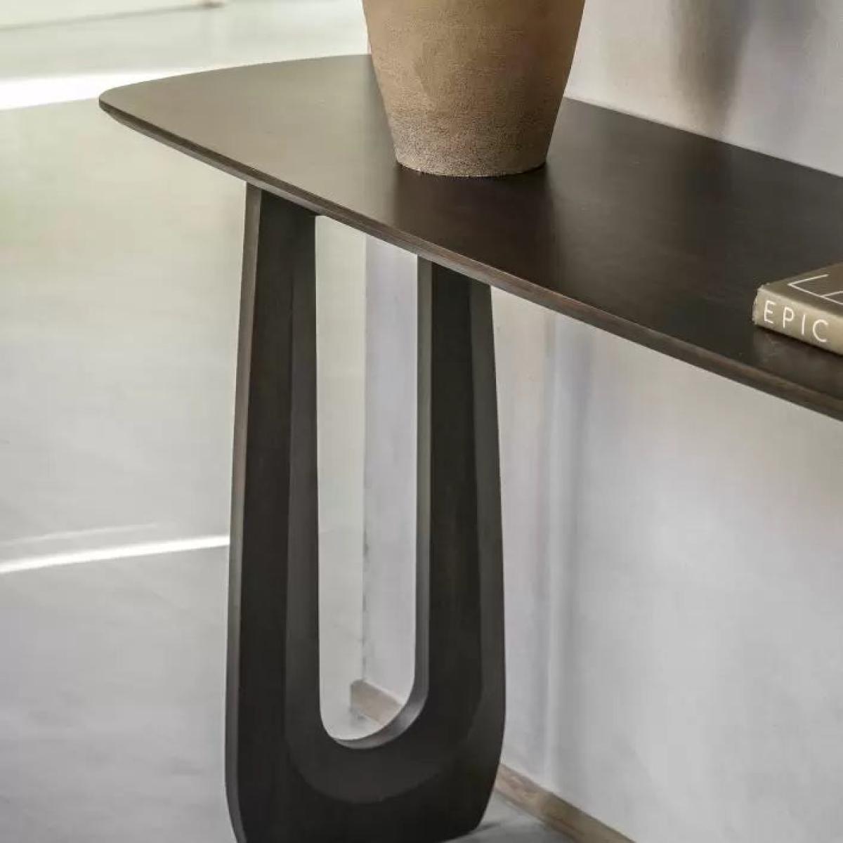 Make a style statement with this bold and beautiful 70s influenced console table. Perfect as either a slim desk or a console table, the dark stained Mango wood is full of rich grains while the eye caching carved U shaped legs add the final touch of retro cool. Coordinating further pieces also available.