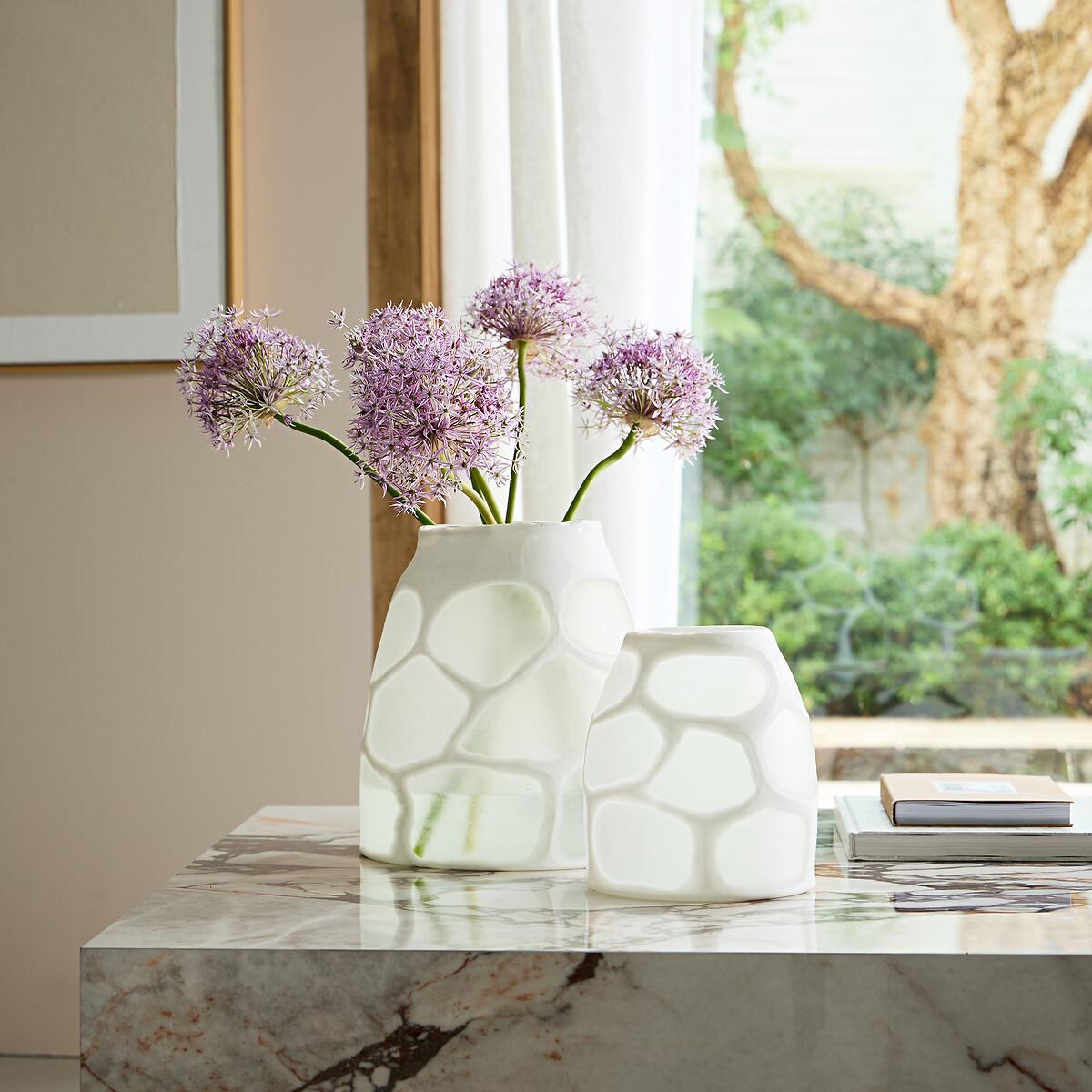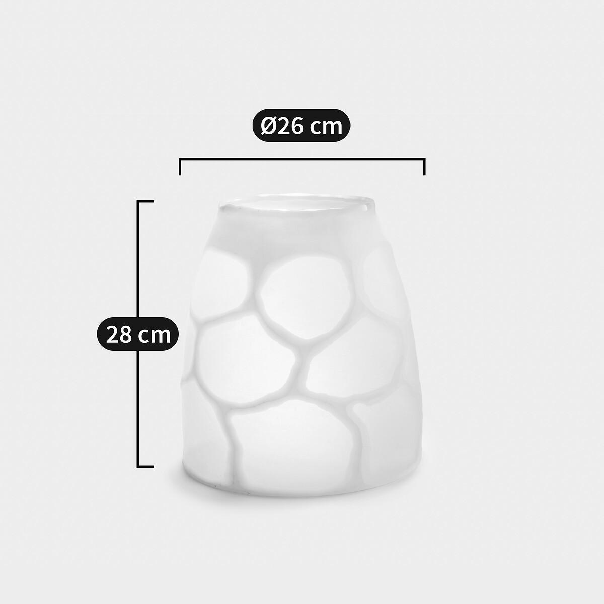 The shapes created by its play of mattness and sheer evoke troglodyte dwellings. The frosted glass creates a subtle visual effect, giving this sleek vase a textured, opalescent print. Product Details • Frosted glass • Hand-crafted, each piece is unique. Shapes, colours and dimensions may vary slightly from product to product. Dimensions • Diameter: 26cm • Height: 28cm. Dimensions and weight of parcel • 1 parcel • W34 x H37 x D33.5cm. 4.1kg