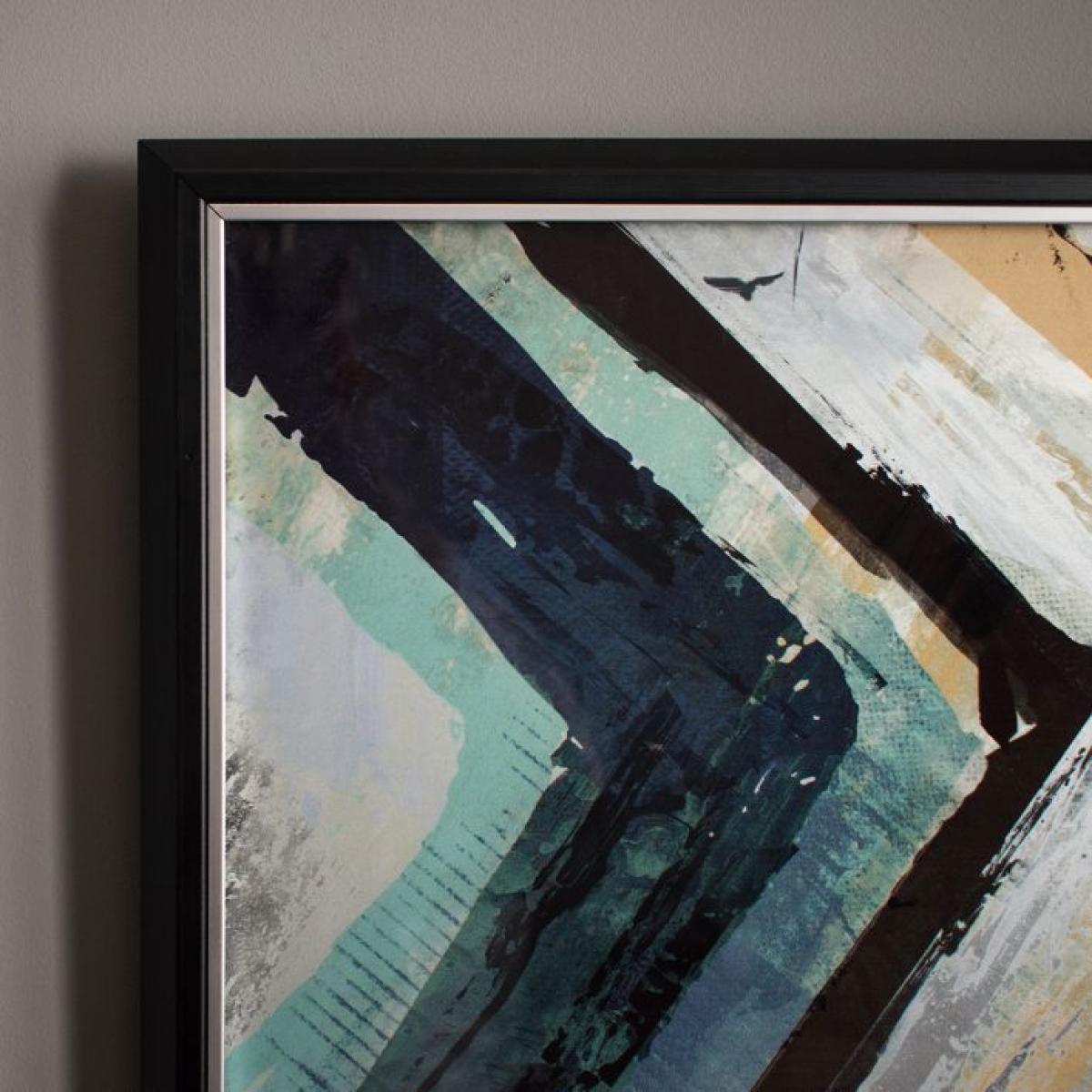 Eye-catching geometric abstract design in stunning colours, paired with a simple yet stylish black frame and silver surround. Orientation: Square. Fixing Type: D-Ring. Framed:Yes. Colour: Blue.