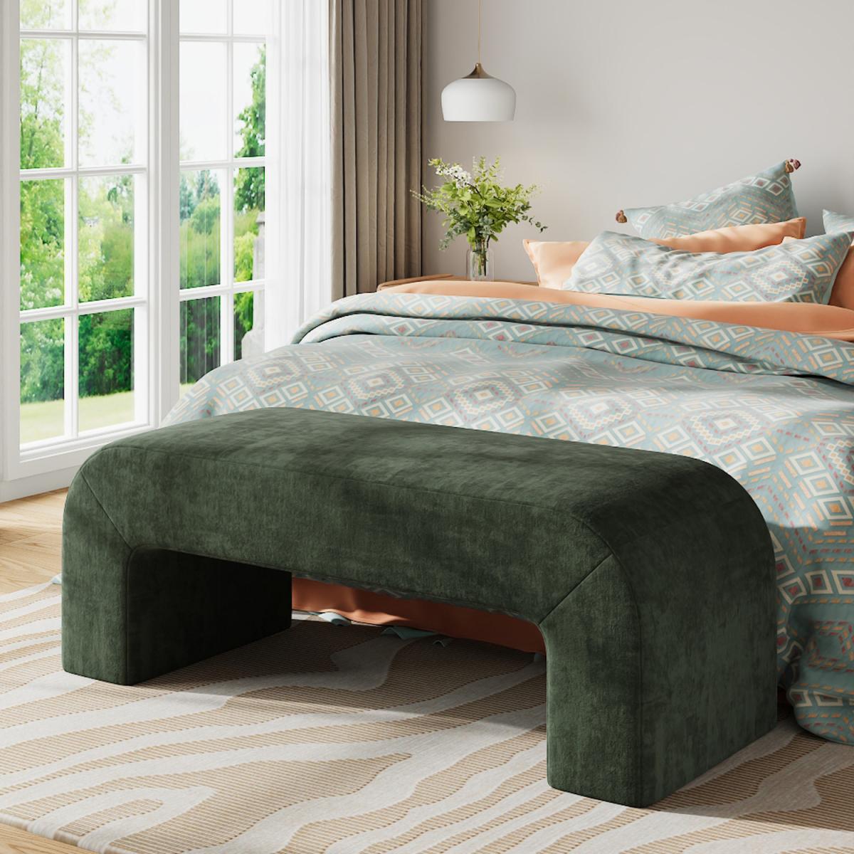 I really like this arch-shaped upholstered bench - it offers a contemporary touch with its smooth curves and vibrant green colour. It works well in both transitional and modern interiors, providing versatile extra seating or a stylish accent piece at the foot of the bed, as seen here. For styling, try pairing it with neutral tones or complementary cushions to make the green pop. Practical tips include using it as a handy spot to rest your feet or lay out clothes, and its upholstered surface makes it comfortable and inviting. It’s a great choice for adding colour and modern appeal without overwhelming the space.