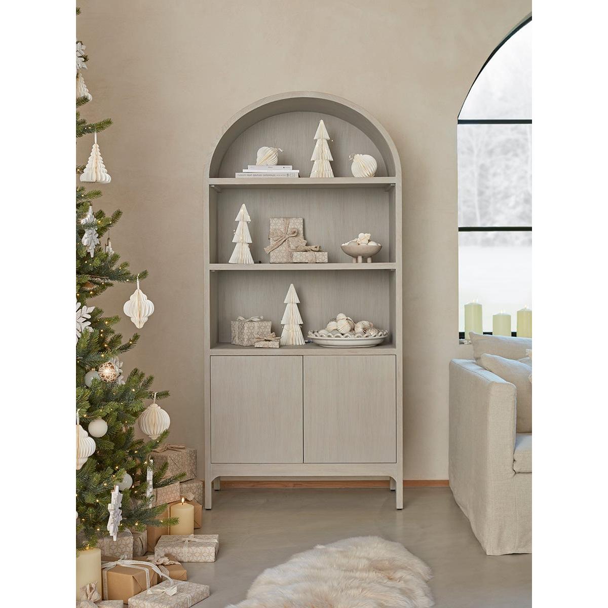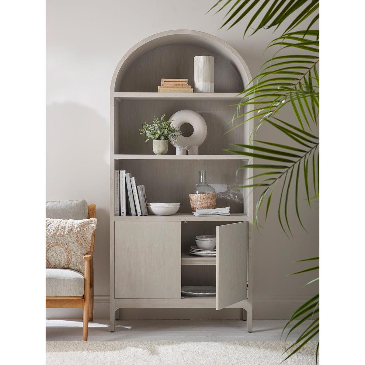 I’m a big fan of this arch-top cabinet for its clean lines and gentle curve, which soften a room without feeling overly ornate. The muted finish pairs beautifully with Scandi-inspired schemes or contemporary neutrals, while the lower cupboards are perfect for stashing away less-attractive items. For styling, mix in a few taller vases or sculptures on the top shelf, balance books laid both upright and flat, then add small plants or candles for texture. Keep one shelf simpler than the others to avoid overcrowding, and use the closed storage below to maintain a clutter-free look.