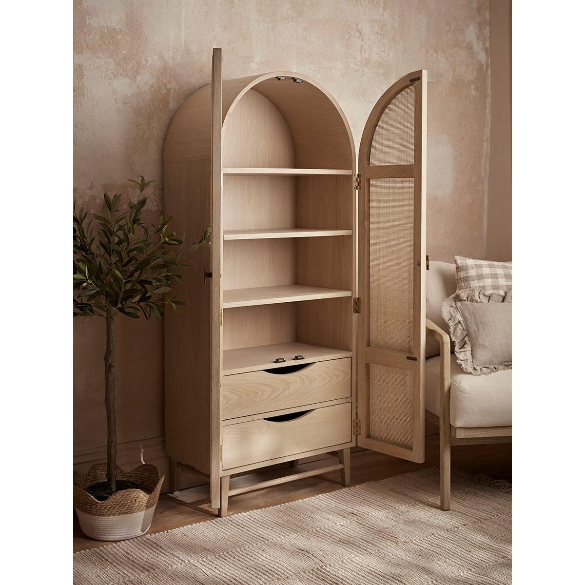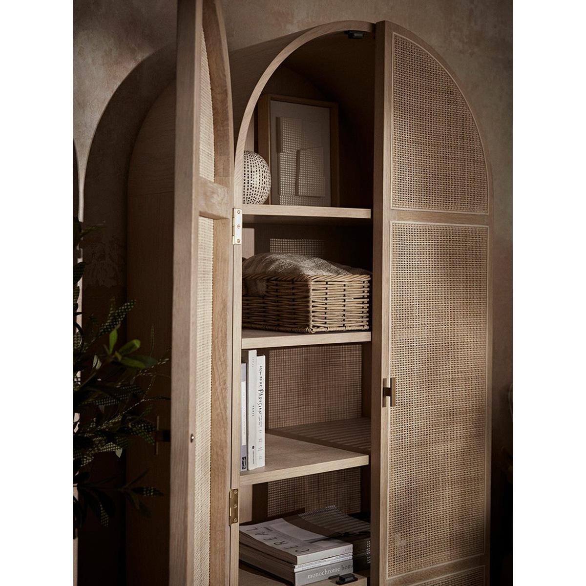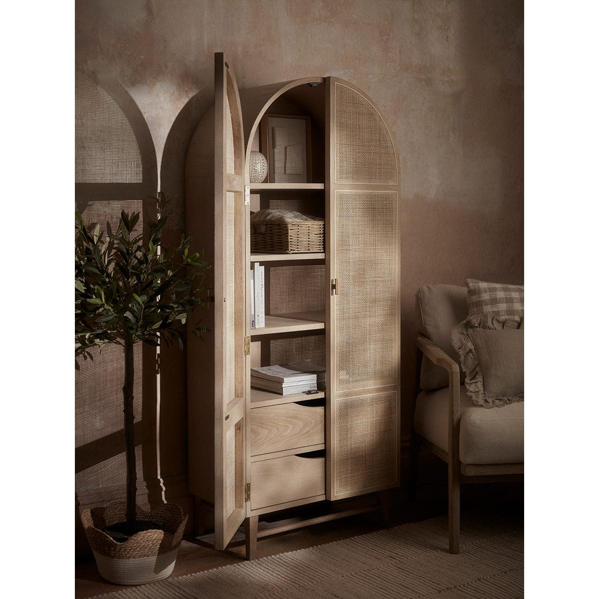 In a soft and delicate arch shape, this arched wicker display cabinet creates a clean and minimalist feature in your home. Crafted from a lighter oak with a slightly weathered finish, the wicker doors create a serene and natural appearance that is finishied with gold handles for an elevated and sophisitcated look. With two internal drawers, perfect for storing throws and blankets, and four generous shelves, there is ample storage for household items, such as books and candles, as well as baskets to keep your the space organised.
