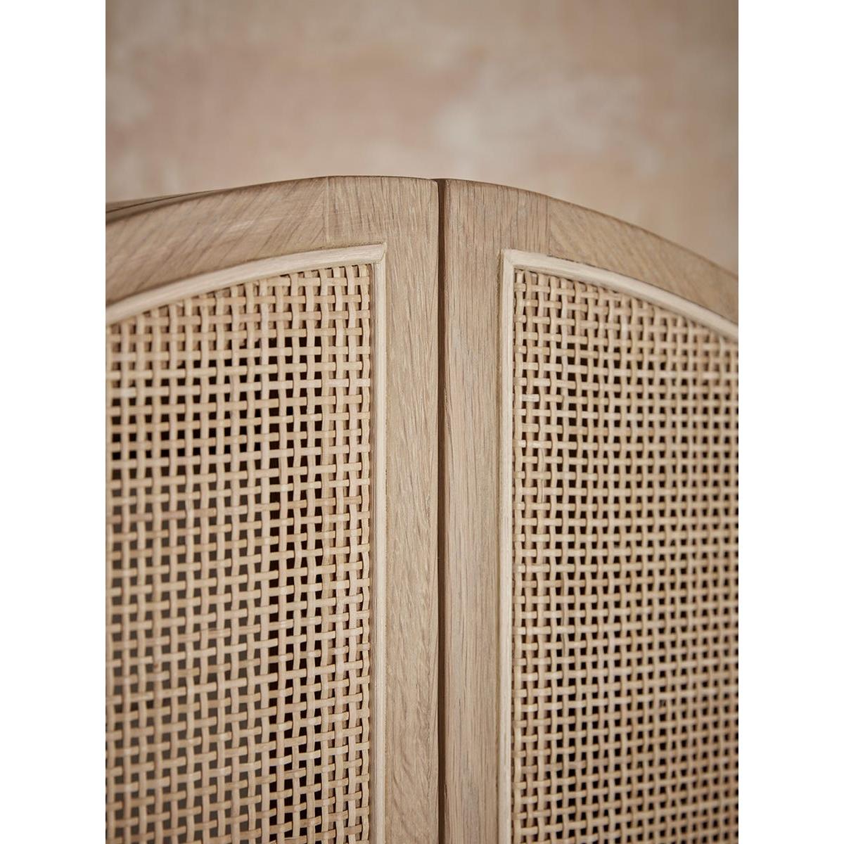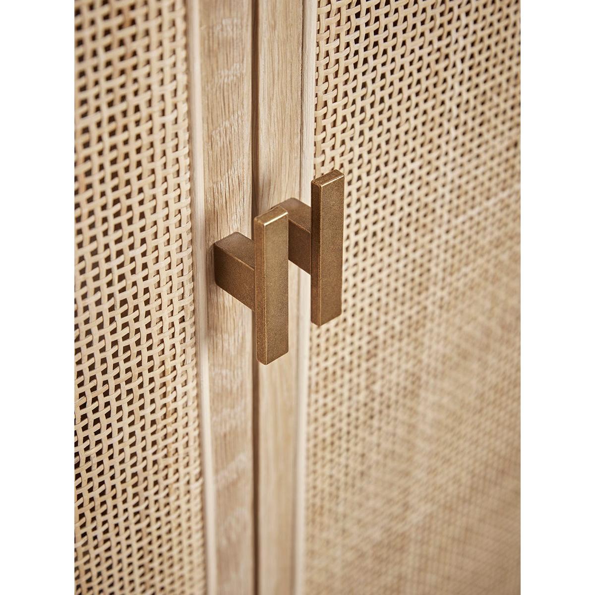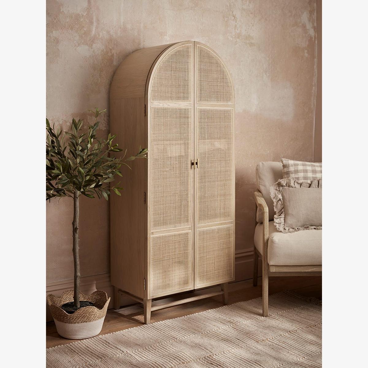 In a soft and delicate arch shape, this arched wicker display cabinet creates a clean and minimalist feature in your home. Crafted from a lighter oak with a slightly weathered finish, the wicker doors create a serene and natural appearance that is finishied with gold handles for an elevated and sophisitcated look. With two internal drawers, perfect for storing throws and blankets, and four generous shelves, there is ample storage for household items, such as books and candles, as well as baskets to keep your the space organised.