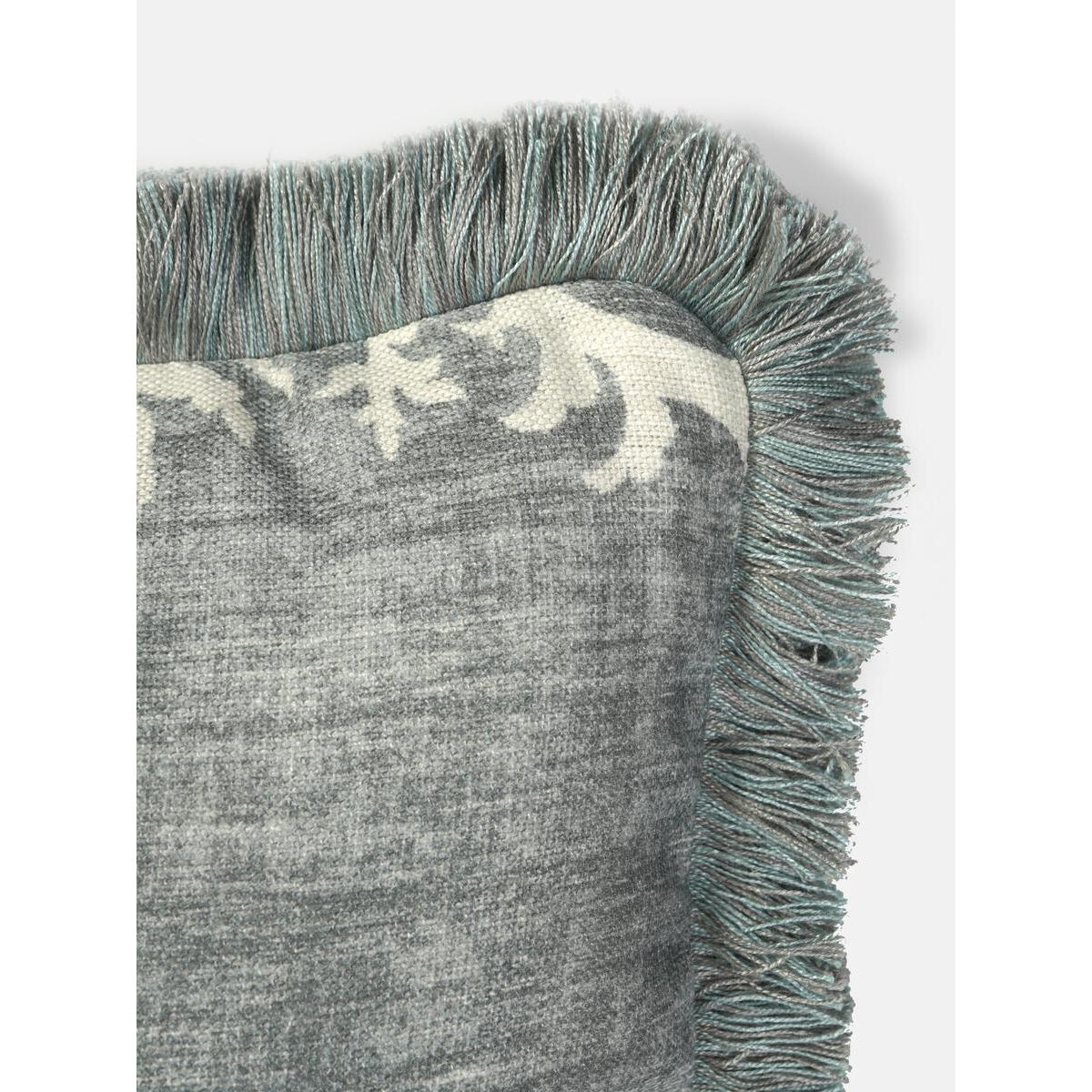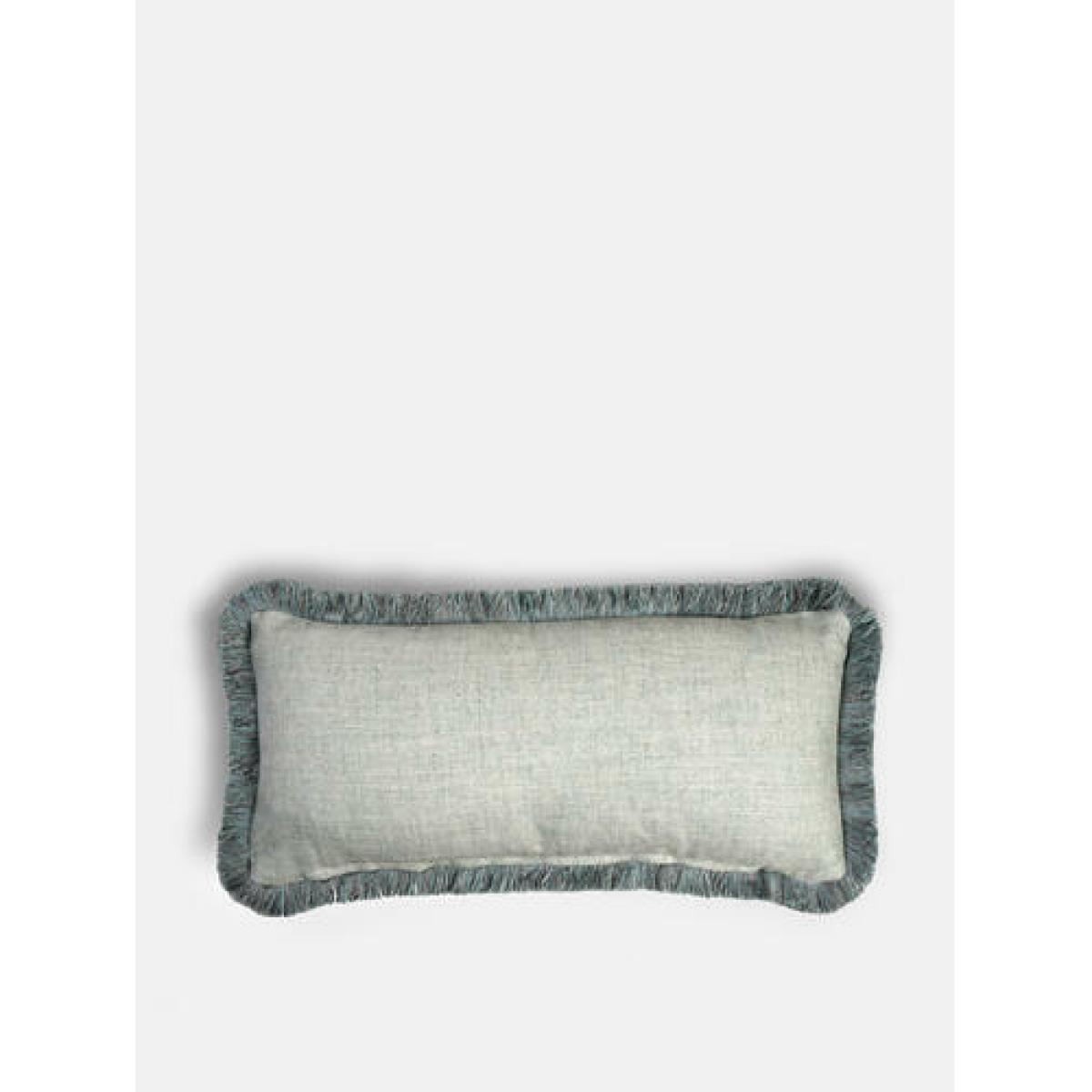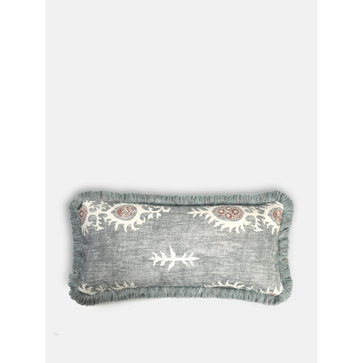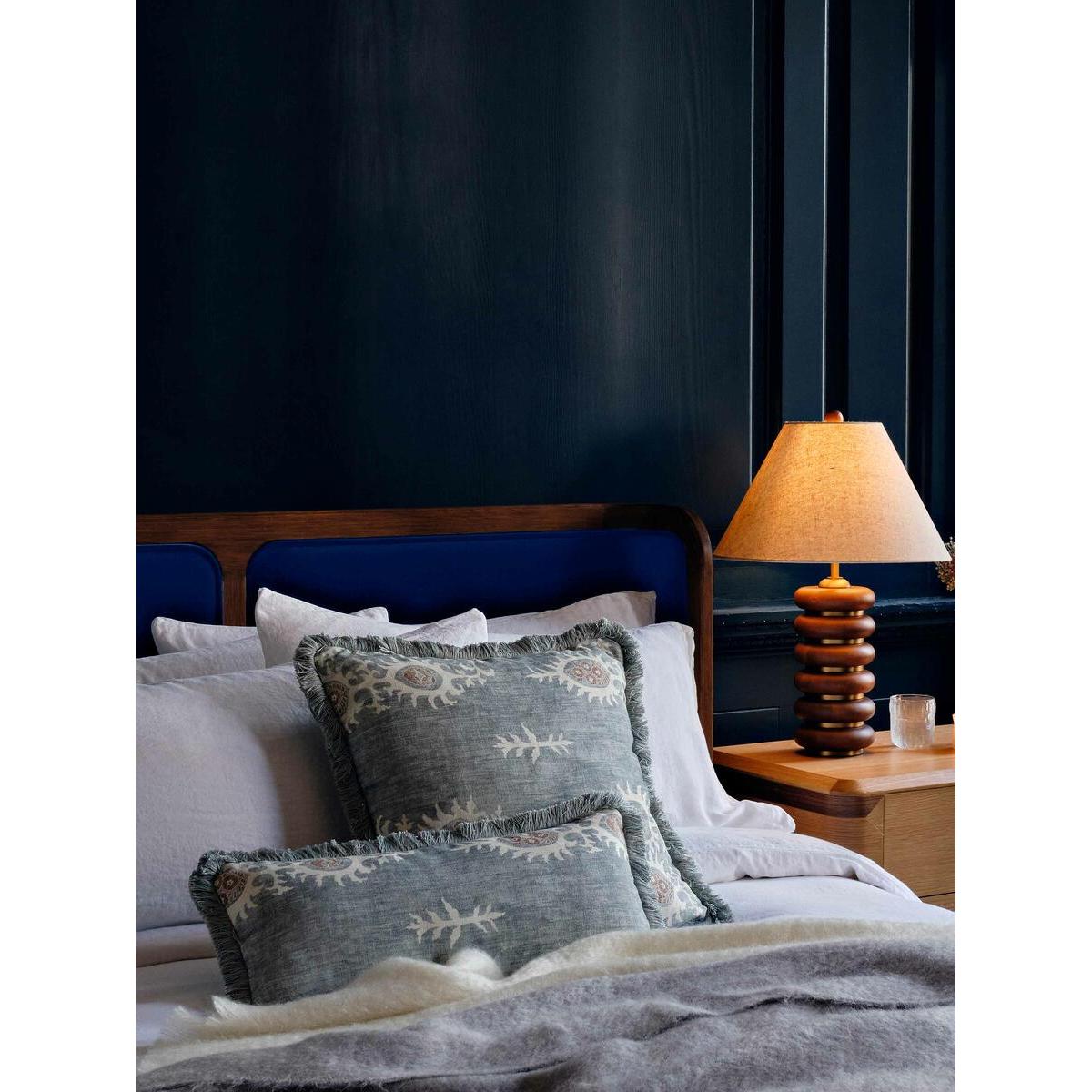 Our Archer cushions are covered in Lewis & Wood's 'Tribal'linen in monsoon blue - the very same fabric that you'll see on thechairs in Soho House 76 Dean Street. Each cushion is edged with abespoke eyelash fringe and filled with a feather pad for a firmfeel. Oblong cushion with printed patterned design. Covered in Lewis & Wood 'Tribal' linen in monsoon blue. Plain dye mulberry linen blend reverse. 100% feather pad. Made in England. Edged with bespoke tonal eyelash fringing. Fabric used on armchairs at Soho House 76 Dean Street.
