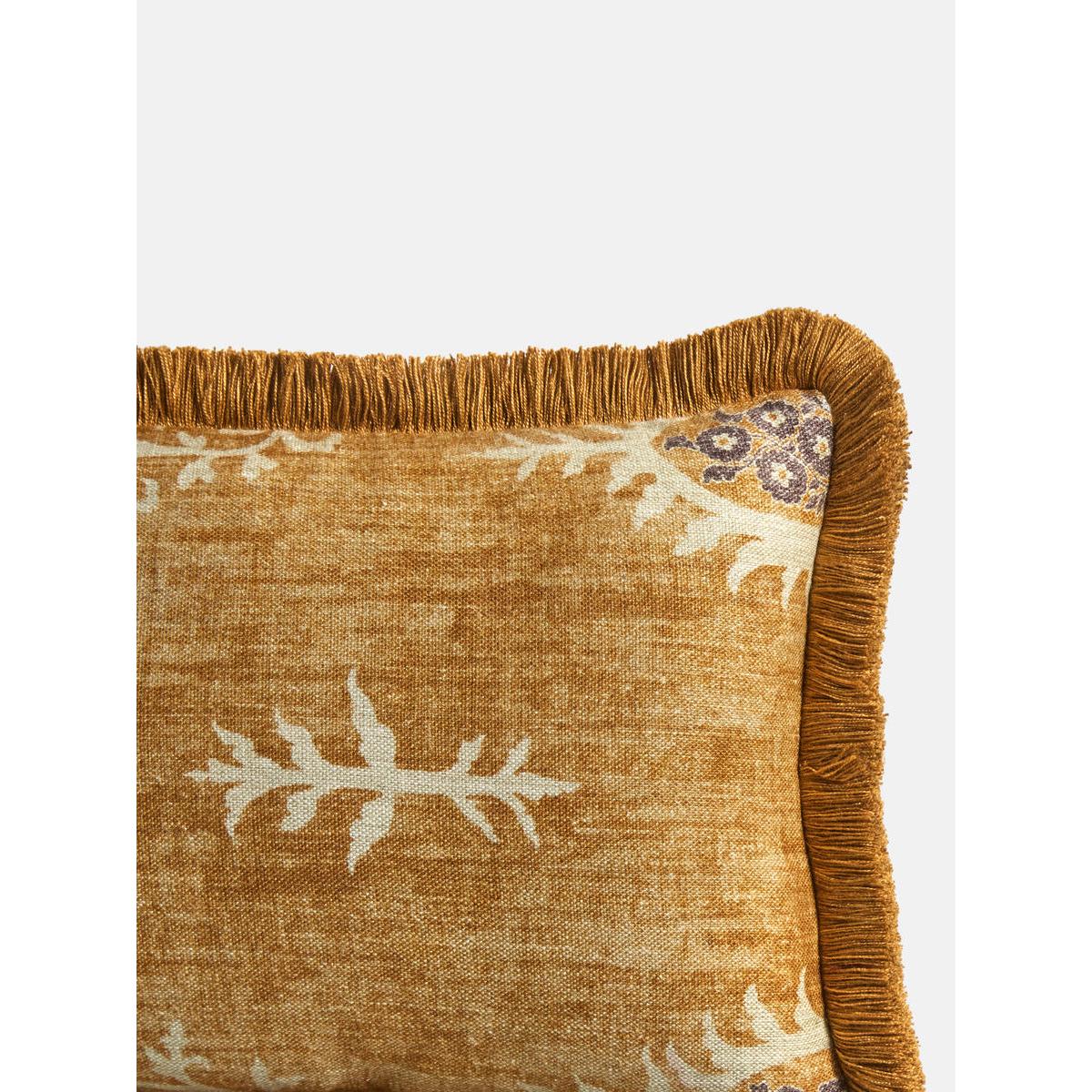 Our Archer cushions are covered in Lewis & Wood's 'Tribal'linen in kalahari sand - the very same fabric that you'll see onthe chairs in Soho House 76 Dean Street. Each cushion is edged witha bespoke eyelash fringe in gold and filled with a feather pad fora firm feel. Oblong cushion with printed patterned design. Covered in Lewis & Wood 'Tribal' linen in kalahari sand. Plain dye mulberry linen blend reverse. 100% feather pad. Made in England. Edged with bespoke gold tonal eyelash fringing. Fabric used on armchairs at Soho House 76 Dean Street.
