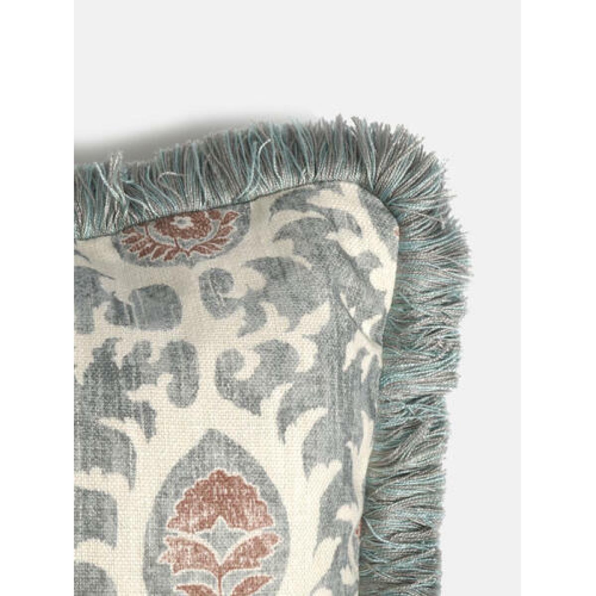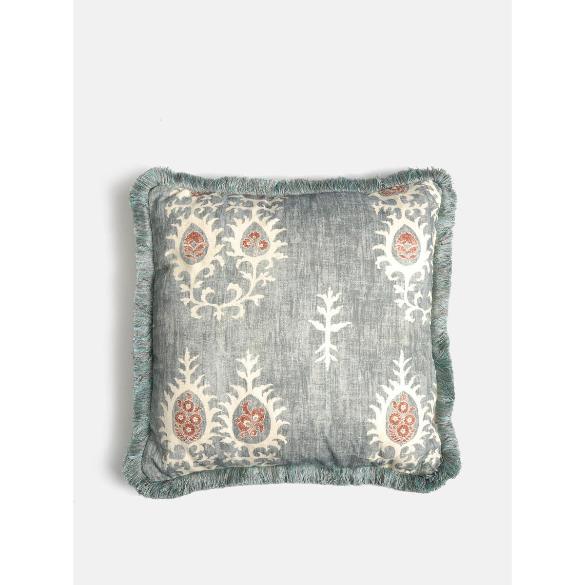 Our Archer cushions are covered in Lewis & Wood's 'Tribal'linen in monsoon blue - the very same fabric that you'll see on thechairs in Soho House 76 Dean Street. Each cushion is edged with abespoke eyelash fringe and filled with a feather pad for a firmfeel. Square cushion with printed patterned design. Covered in Lewis & Wood 'Tribal' linen in monsoon blue. Plain dye mulberry linen blend reverse. 100% feather pad. Made in England. Edged with bespoke tonal eyelash fringing.
