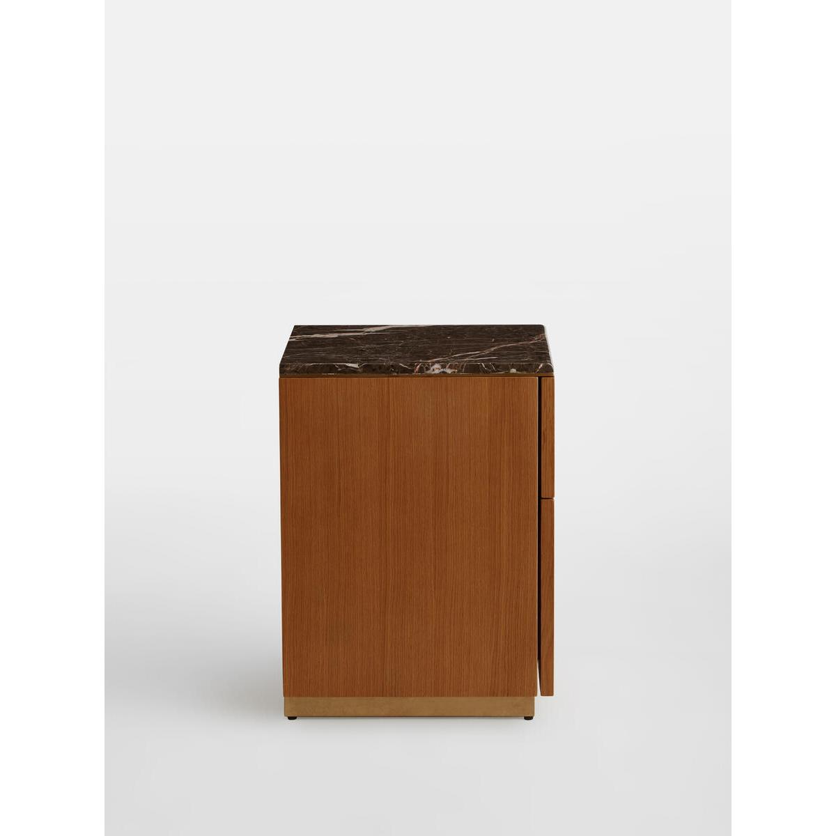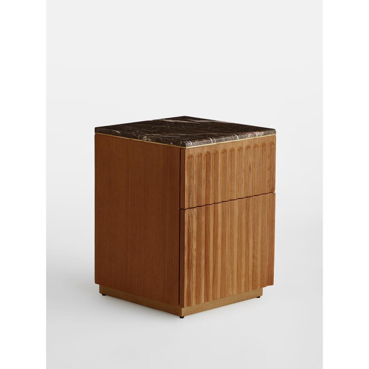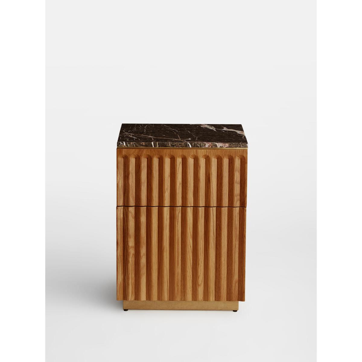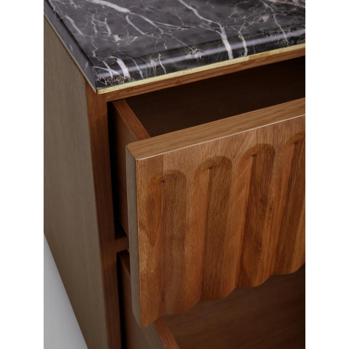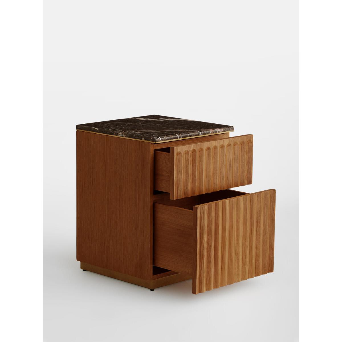 Refresh your bedroom space with the Arches bedside table, asseen in 76 Dean Street. Crafted from solid oak with a corrugatedsurround, the bedside table is complete with a grey honed-marbletop, featuring intricate veinings. Perch a lamp on top to bringlight to your relaxation space. Bedside table. Two drawers. Marble top. Solid-oak frame. Inspired by 76 Dean Street.