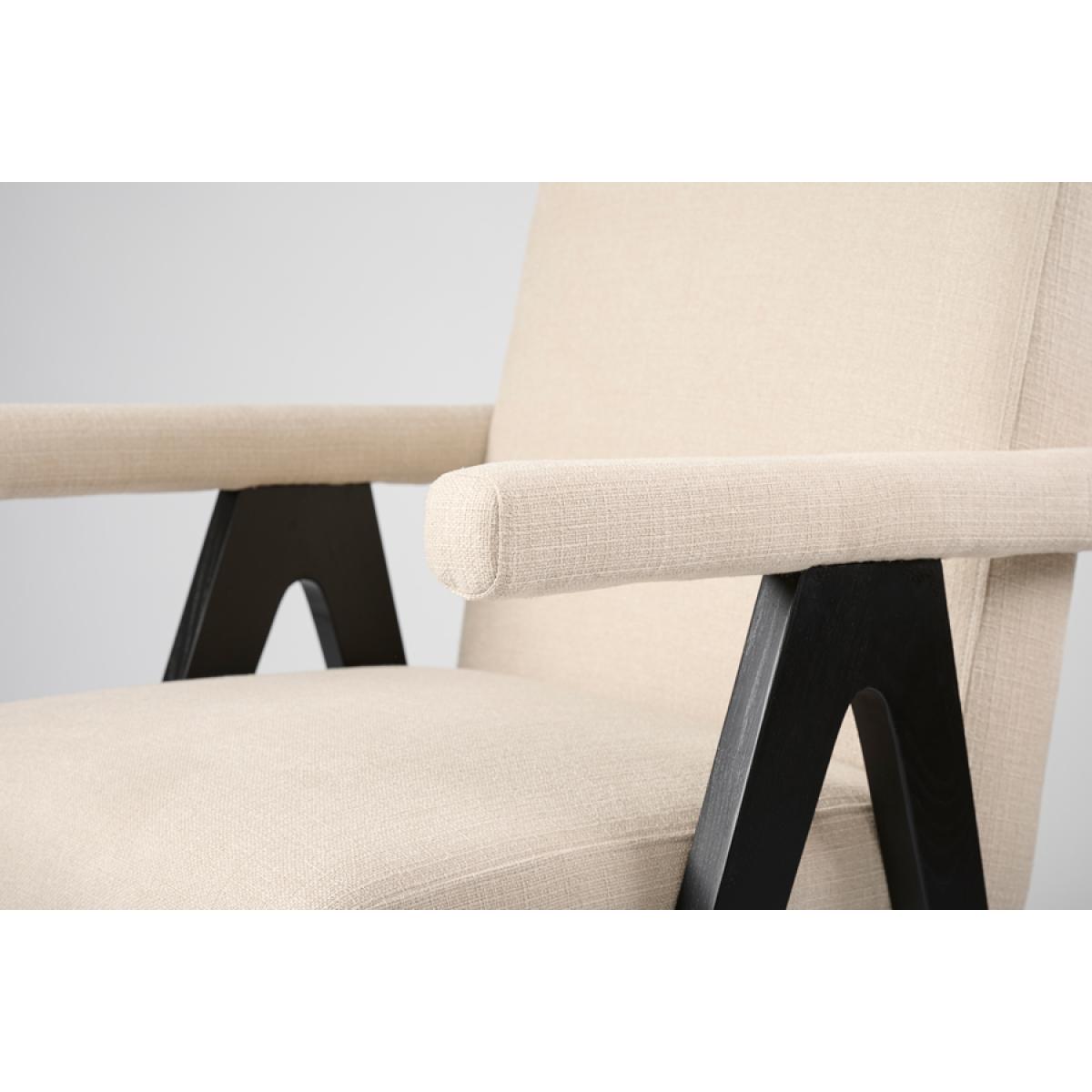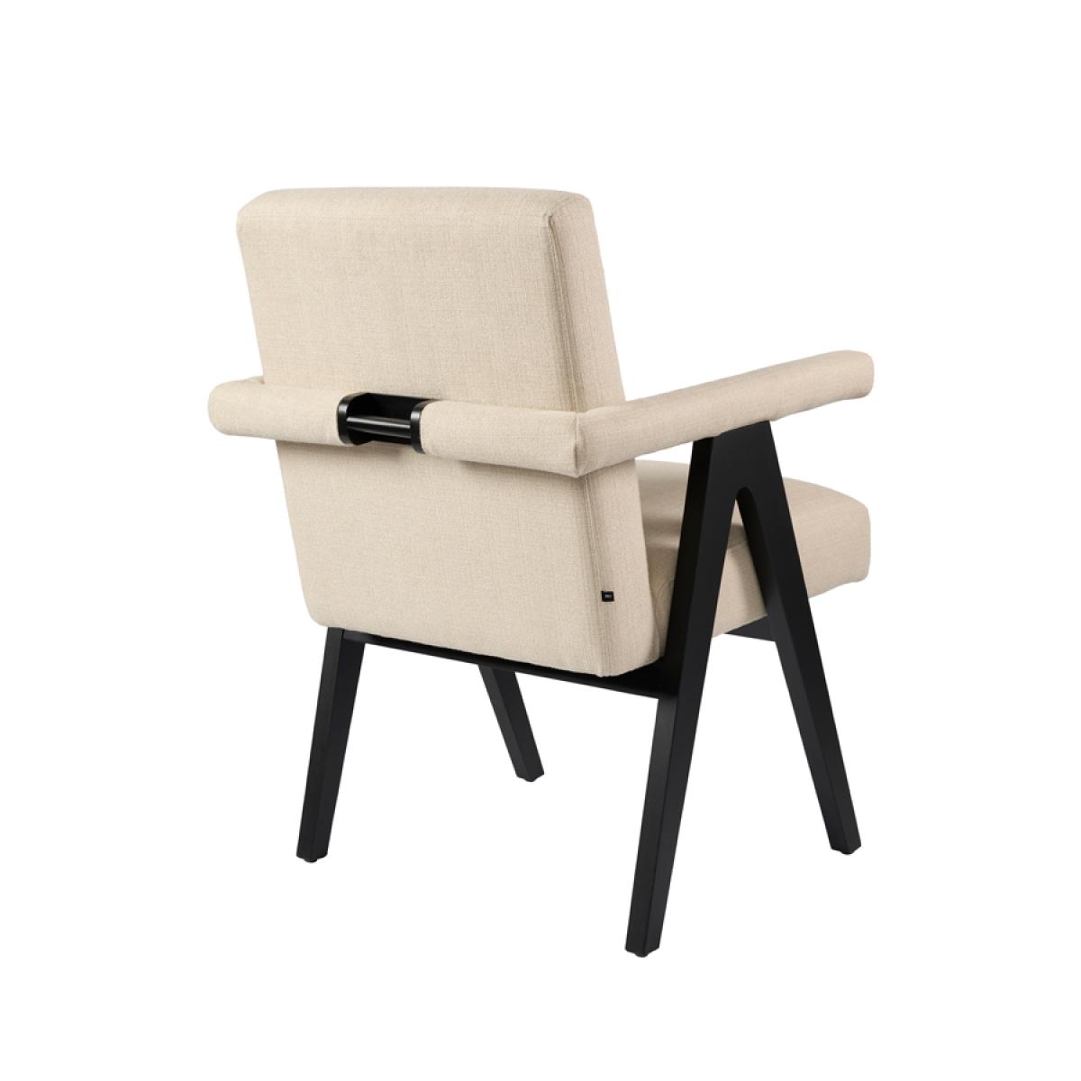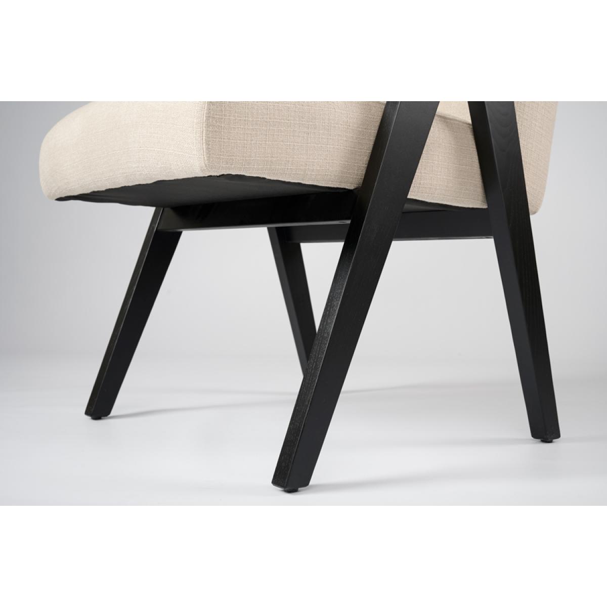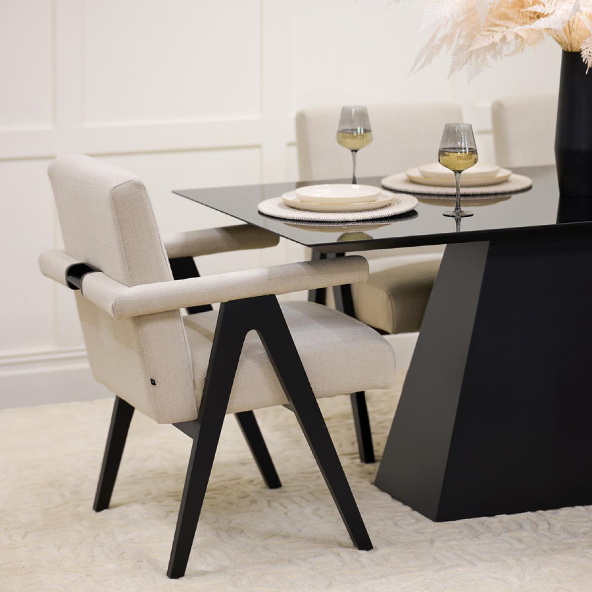 A striking contemporary dining chair with a distinctive graphic silhouette. Comfortable sprung seat and backrest with generous deep padding. Upholstered in practical and durable linen effect fabric with a soft, tactile feel. Solid ash wood with black satin finish stain. Wooden handle to the rear. Supplied fully assembled.