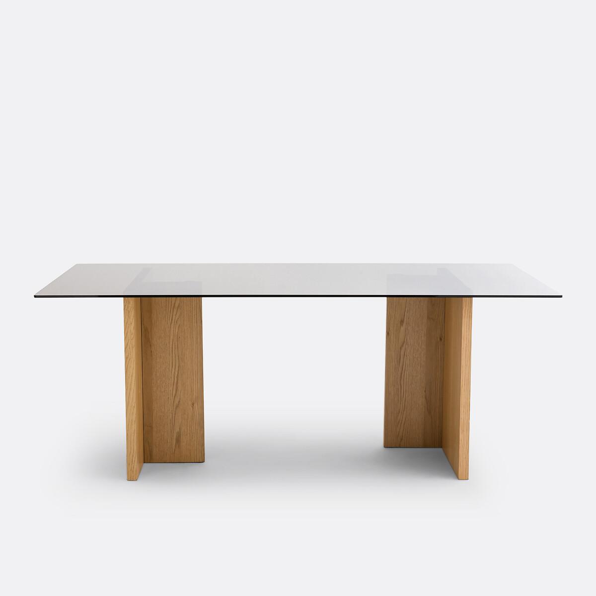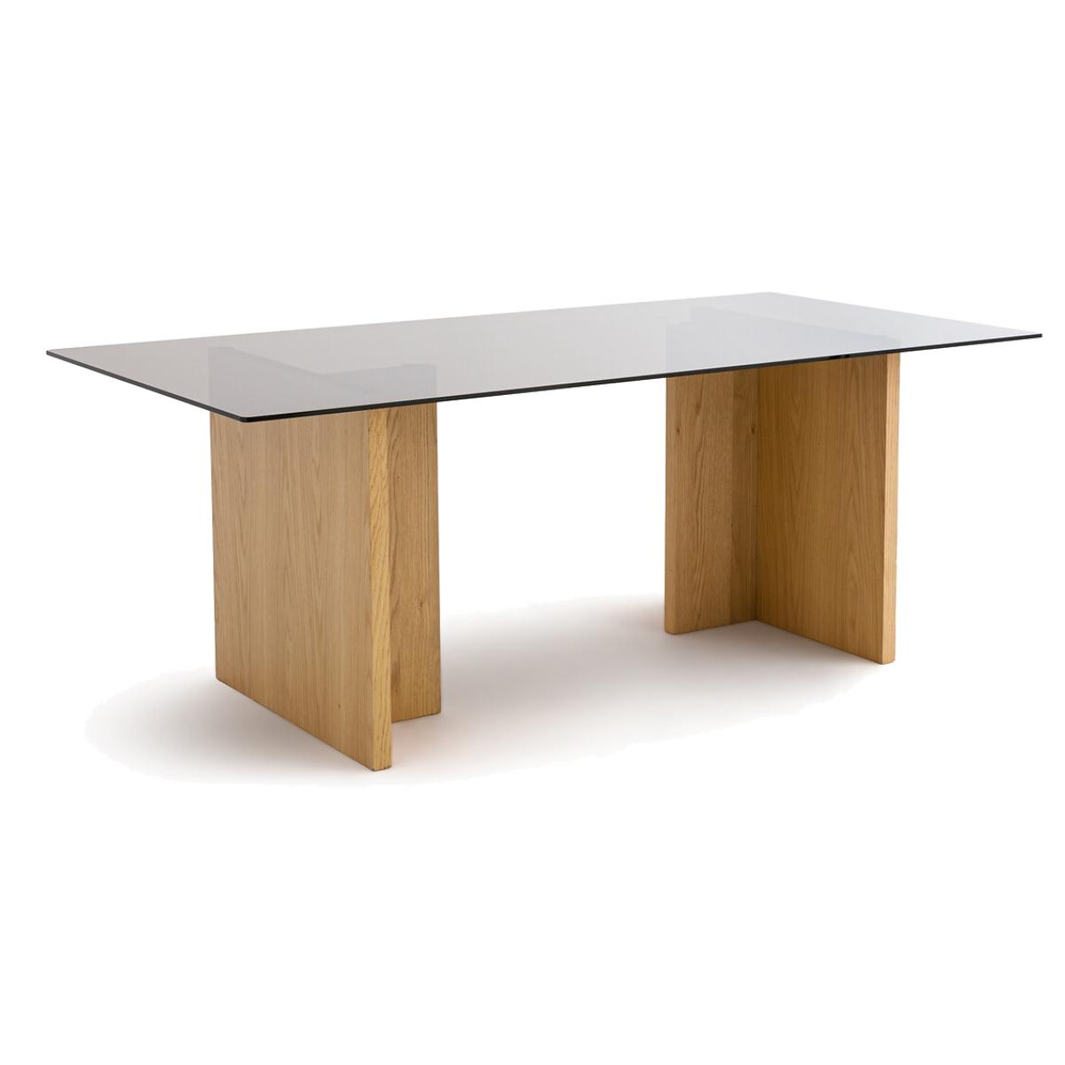 A smoked tempered glass top, sculptural FSC® oak veneered legs... With its straight lines and volumes inspired by Bauhaus, the Archita table puts design at the heart of the dining room. Created by La Redoute Interiors. Product Details • Smoked tempered glass top (thickness. 10mm) • Legs in FSC® oak veneered MDF with nitrocellulose varnish finish • Seats 6-8 people. Dimensions • Width: 200cm • Height: 75cm • Depth: 100cmDelivery:. Assembly required. Available for home delivery. Note! Please check that all access points are large enough to accommodate your delivery (doors, stairs, lifts). • WOOD FROM SUSTAINABLY MANAGED FORESTS. FSC® certified wood comes from forests that are environmentally, socially and economically well managed. Dimensions and weight of parcel:2 parcels • L89.5 x H18 x D88cm. 47kg • L214 x H9 x D113cm. 55.5kg