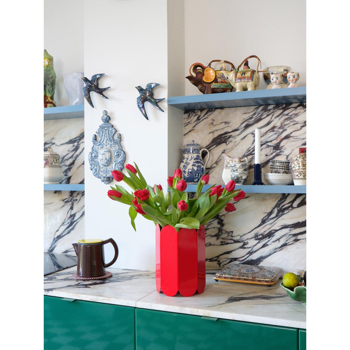 I really like this bold red vase - it’s an eye-catching piece that works well in modern and eclectic interiors. The rounded arches give it a sculptural quality, making it a statement on its own or a striking contrast when paired with neutral tones. I recommend using it as a standalone feature on a mantle, side table, or in a display with green foliage or minimalist flowers to let its colour and shape shine. It’s versatile enough to suit both contemporary spaces and more vibrant eclectic rooms, adding warmth and a pop of colour without overwhelming the overall decor. Just keep in mind that it’s quite a statement piece, so style sparingly around it to avoid visual clutter.