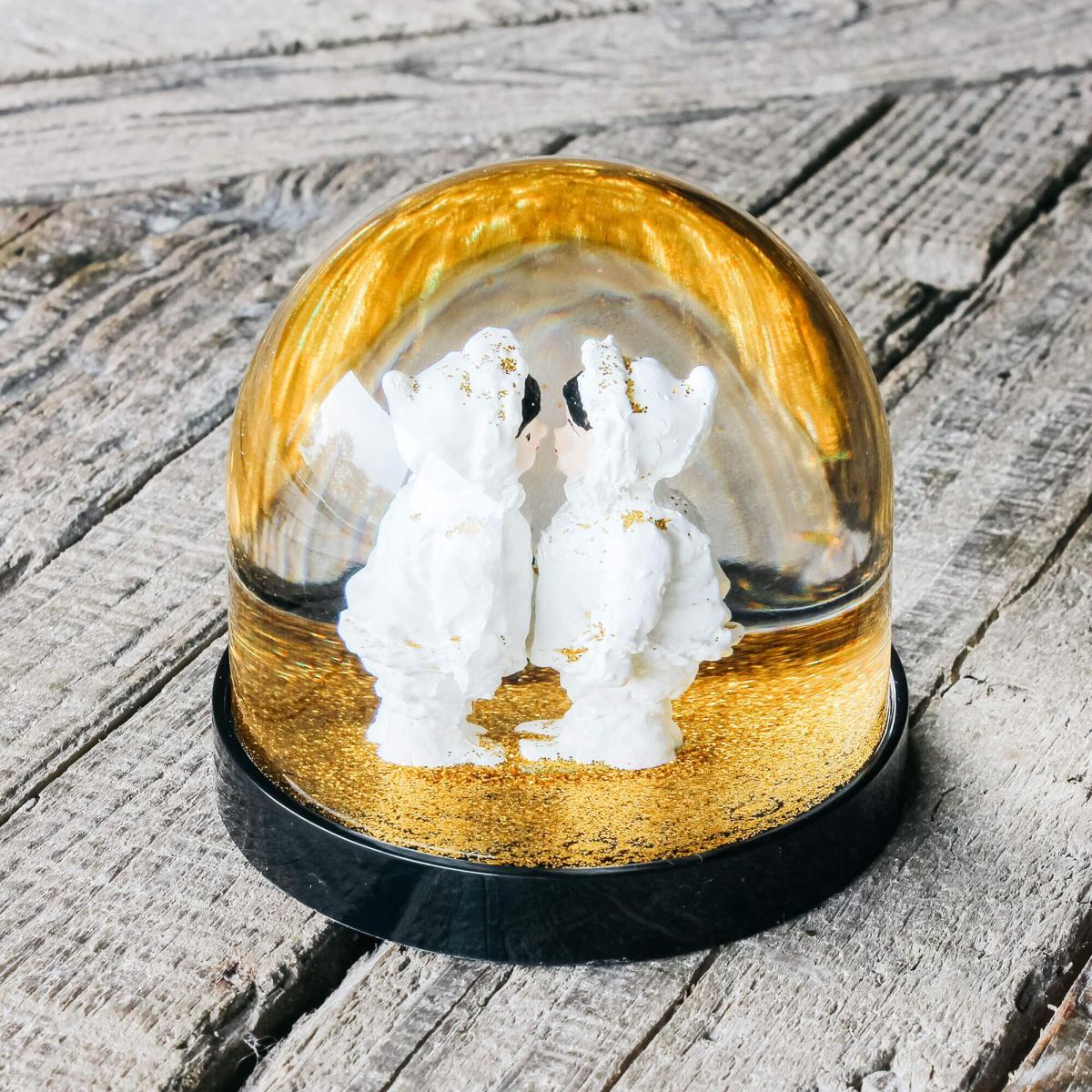 Two Arctic explorers kiss in the snow, shake this glitter globe to watch the snow fall around them.