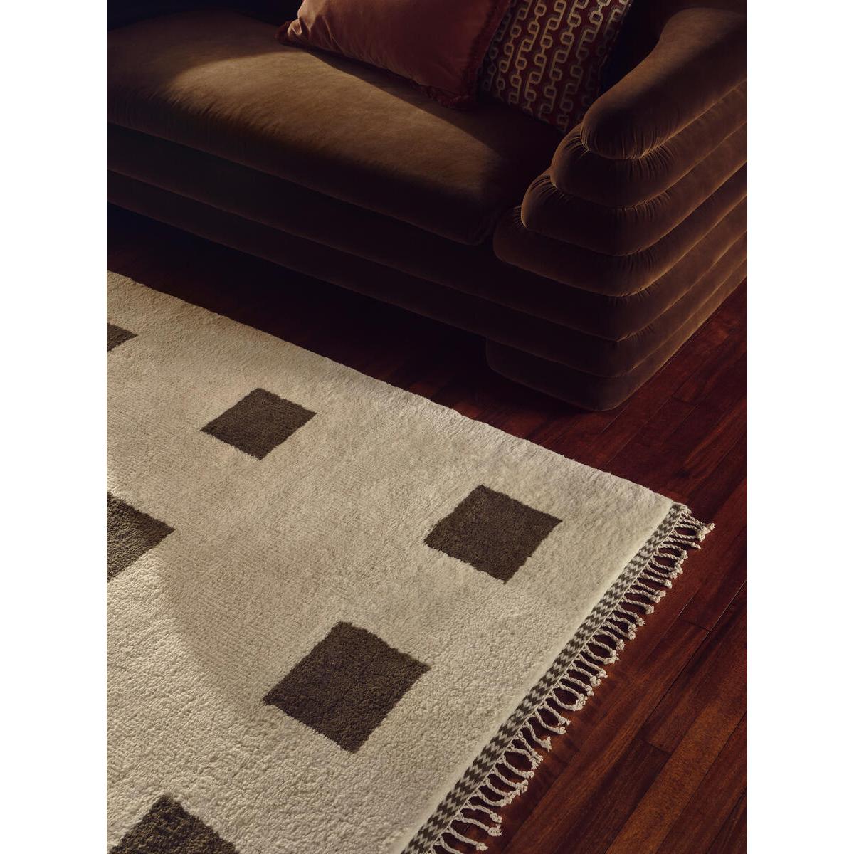 Our Arcus design is a nod to 1970s-era shag pile rugs. Hand-knotted by skilled artisans in India with 19 knots per square inch, it has a long New Zealand wool pile, which is warm and extremely soft underfoot, making it ideal for your first step out of bed or near the sofa. The repetitive square pattern takes influences from the architectural shapes and colour palette of Soho House Rome. Hand-knotted rug Nod to 1970s-era shag pile rugs 100% New Zealand wool long pile 19 knots per square inch Geometric olive square pattern Designed in-house Inspired by the architecture and colour palette of Soho House Rome