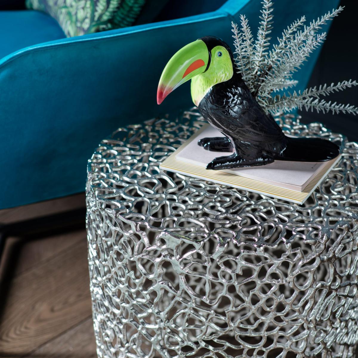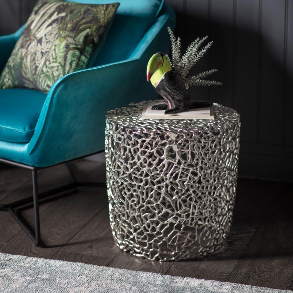 Add an unusual eye-catching design piece to a room with the Verdant Coffee table. The table is crafted from aluminium with a silver finish and intricate cut-out design, to give a light elegant feel. A matching side table is available as well as coordinating mirrors, and all are also offered in a gold finish.