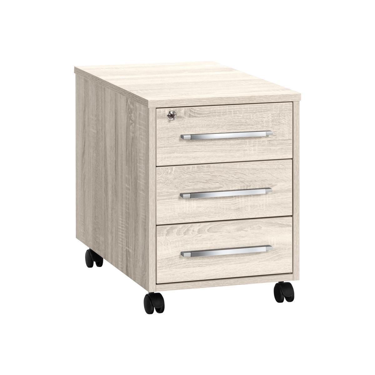 The Arden range is a modern, stylish solution for home working. There are desks, drawers, sideboards and cabinets, all highly affordable. Choose from a range of desk sizes, each with a light Sonoma oak-finish top. The desks are part of a modular system, with a four-drawer pedestal unit available to add either side, increasing the available work space, as well as storage. Also featured are high-gloss panels for the drawers and cupboards – available in a choice of colours – and metallic legs and handles. Each item is highly durable, and treated to protect against daily wear. *This is a self-assembly item*. This compact three-drawer unit is stylish and affordable, offering storage for folders and stationery. The Sonoma oak finish is complemented by high-gloss drawers. Why you’ll love it. Compact unit, adding more storage within a limited space. Sturdy, quality item. Sonoma oak-finish is scratch, stain and heat resistant. Choose either white or grey high-gloss drawers, featuring chrome-effect handles. Wood is FSC-certified. Lockable drawers for added security. What you need to know. Melamine safeguards against scratches, stains and heat damage. Edges are laminated for increased durability. Shop the Arden home office range for matching desks and storage.