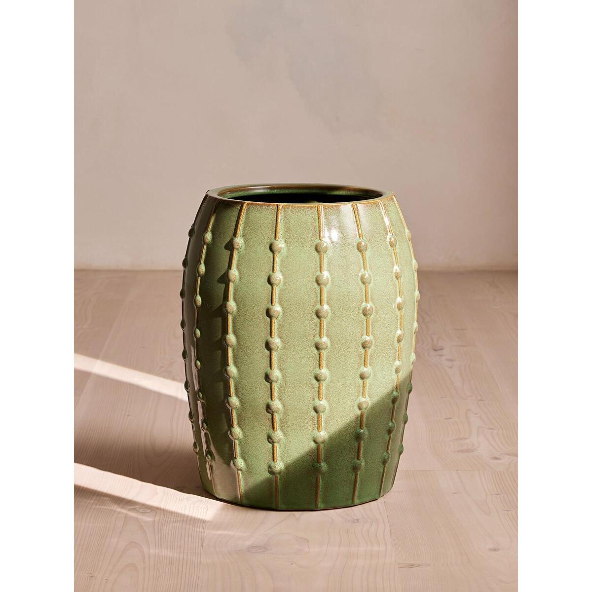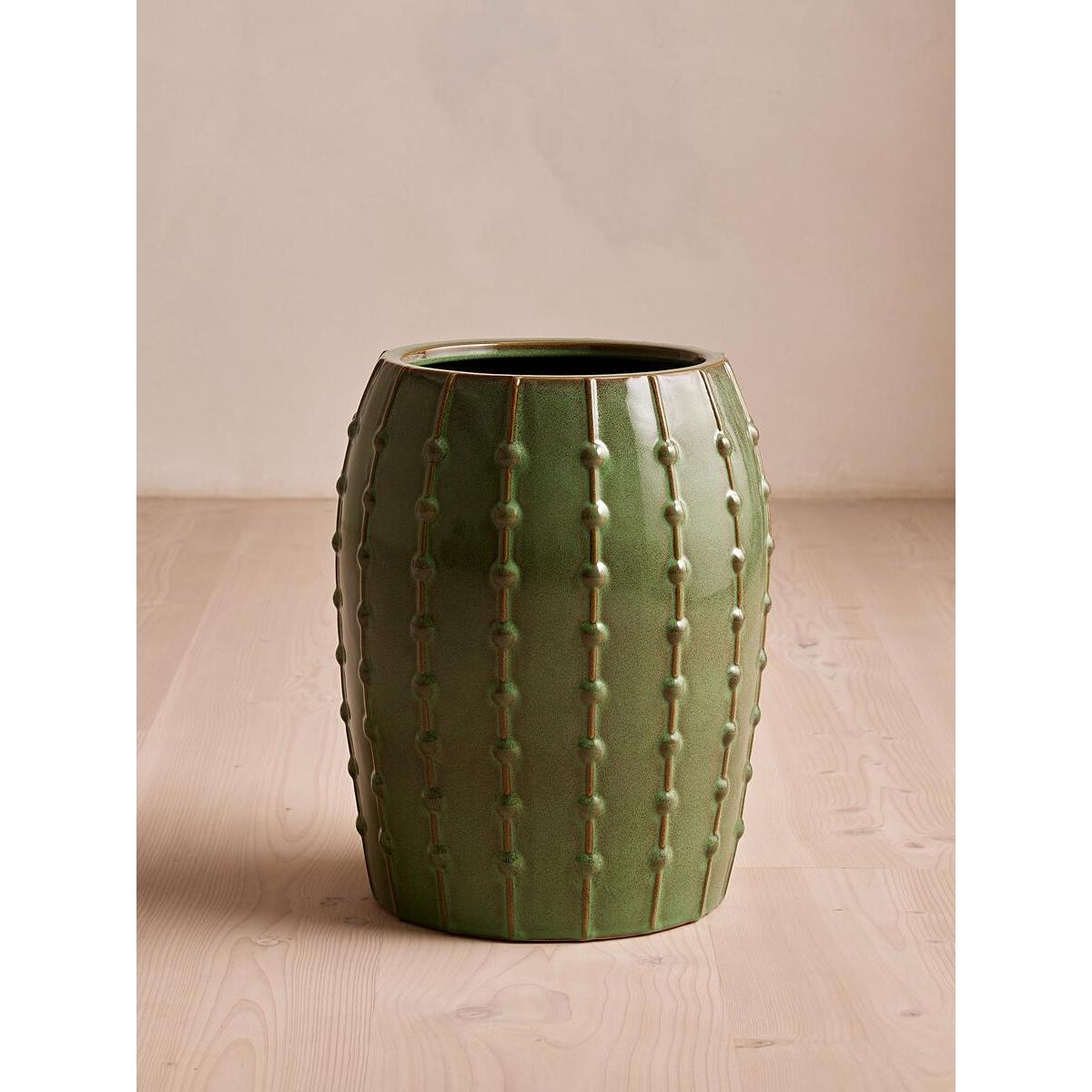I love this large green pot for its bold, contemporary shape and tactile detailing, which adds visual interest without overwhelming the space. It works particularly well in minimalist or modern interiors, where its colour can be a striking colour pop, or in a more eclectic setting that benefits from a statement piece. Practical styling tips include pairing it with trailing plants like pothos or philodendrons to emphasise its vertical grooves, or using it as a standalone statement on a neutral sideboard or corner. Its sizeable stature makes it suitable for larger plants, allowing for a lush, impactful display that can elevate the overall interior aesthetic.