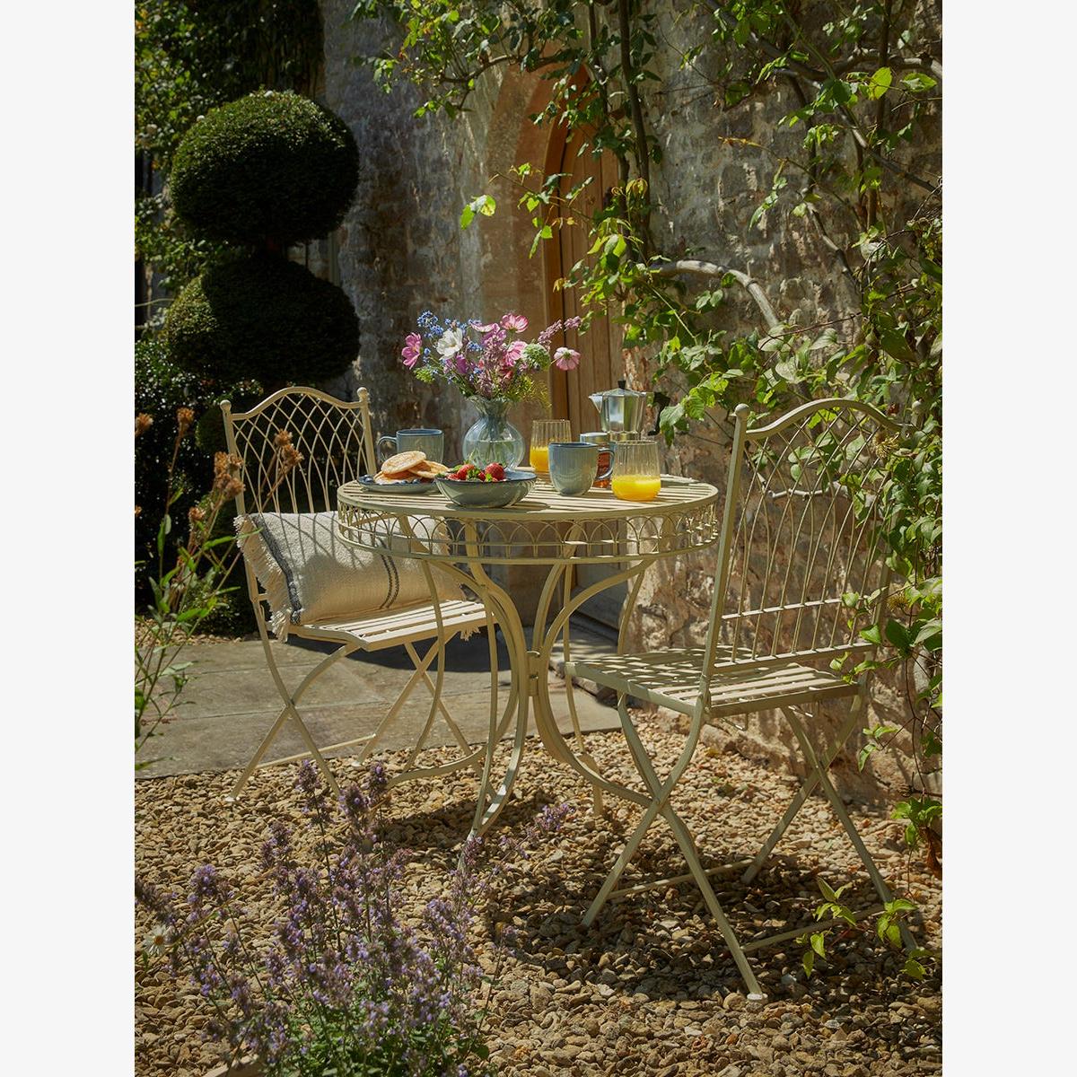 For an English country escape, our Adrenne Bistro Set is made from metal with a rustic paint finish, perfect creating a vintage style garden scape. With two chairs and a table, this bistro set fits in a small corner of your garden for an intimate set up, or on a balcony for a little corner of heaven.
