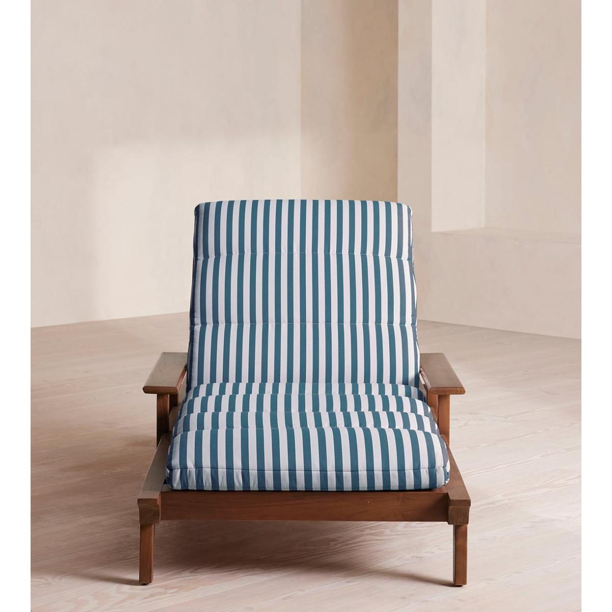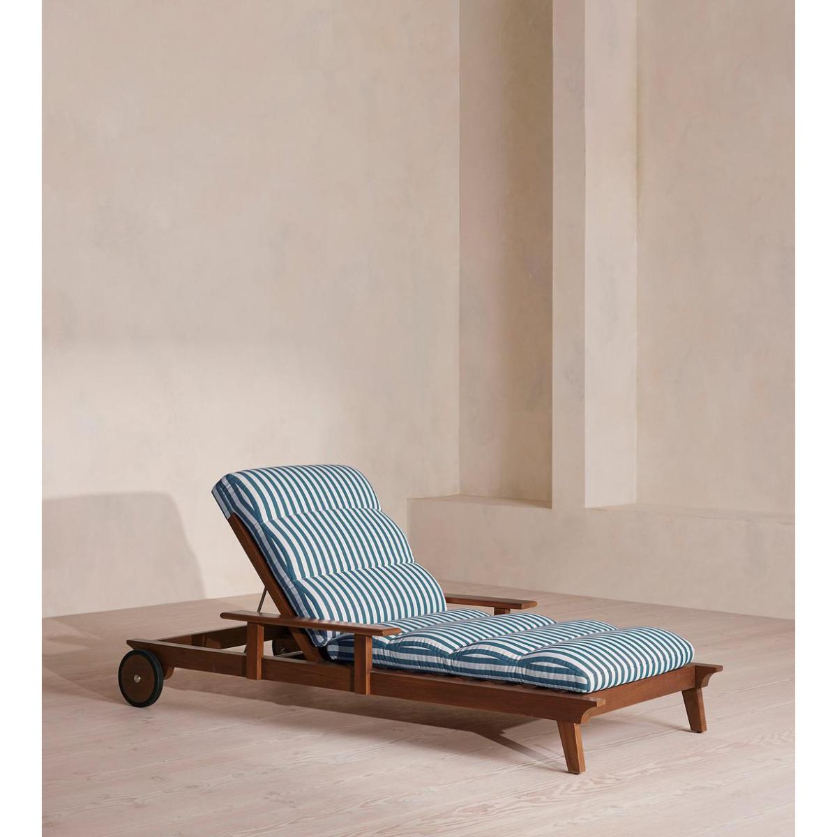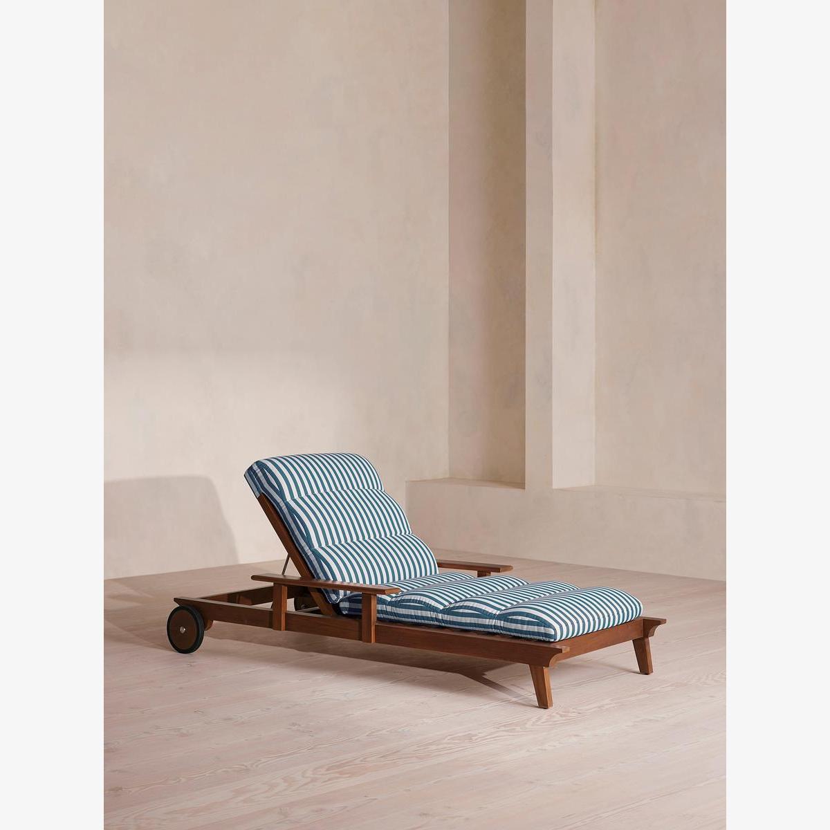 An adjustable frame is crafted from dark-stained teak wood and fitted with a cushion in our Soho Beach House Miami stripe. Designed for outdoor use, the Ardingly lounger is crafted from teak wood with a darkened stain. Built with an adjustable backrest that can be switched between angled or fully horizontal, its frame is fitted with a cushion upholstered in an outdoor-safe, blue and white striped fabric.