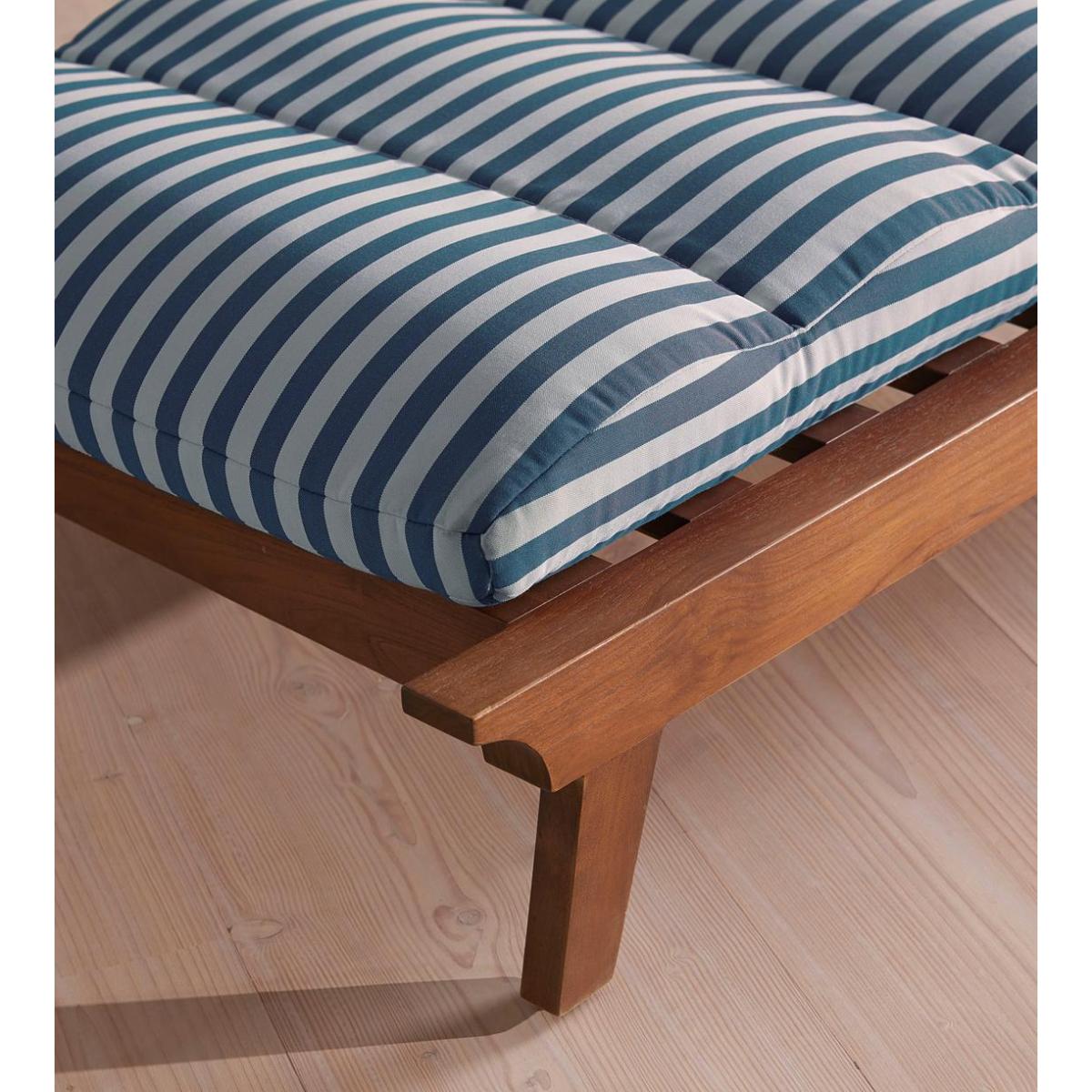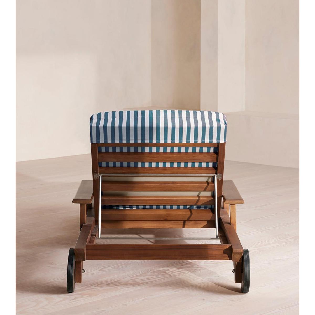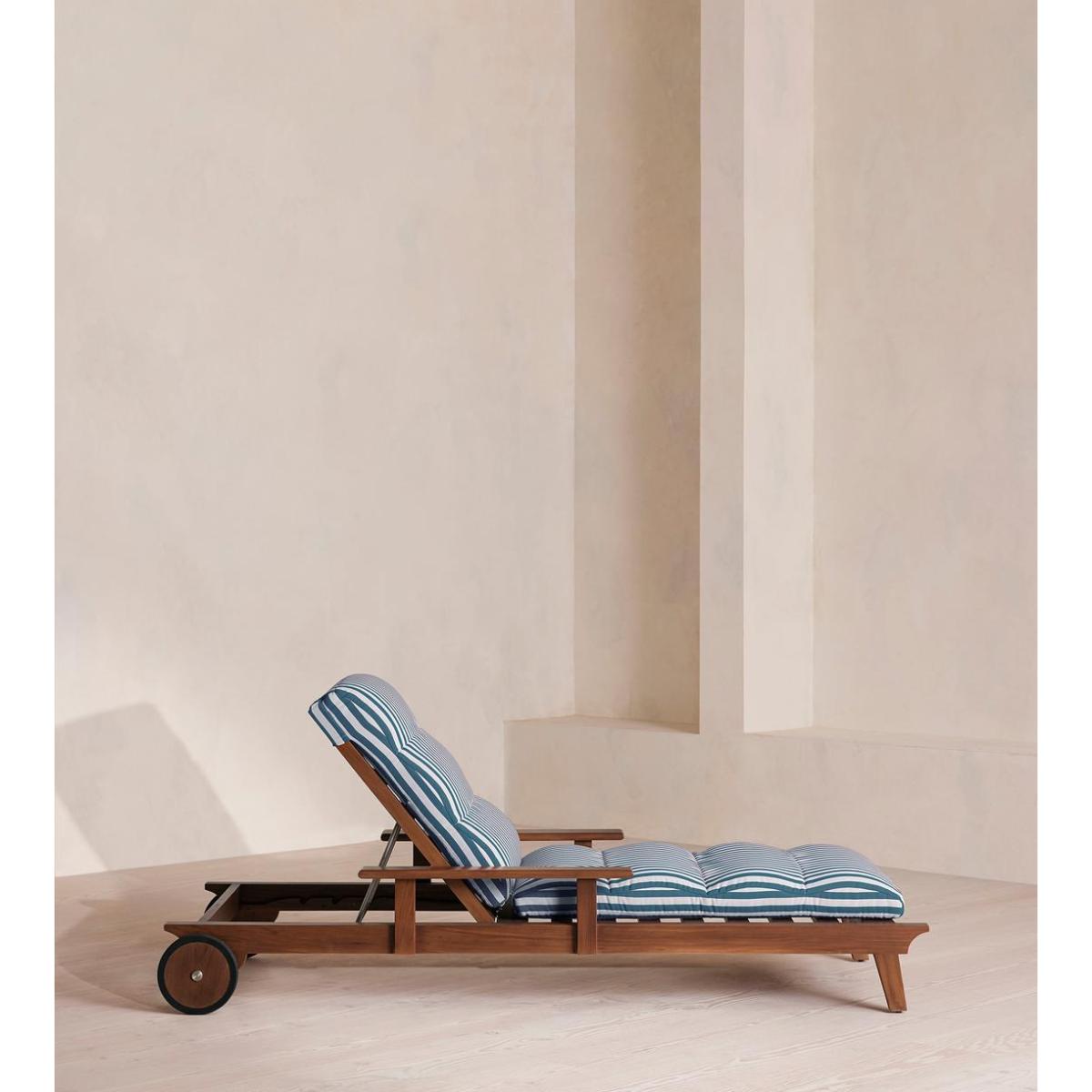 An adjustable frame is crafted from dark-stained teak wood and fitted with a cushion in our Soho Beach House Miami stripe. Designed for outdoor use, the Ardingly lounger is crafted from teak wood with a darkened stain. Built with an adjustable backrest that can be switched between angled or fully horizontal, its frame is fitted with a cushion upholstered in an outdoor-safe, blue and white striped fabric.